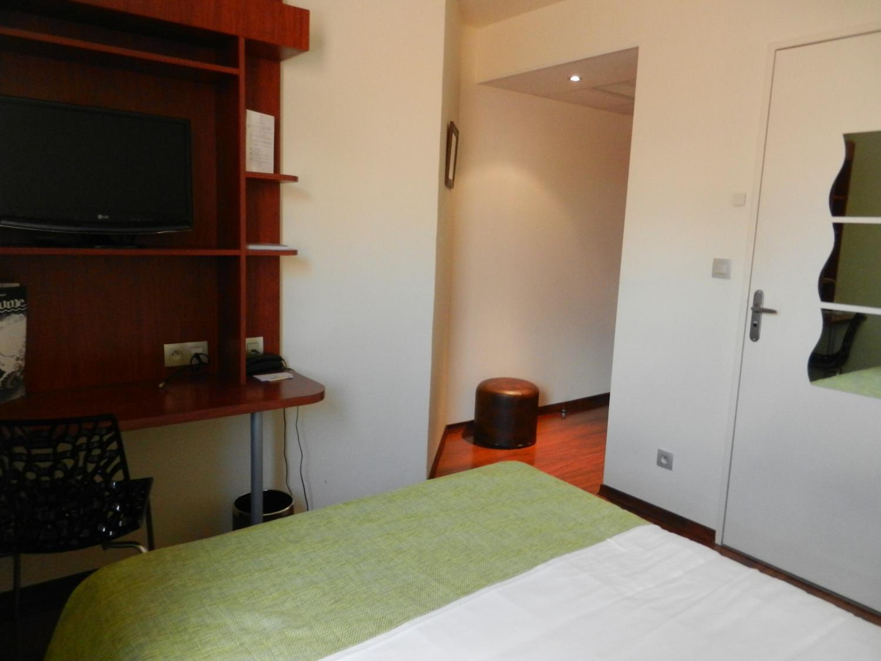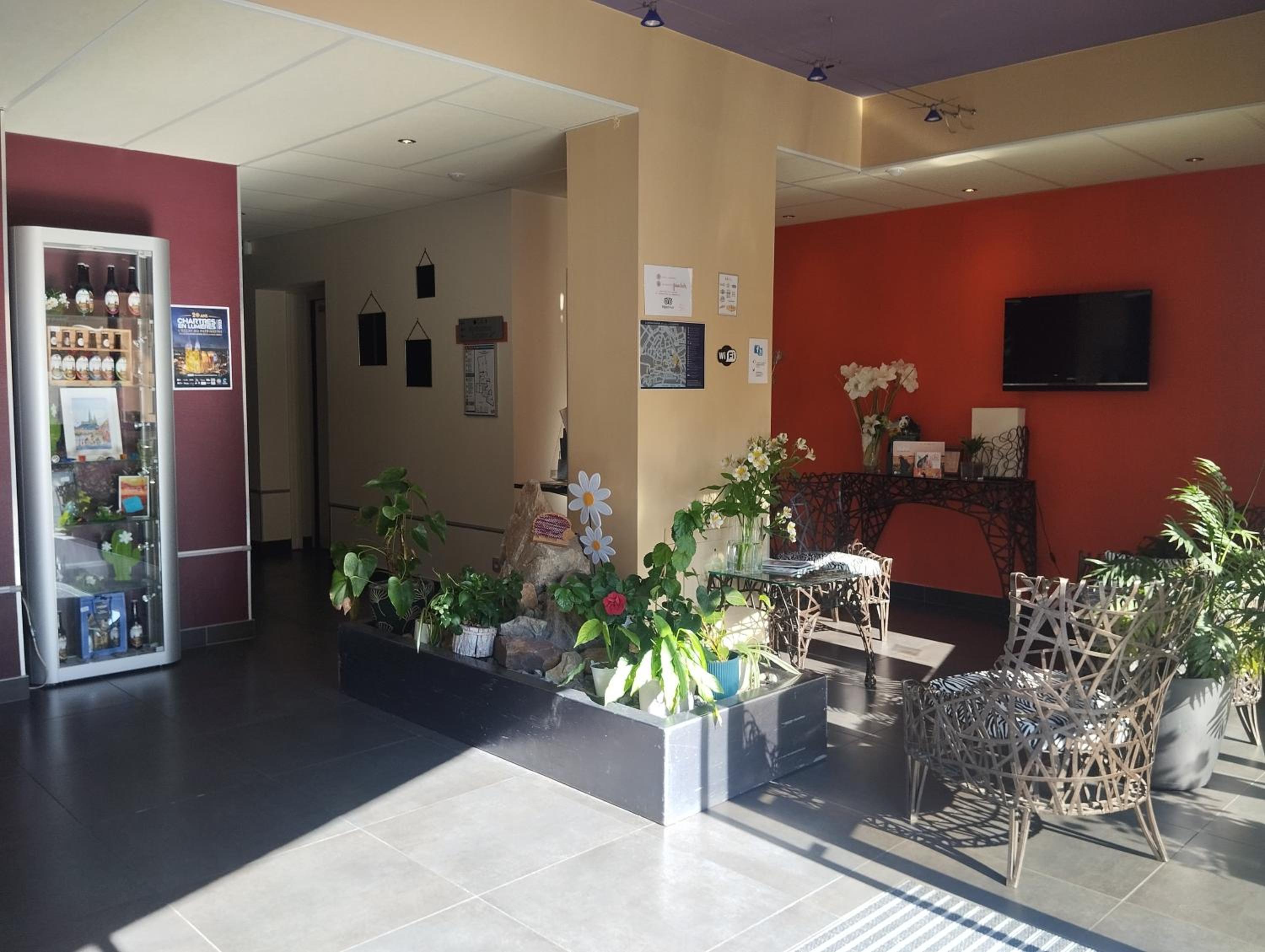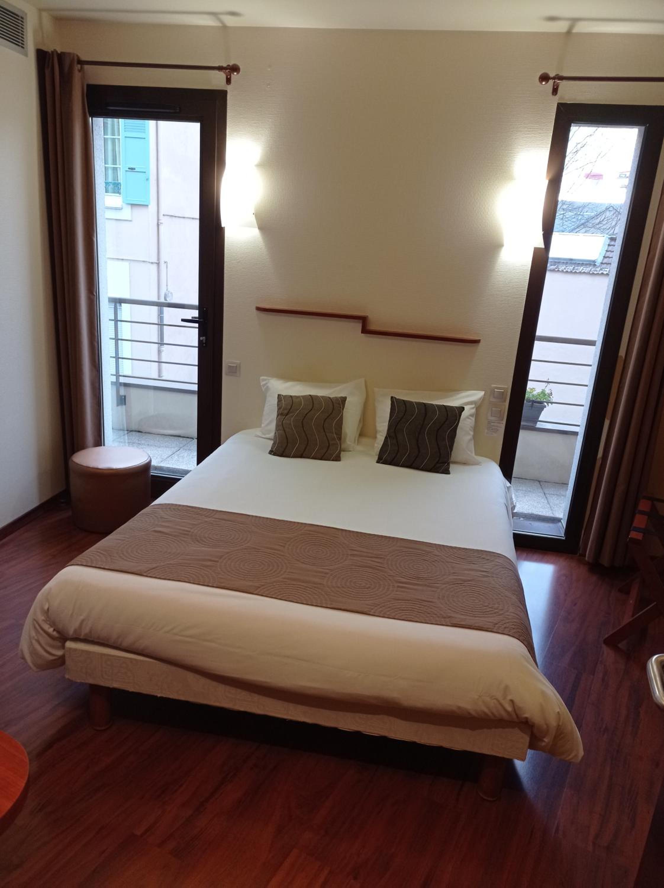 La habitación era amplia y cómoda. Las dos camas eran muy cómodas (viajabamos con mi hijo). El hotel es muy centrico. Se puede ir caminando des de allí a cualquier parte de Chartres. Tambien hay una estación de tranvia cerca. Habia recepción de 15:00 a 21:00 y luego para entrar te dan un código. Tiene ascensor, aire acondicionado