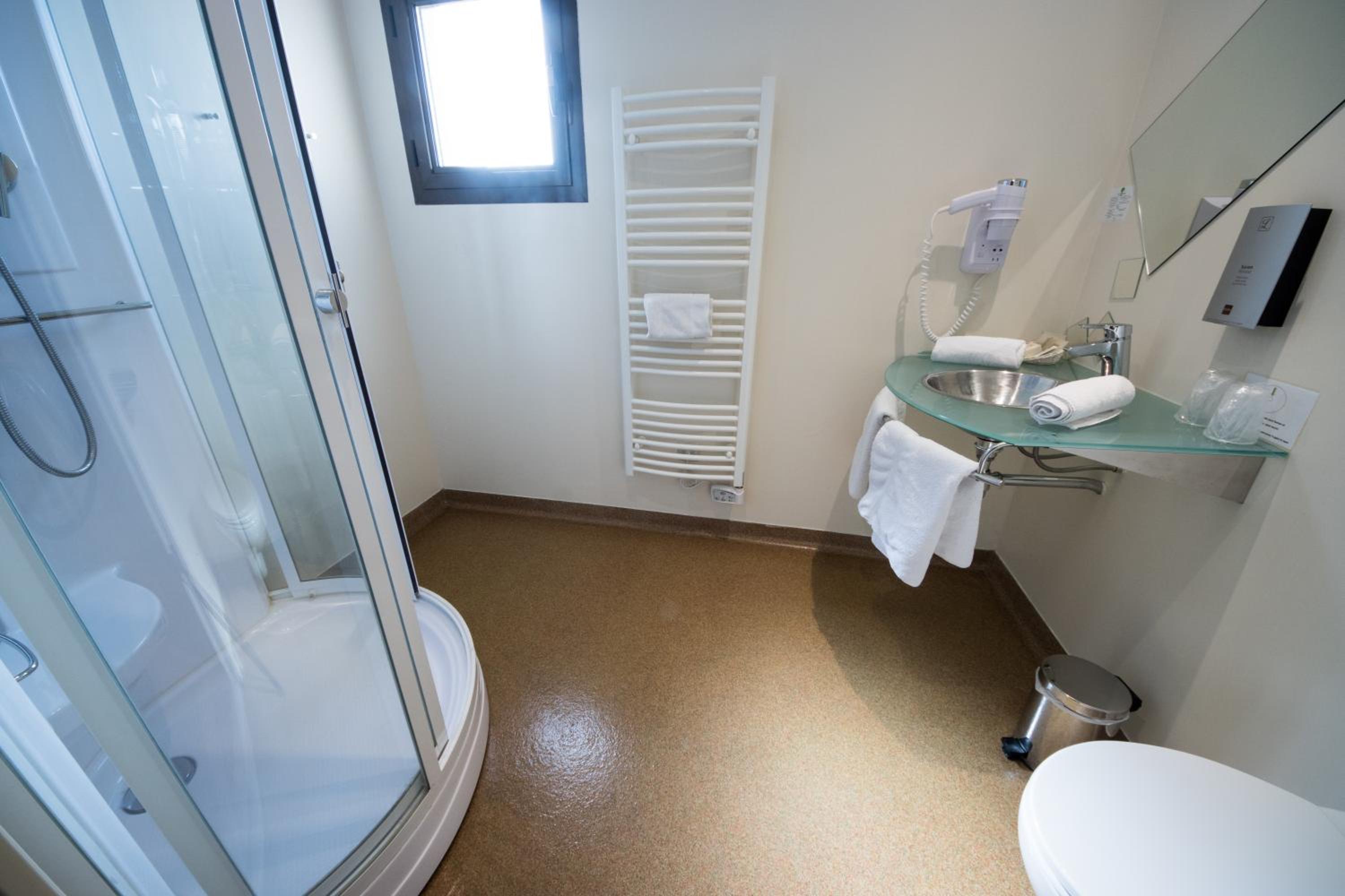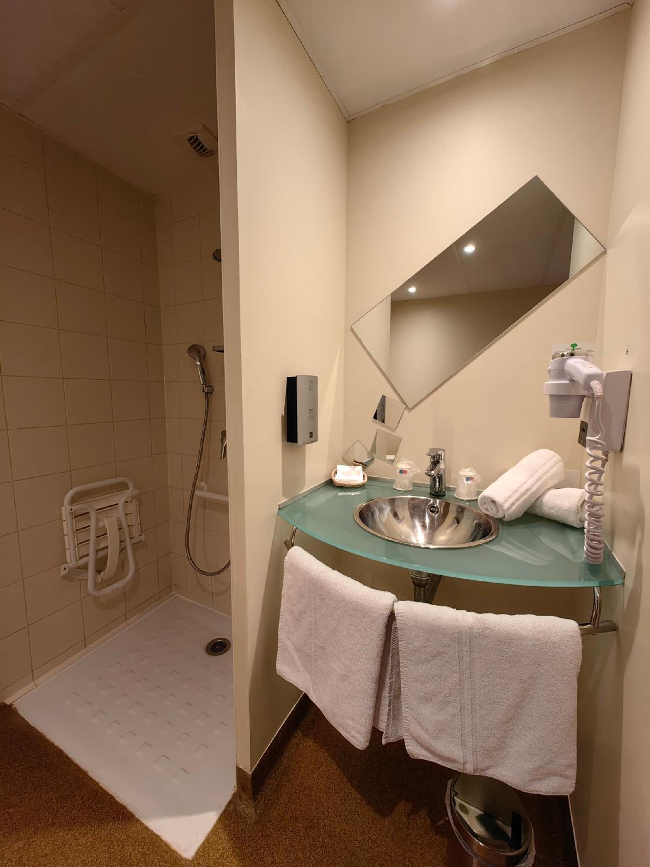 Pas de rideau de douche, ou autre la salle de bain est vite inondée si on n'y prends pas garde. Risque de glissade surtout pour une chambre pour personnes a mobilité réduite.