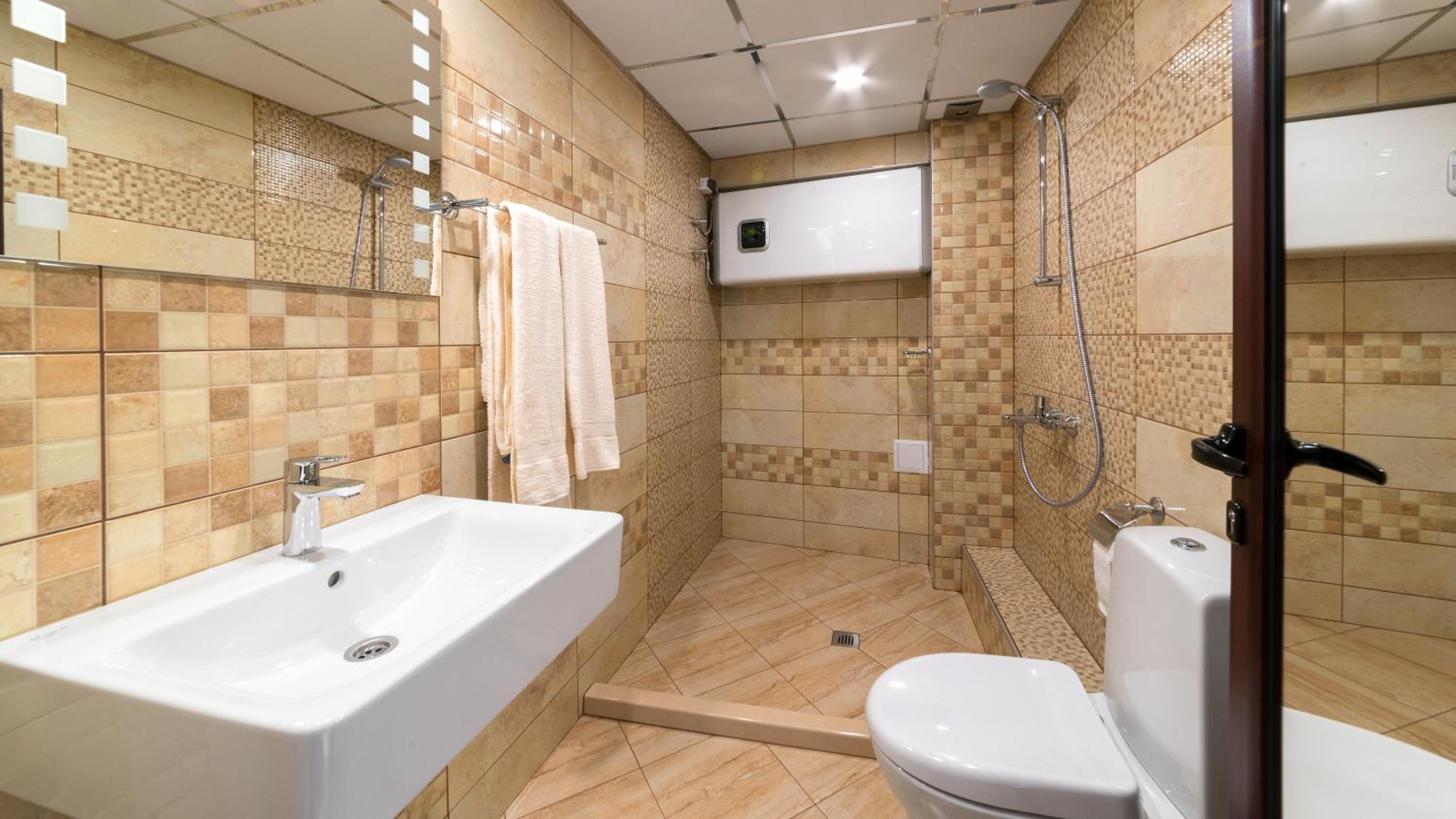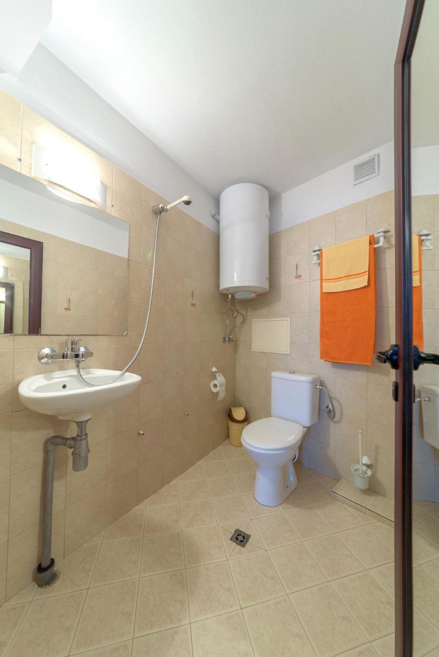 Baia, nu are cabina de dus, te speli cu dusul în mijlocul băii.