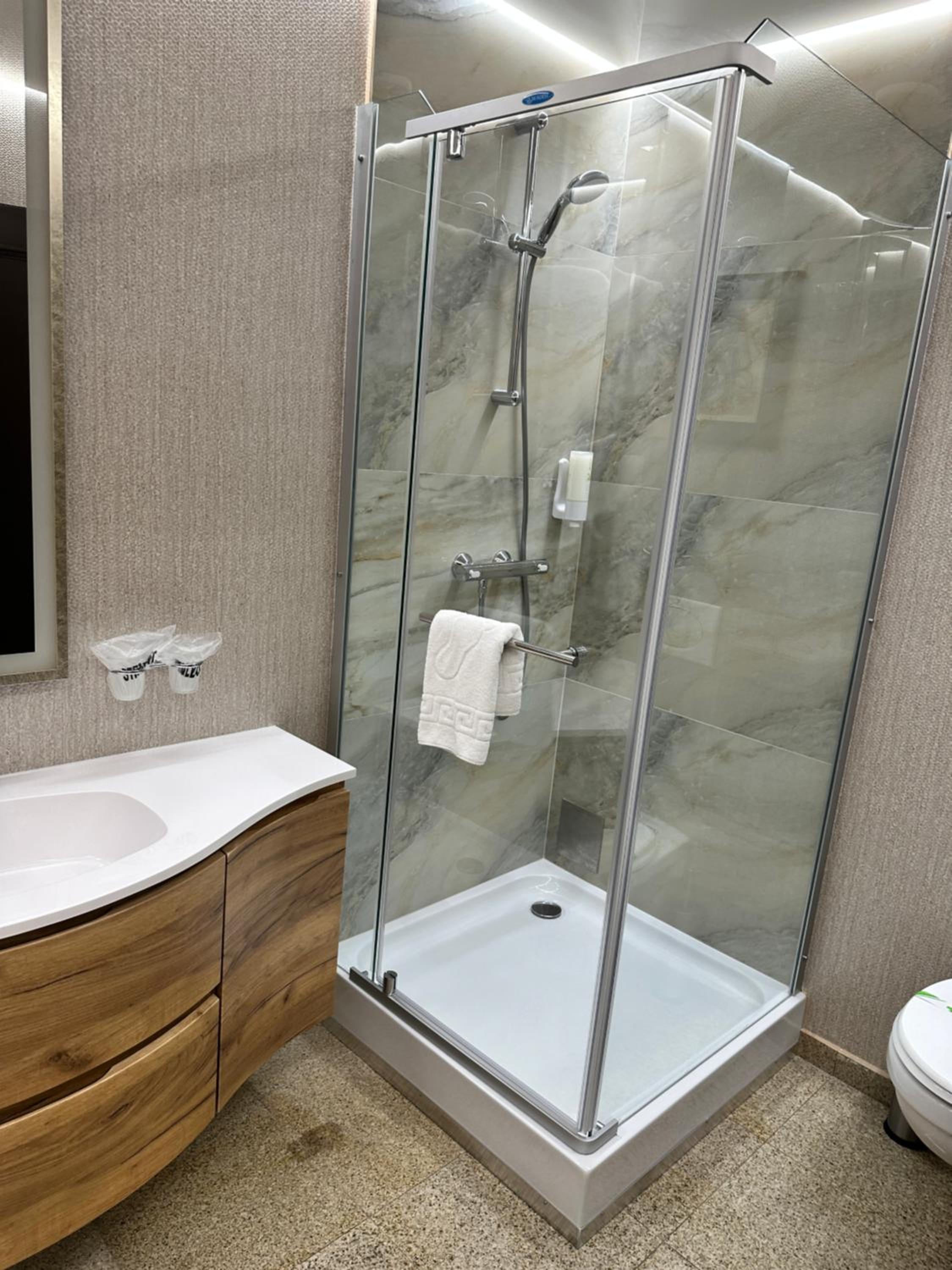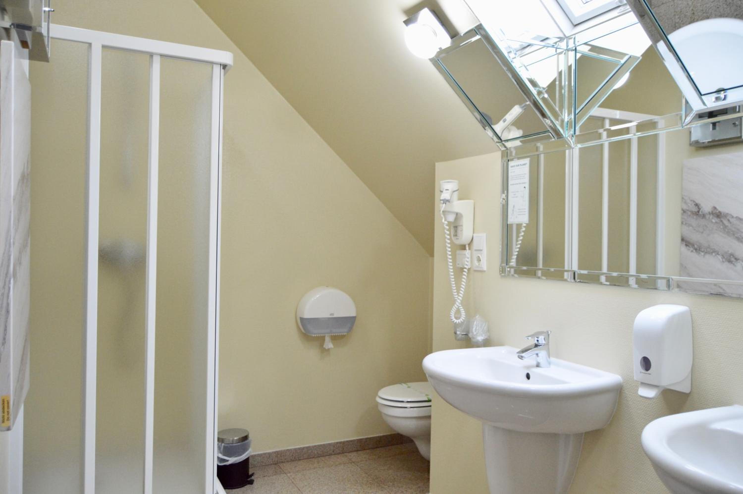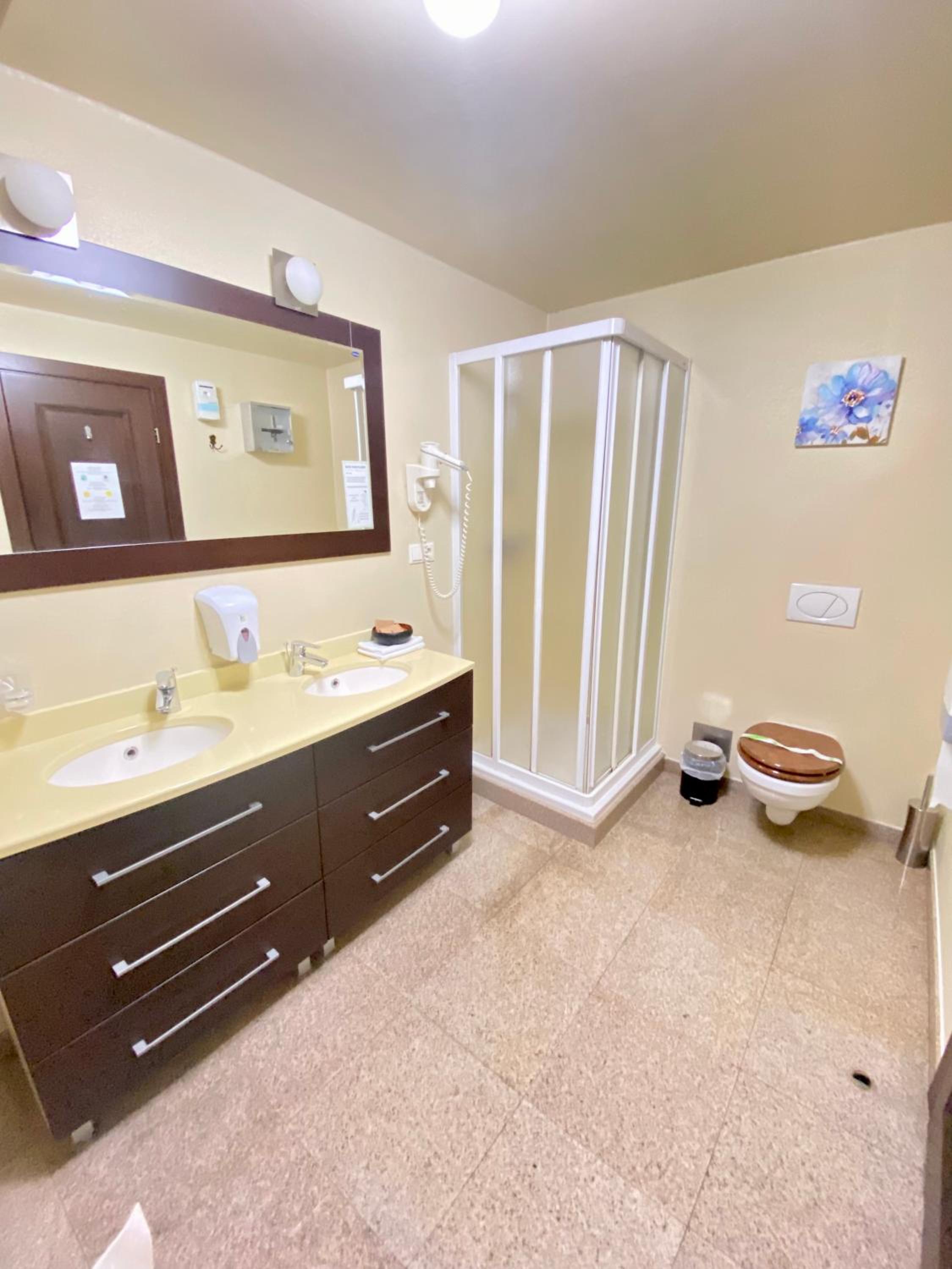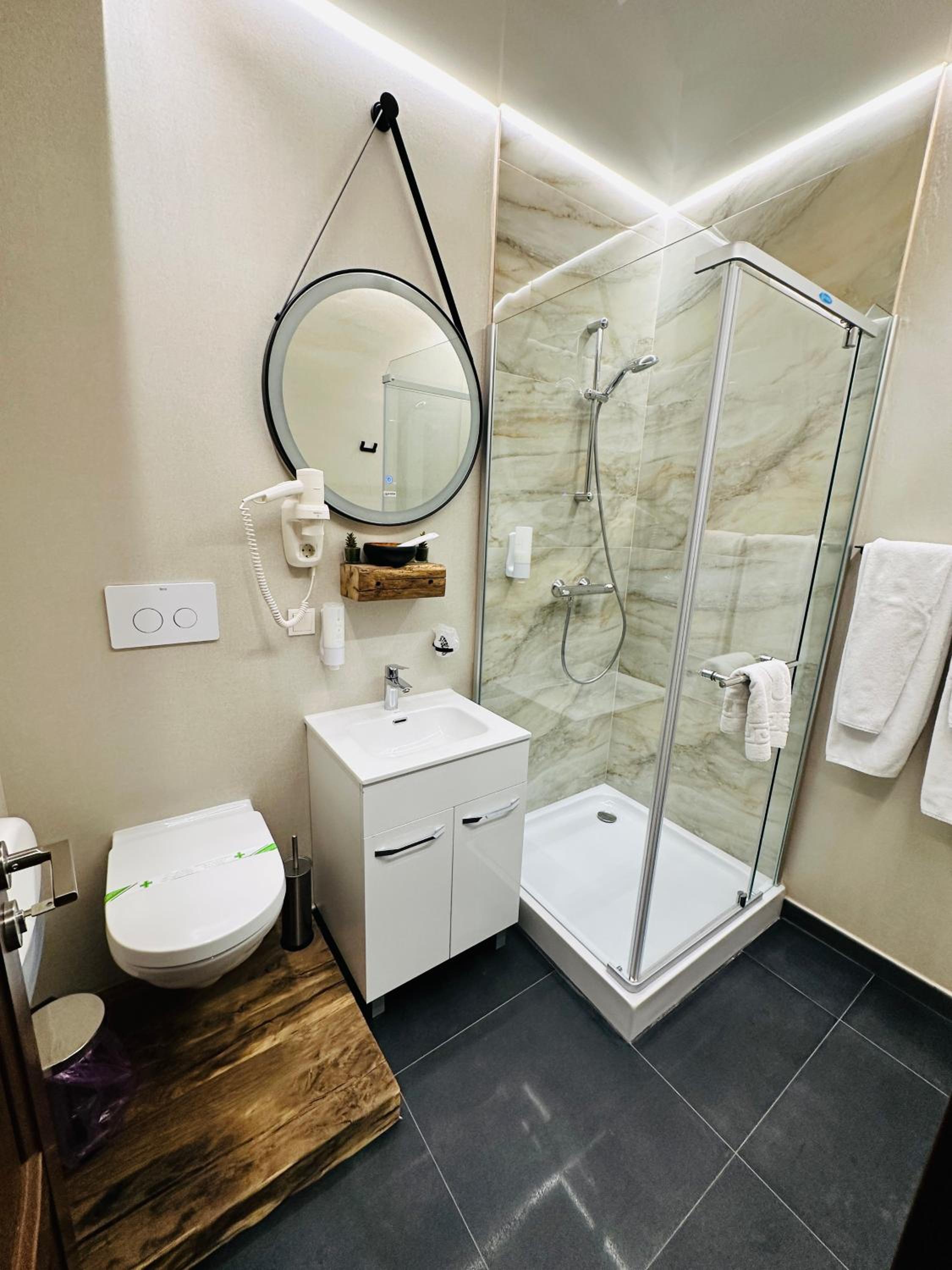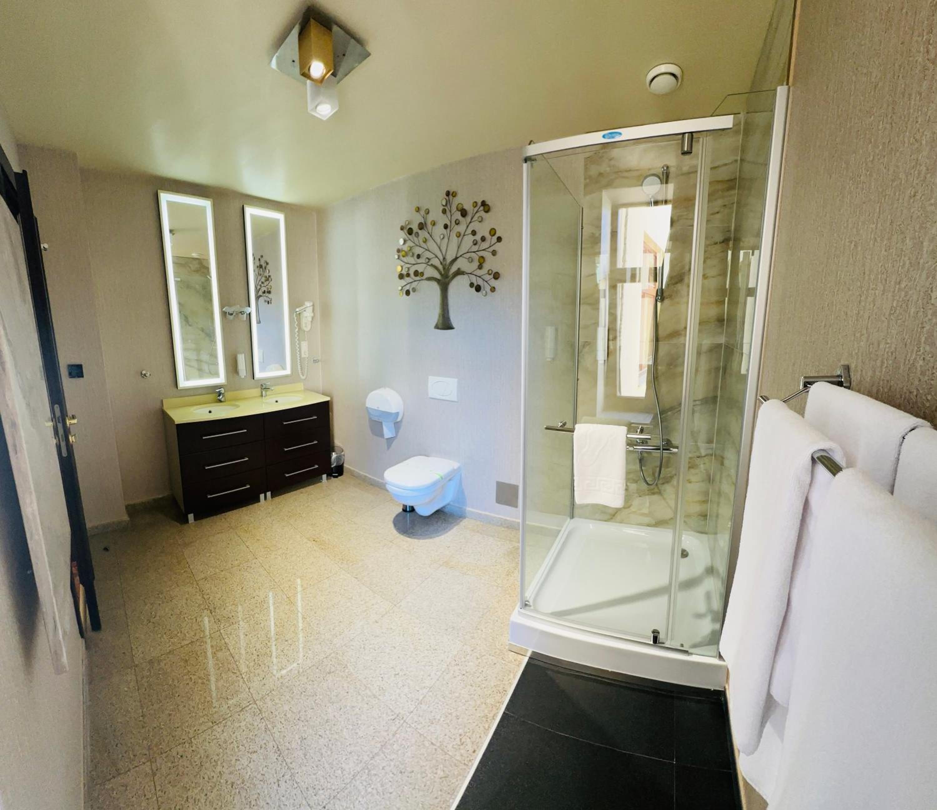 Indulge in our en-suite rooms featuring elegant beech furniture, work desks, and modern conveniences like air conditioning and free Wi-Fi. The spacious private bathrooms with marble floors, hairdryers, and some with both shower and bathtub options ensure a comfortable stay.