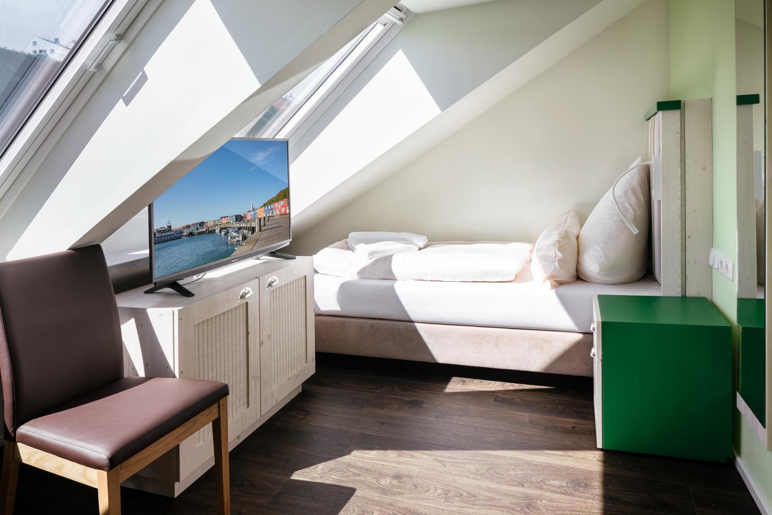 Ein Zimmer mit extremen Dachschrägen, die mir real kopfschmerzen bereiteten. Zig mal Tag und Nacht den Kopf gestoßen. Für ein winziges Zimmer für 2 Nächte 269 € ohne Frühstück zu nehmen war in meinen Augen unverschämt. Ich wechselte das Hotel