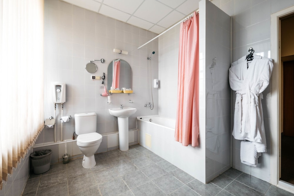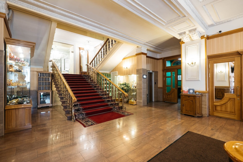 A 1000Rb taxi ride from the airport takes you right to the front of the hotel. Reception and the dining areas are from the 40's or 50's and add to the appeal of the property. The rooms are modern and each corridor can only be accessed by using the room card. The rooms are very spacious with bath and shower room separated from the bed by a large desk with a TV providing 3 channels (all news) in English. The breakfast was buffet with a good selection of meats and cheeses (as well as chicken wings!) complimented by fruit juices and tea/coffee. Overall a bargain for the prices.