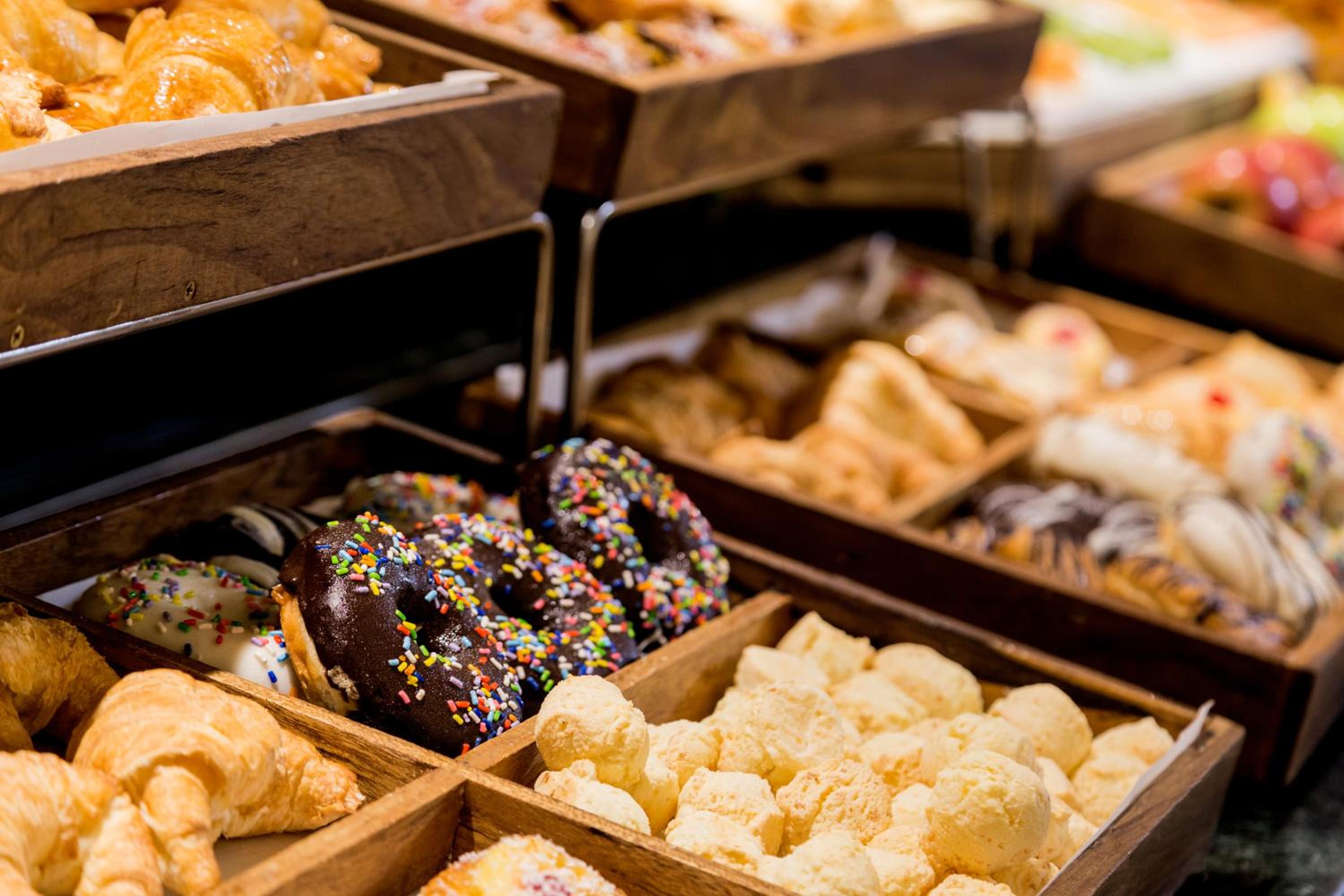 Desayuno completo, con frutas y opciones dulces y saladas.