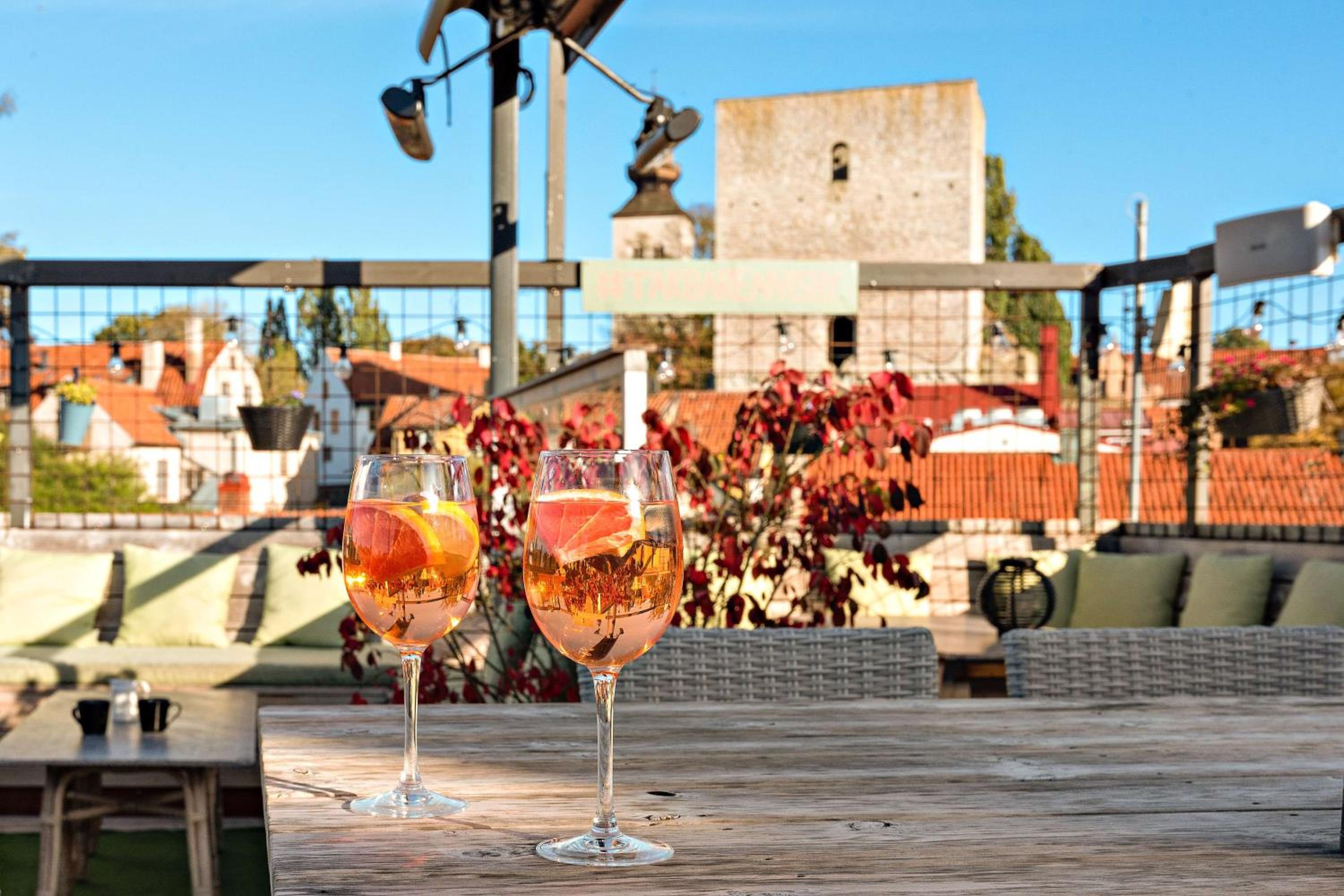Indulge in our à la carte menu at the restaurant and sip on signature cocktails at the bar. In the summer, soak in stunning views from the rooftop bar overlooking the sea and Visby centre.