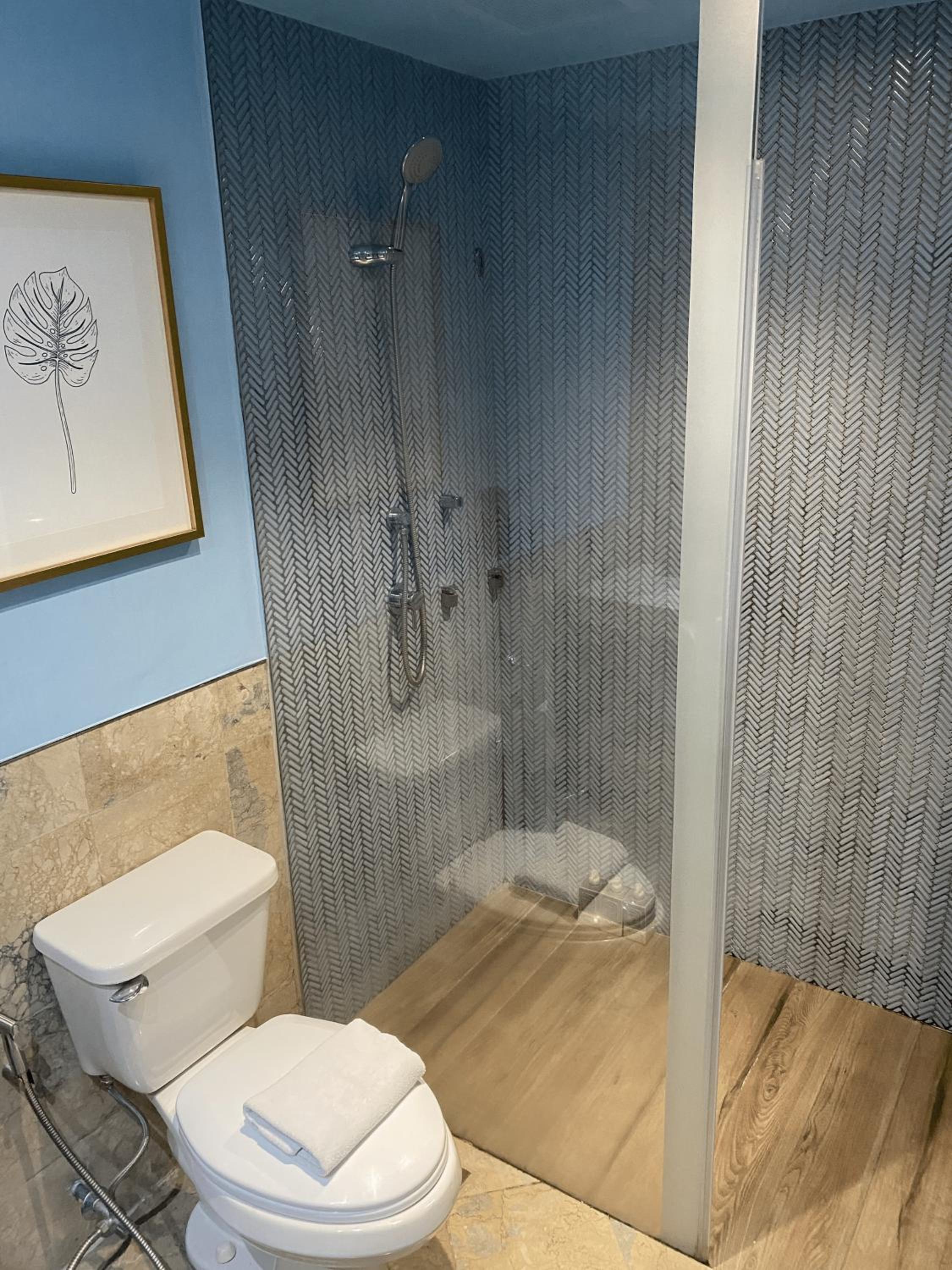 De ruime kamer, fijne badkamer.