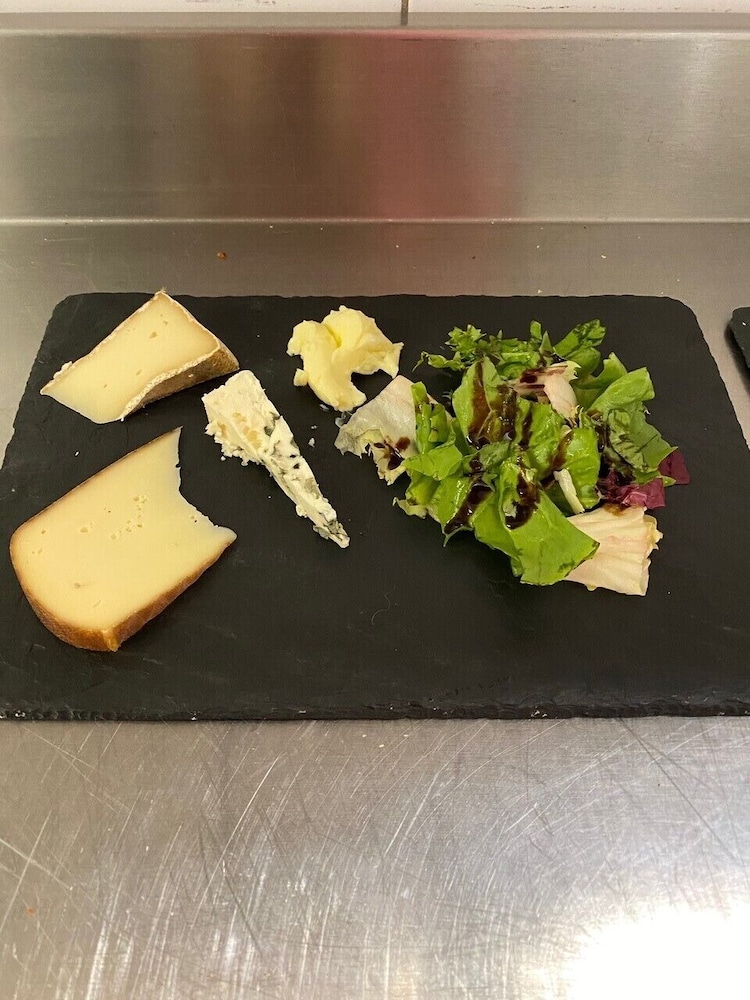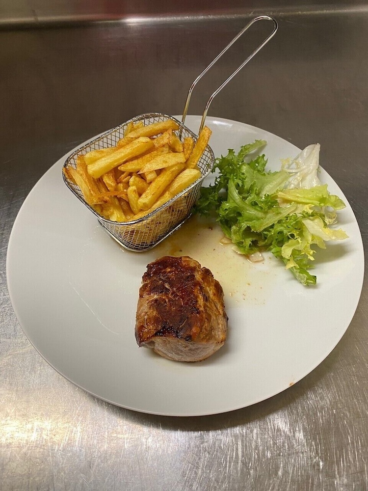We ate there in the evening - we chose the 19e for 3 courses - the a la carte menu being a bit pricey. I tend to judge a chef on what they produce in something like a plat de jour menu - if they can make good tasty local dishes then I will spend more on the next visit. Sadly this was not the case here - watery soup, pork chop and mash and an average pudding. We watched new arrivals to the hotel and restaurant and the waiters dance around the owners 2 dogs which either lay around or begged at the tables, which I found a little annoying. The bar prices are more expensive than elsewhere as well.