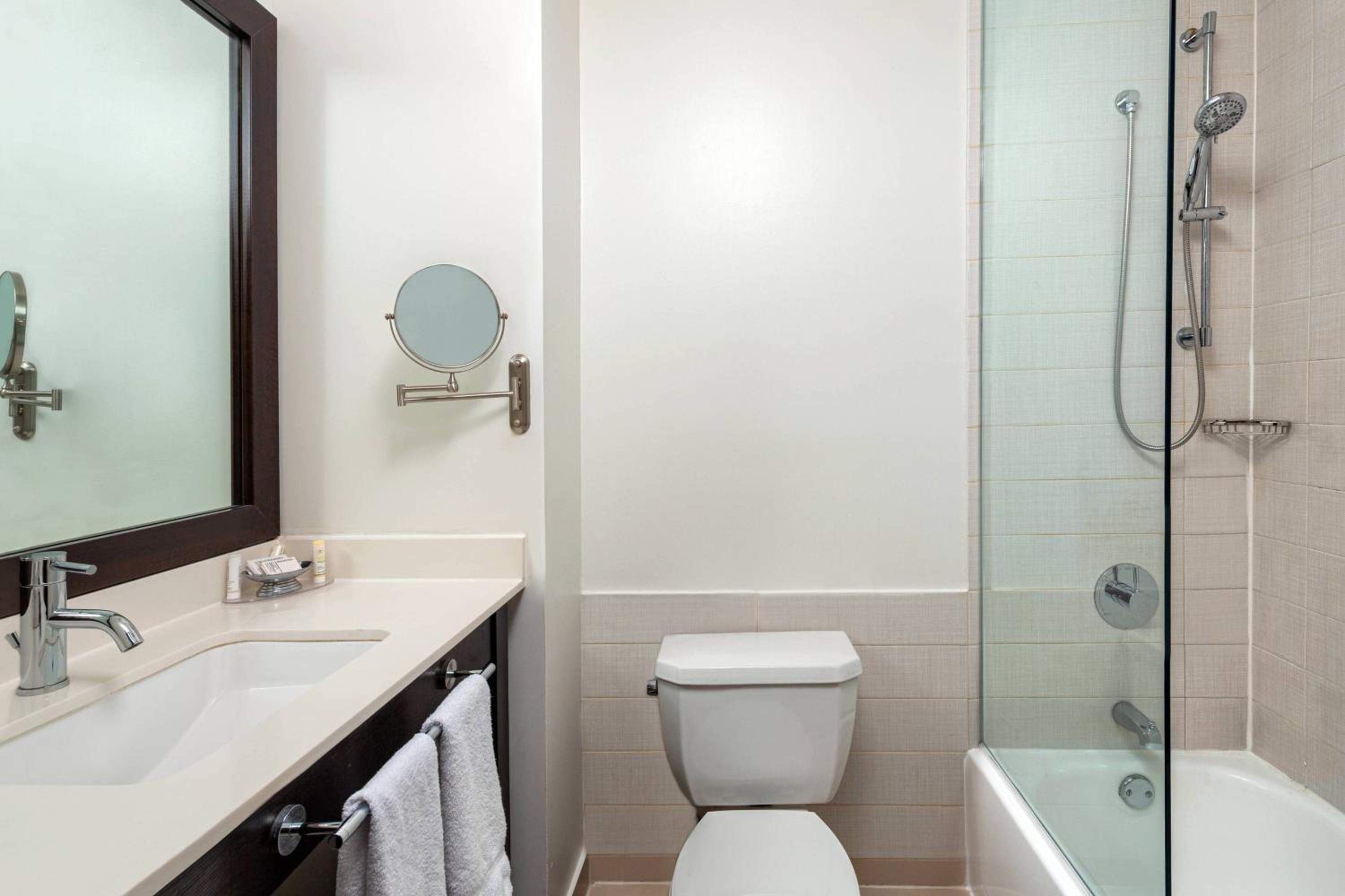 Although I was on the 19th floor it was a little noisy from the street. The restrooms were a little small the shower only had half of the glass door wish it had more privacy since I had to share the bathroom with parents.