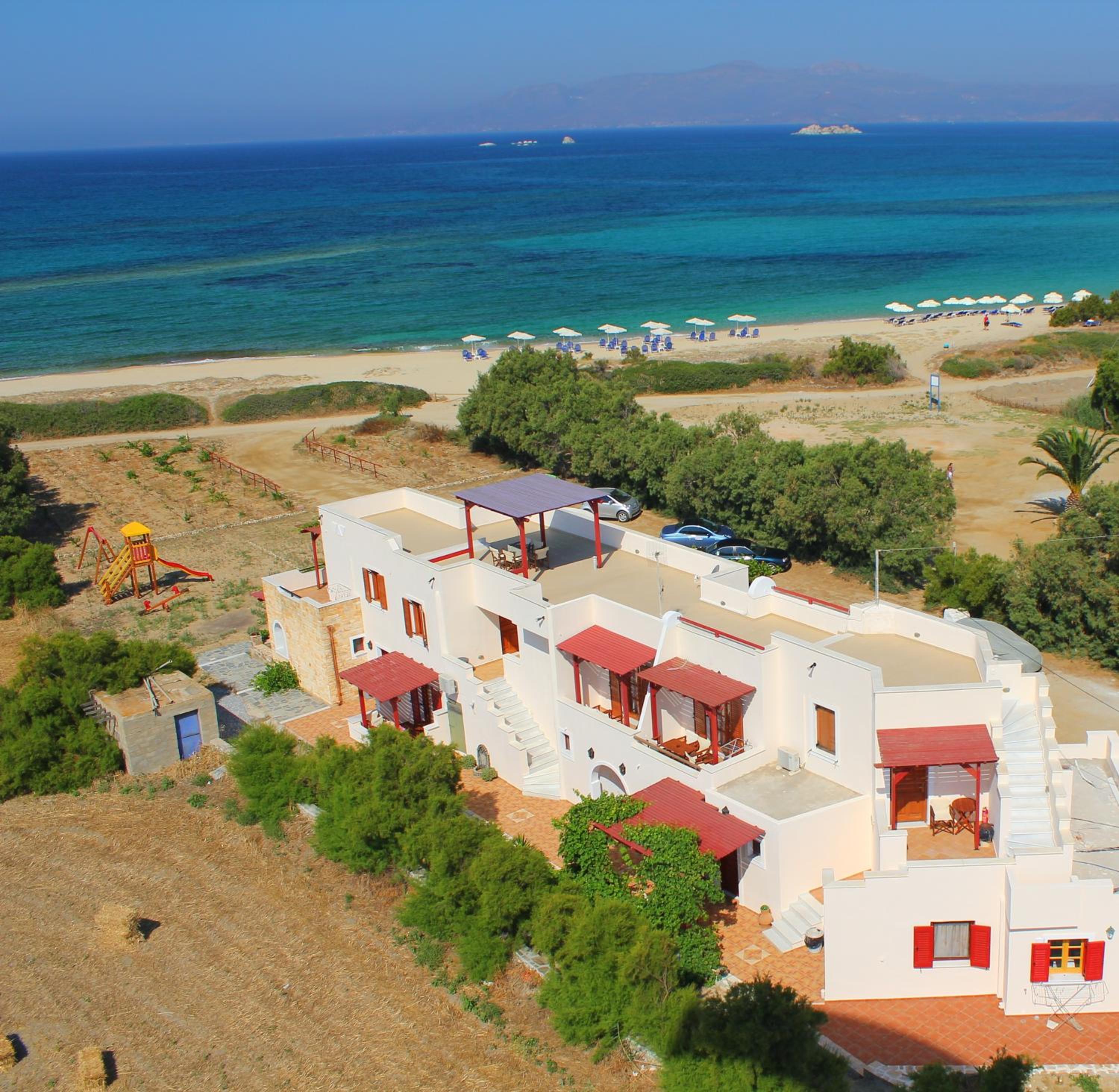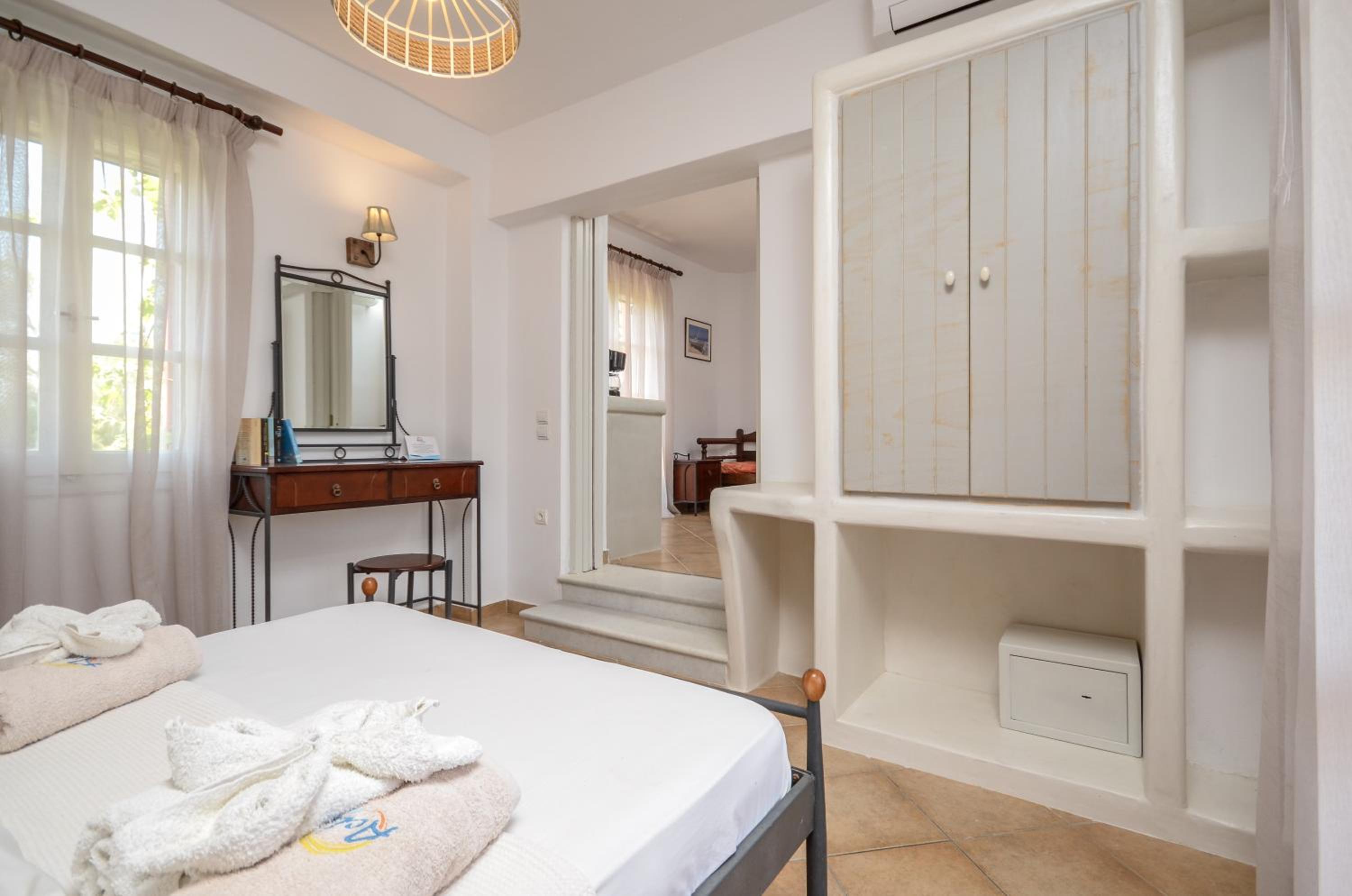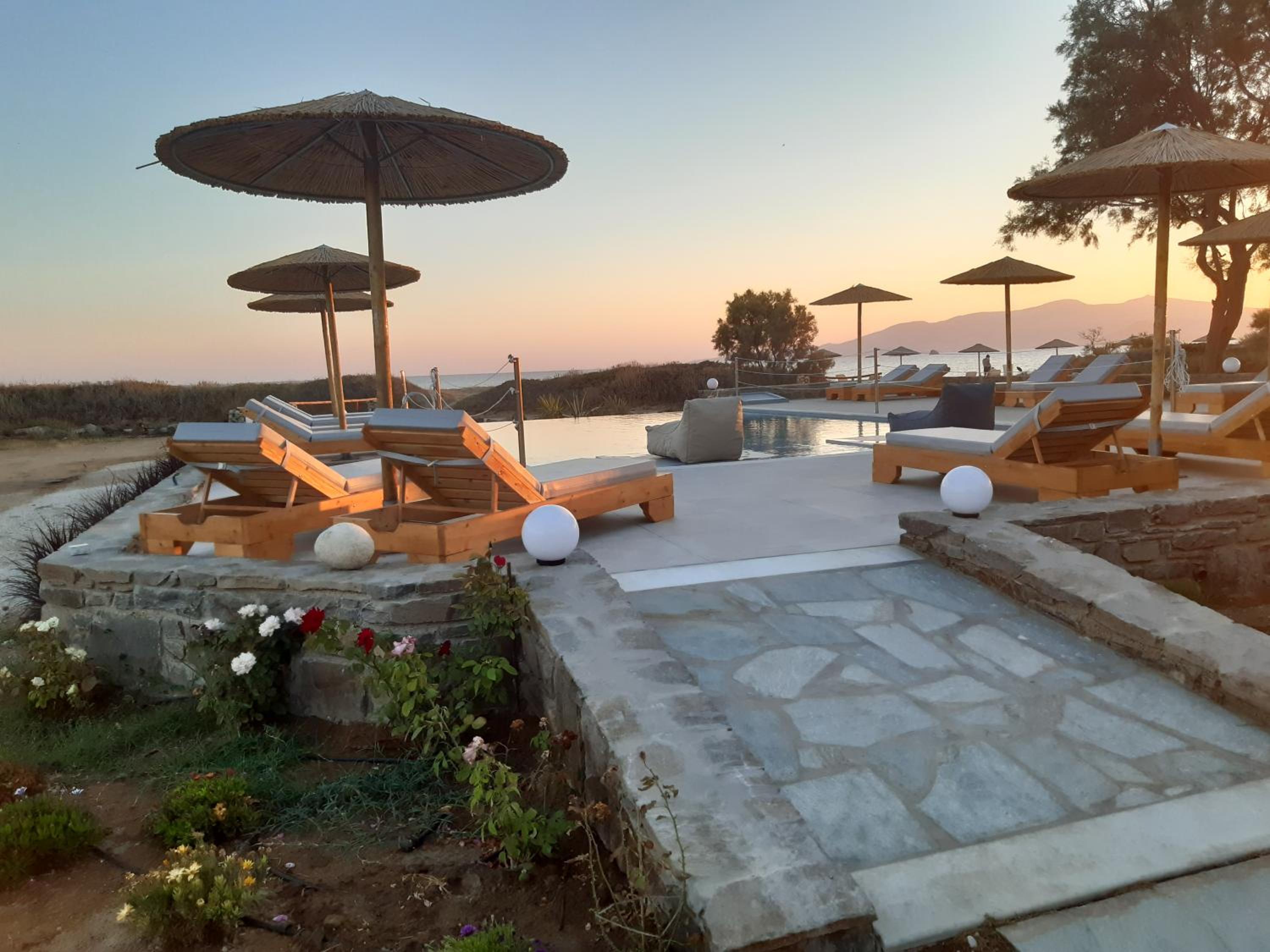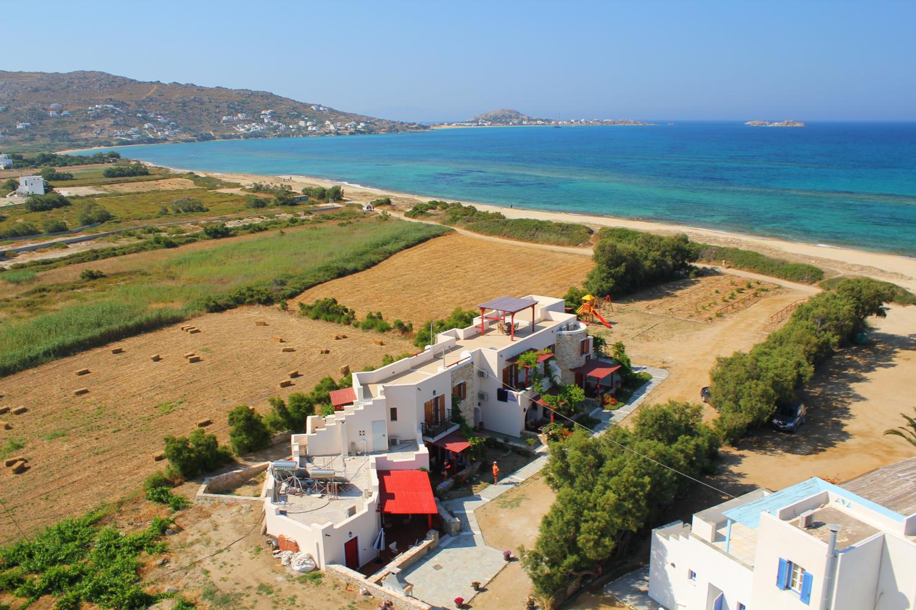 Un bel endroit en face de la grande plage de Plaka au calme, au bout du chemin qui longe la plage. Un coucher de soleil magnifique dont nous avons profité depuis notre chambre ! Et un petit déjeuner de qualité, très copieux préparé par Anastasia . Une mention particulière pour la qualité de l accueil d’Anastasia et son sens de service ! Nous avons particulièrement apprécié cette semaine passée dans cet établissement.