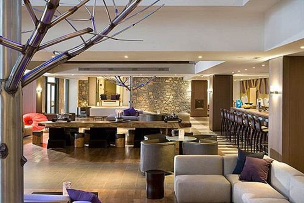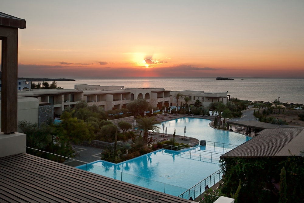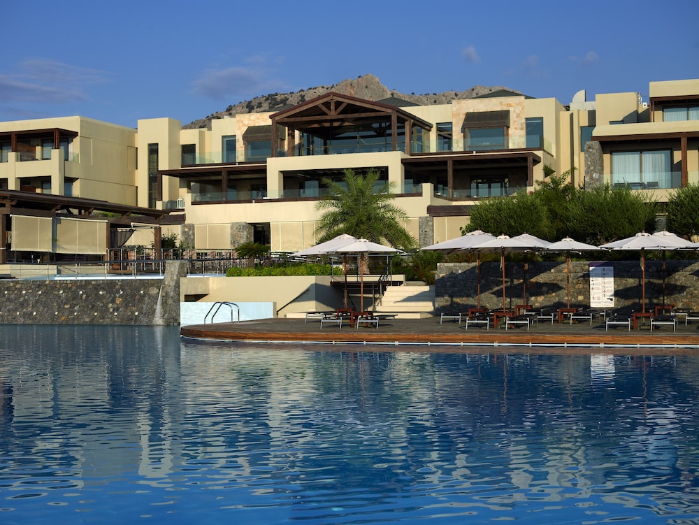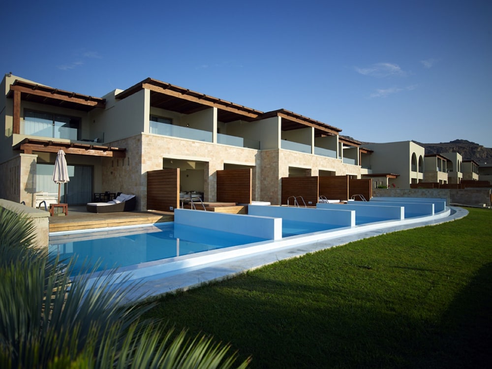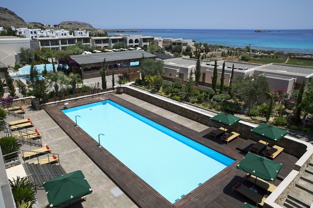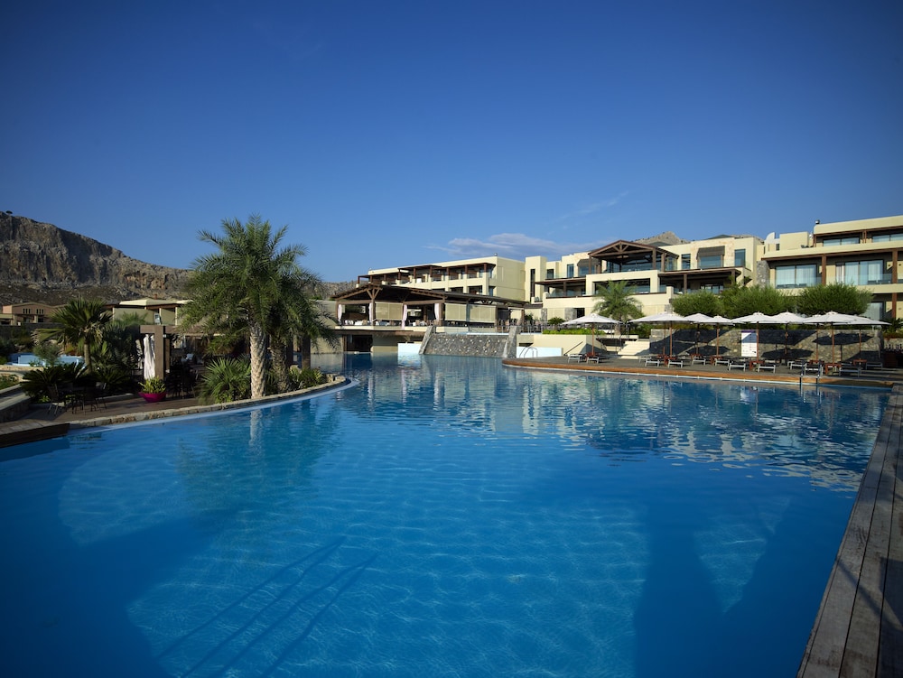 The hotel is large and modern. The grounds itself is quite large and away from any major tourists spots - Lindos is 5 mins cab away. It has it's own private pebble beach and enough space/loungers so you don't have to rush to get one.