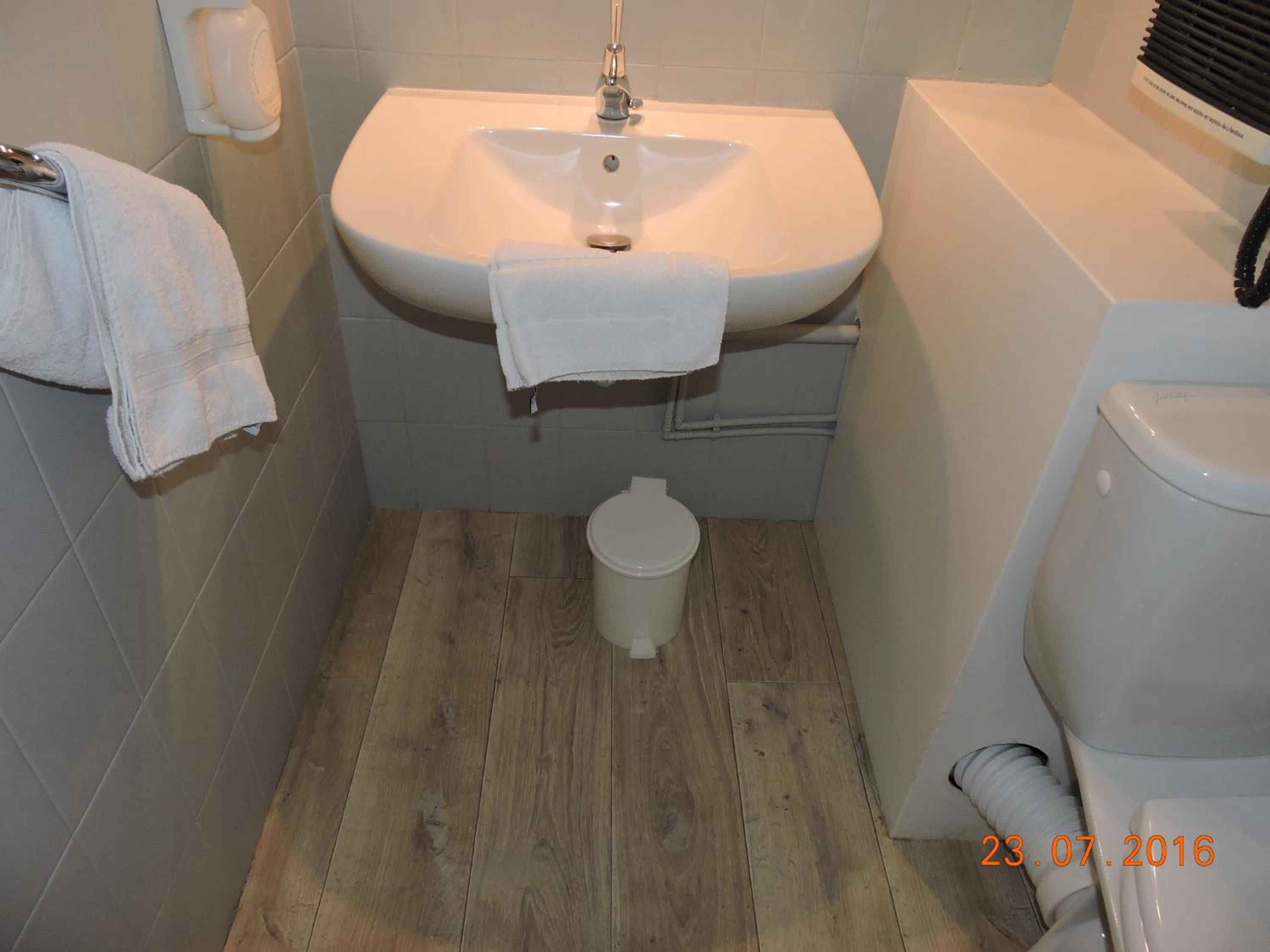 Salle de bains avec flexible de douche percé, joints sales, loin d’être à la hauteur d’un trois étoiles et encore moins du tarif à 120 euros la nuit.