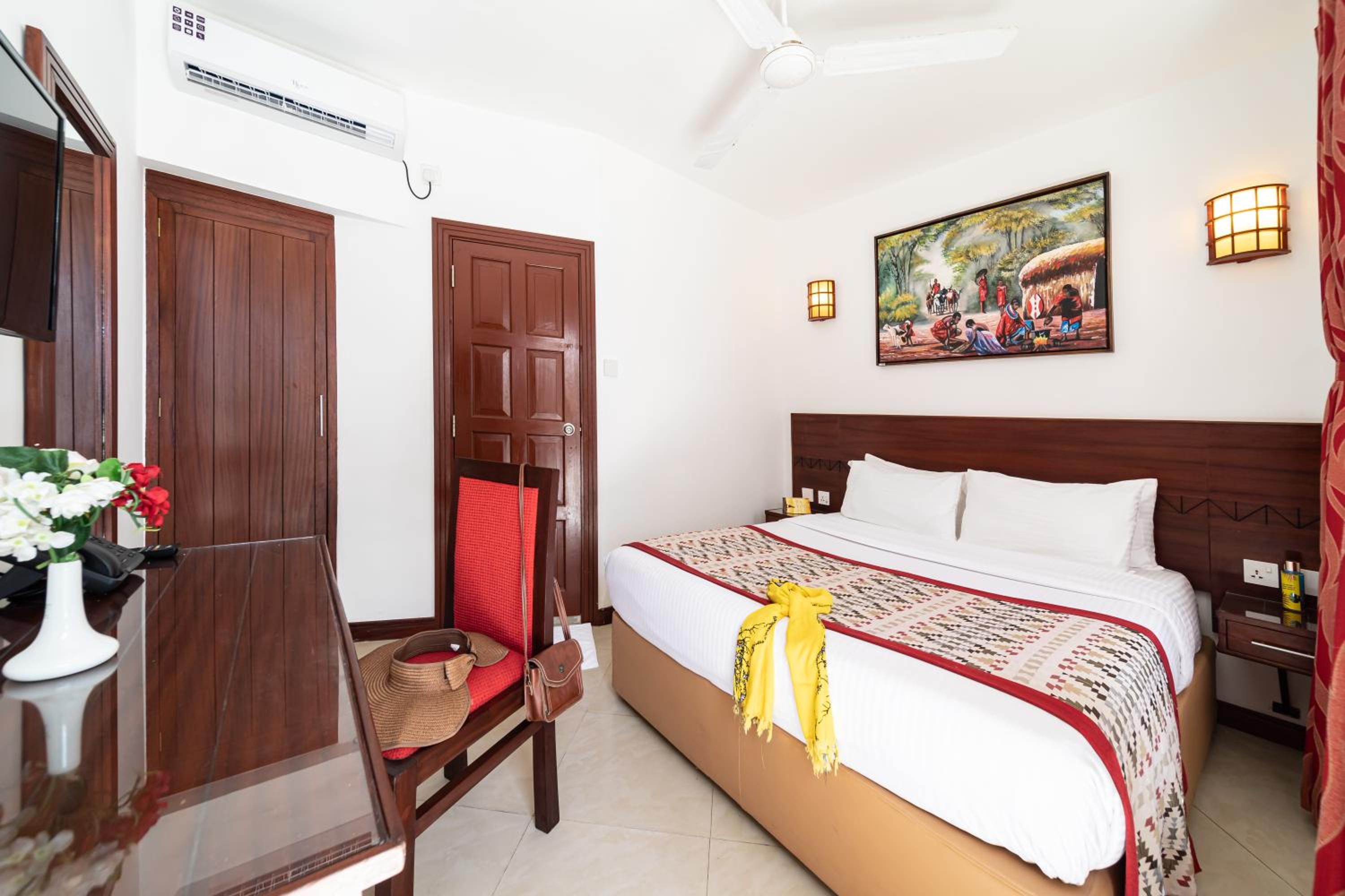 PrideInn Nyali Hotel offers tastefully decorated rooms and cottages designed in a classic natural style, each equipped with satellite TV and air conditioning for a comfortable stay.