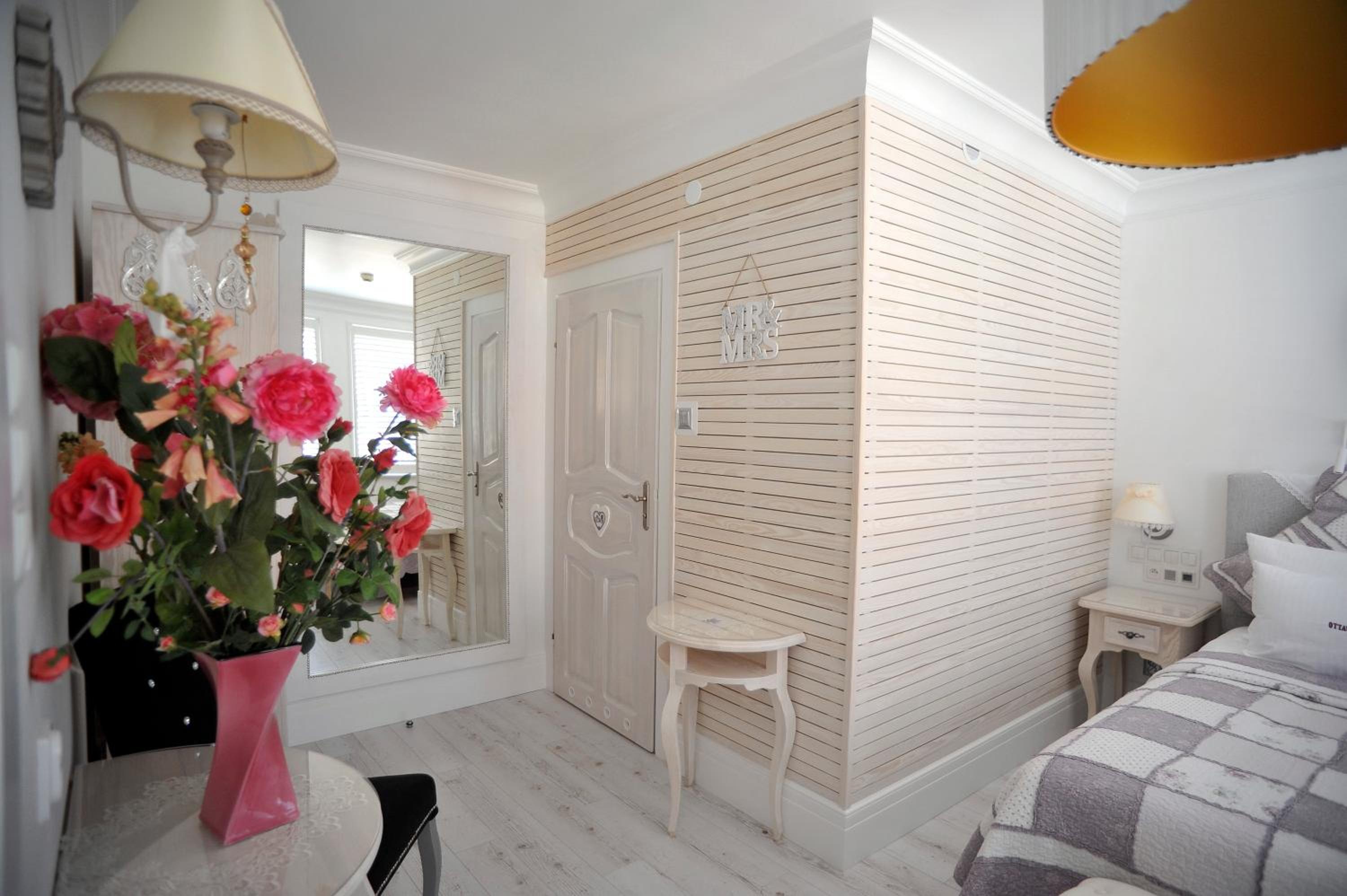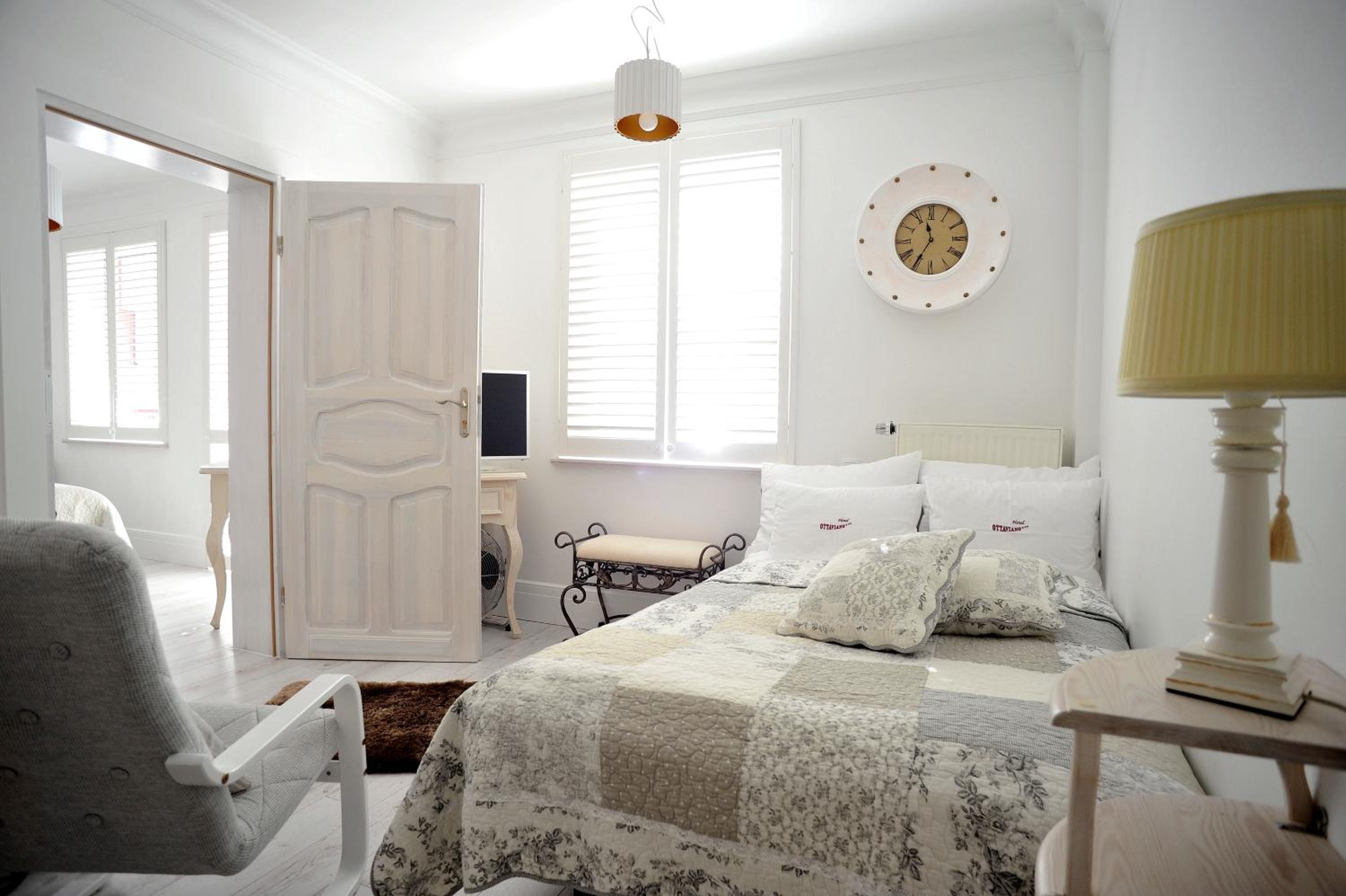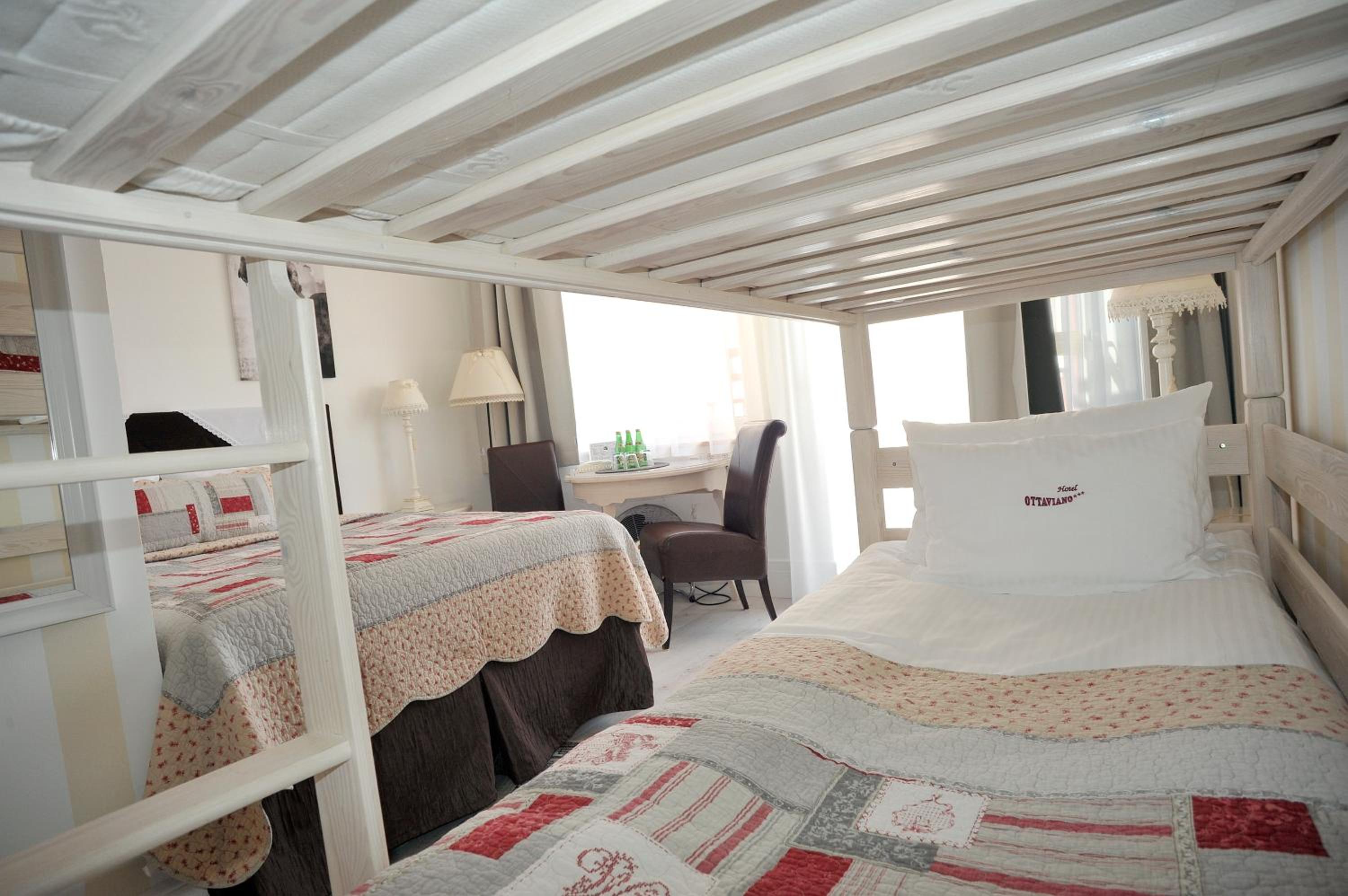 Each room at Ottaviano is a vibrant oasis, featuring wooden floors, large windows, and a private bathroom with a hairdryer. The unique decor and attention to detail create a cozy and inviting atmosphere for guests.