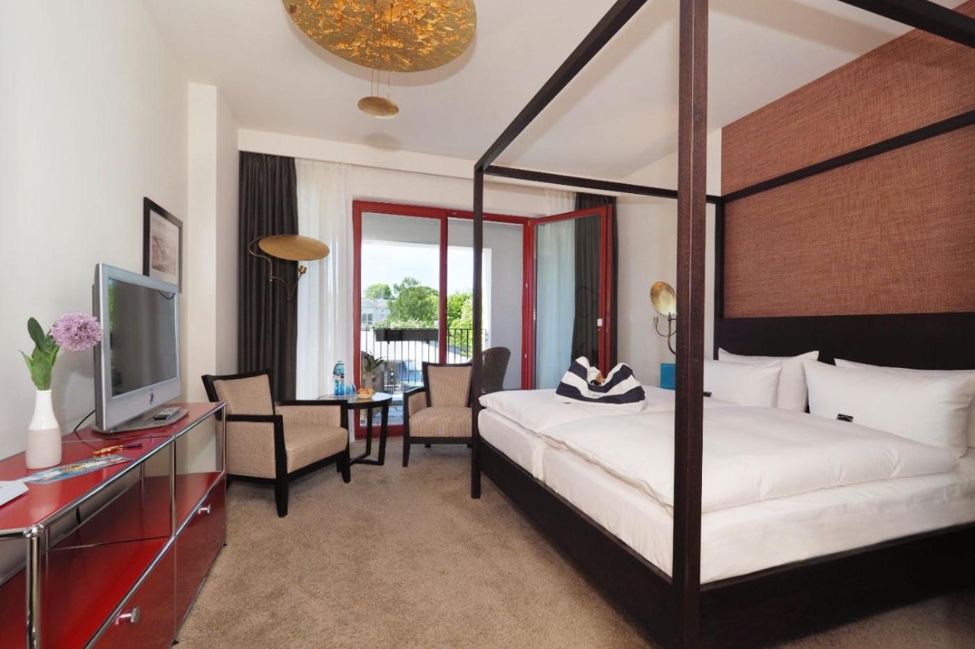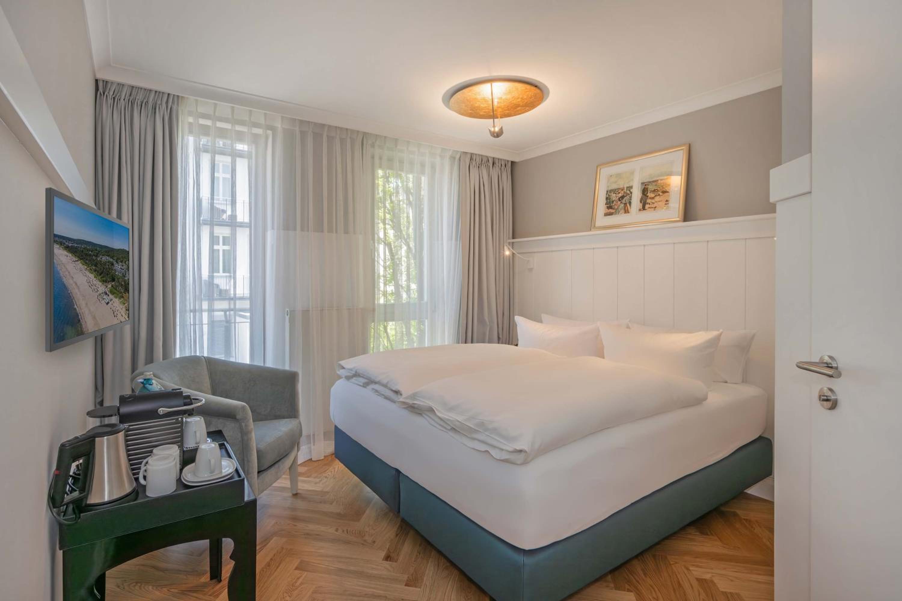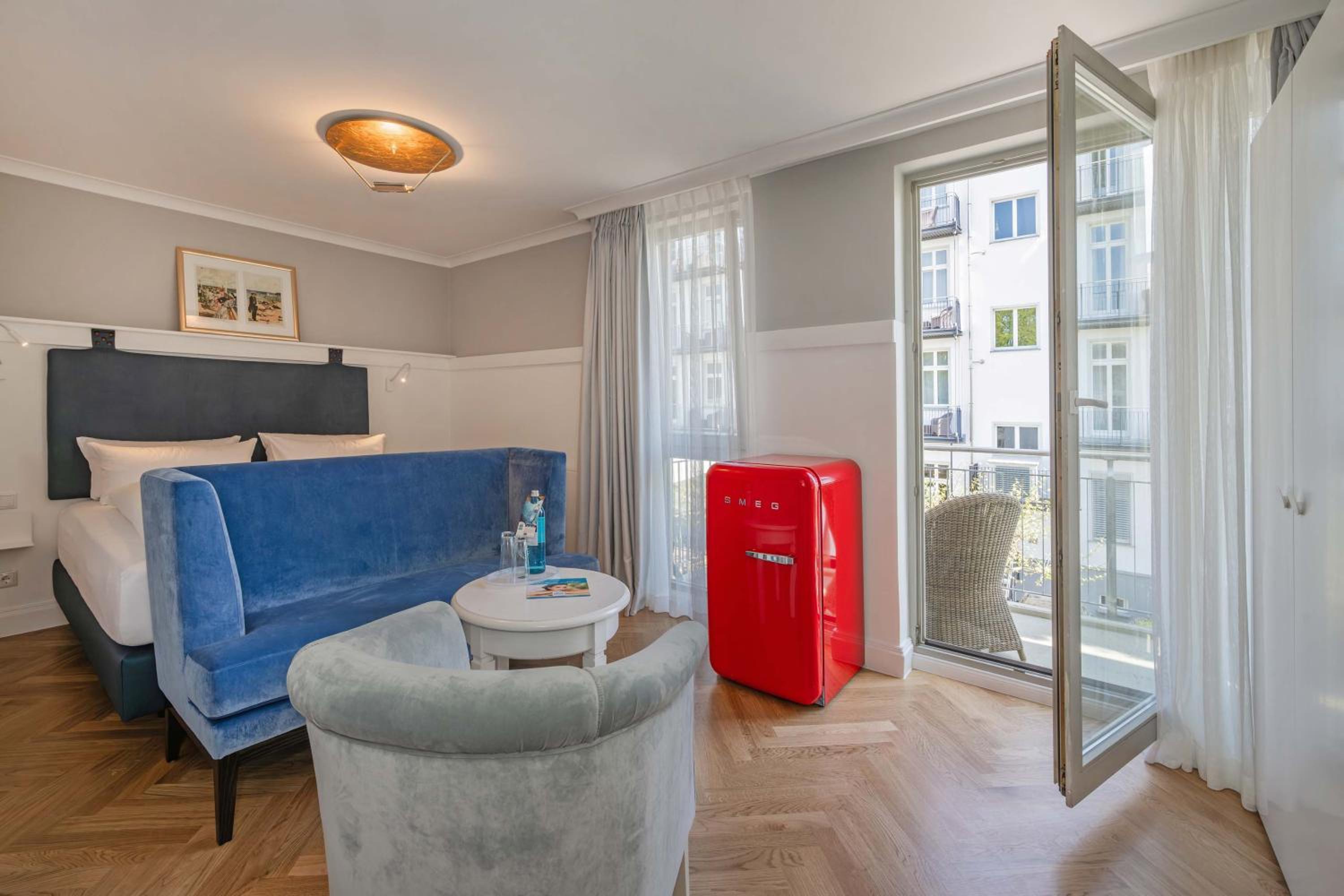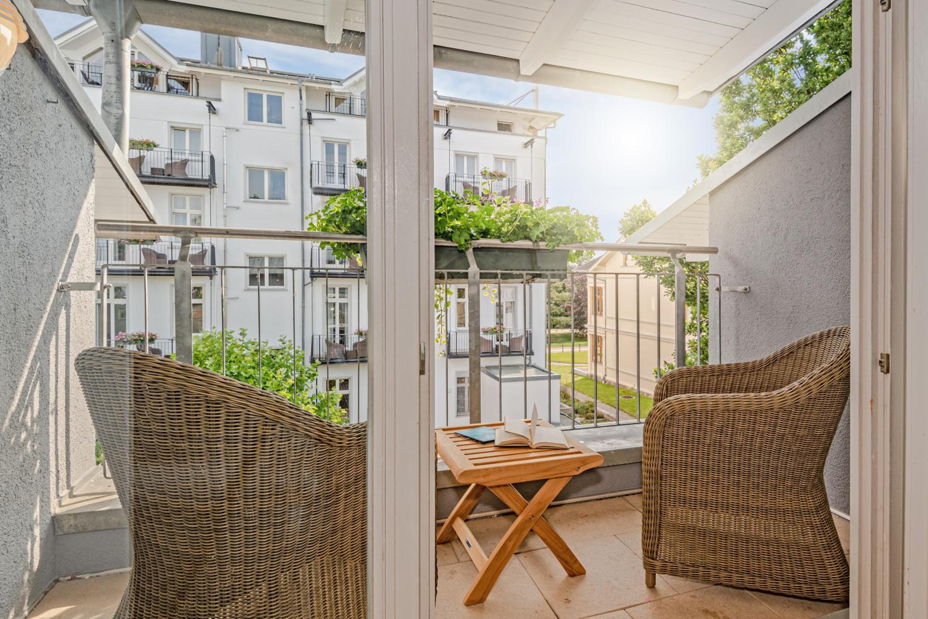 Experience comfort in spacious rooms and apartments with modern bathrooms at the Strandhotel Heringsdorf. Each accommodation option comes with a private balcony, perfect for enjoying the sea breeze.