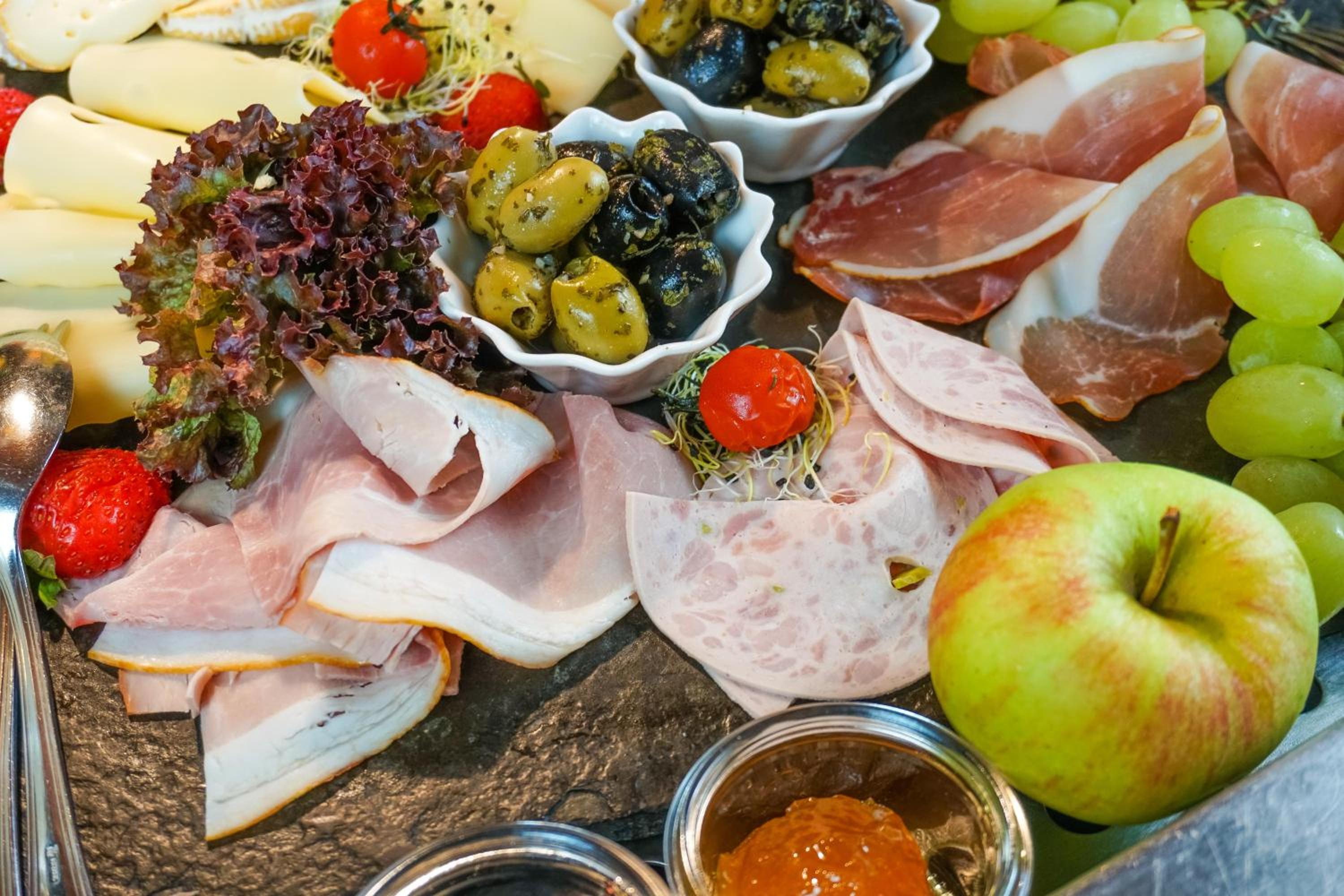 La colazione: salato sufficiente, dolce insufficiente. Oltre al classici pane burro e marmellata praticamente non c'era altro. NON va bene.