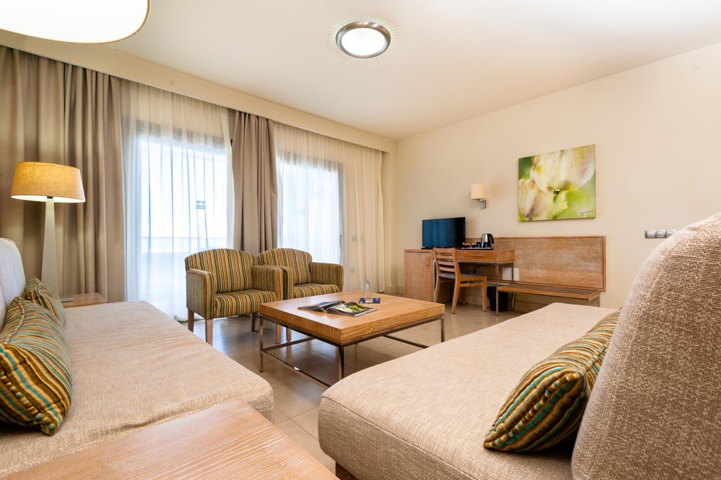 I had a sea view junior apartment, the view was great and the apartment spacious. It wasn't very comfortable though, bed very hard, just a sheet and blanket and one pillow. Sofa was rock hard too and not comfy. TV didn't receive any of the UK channels.