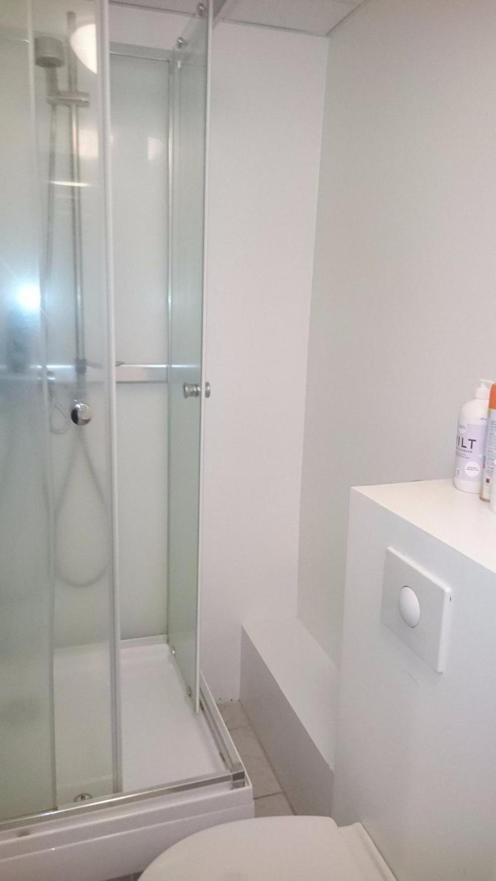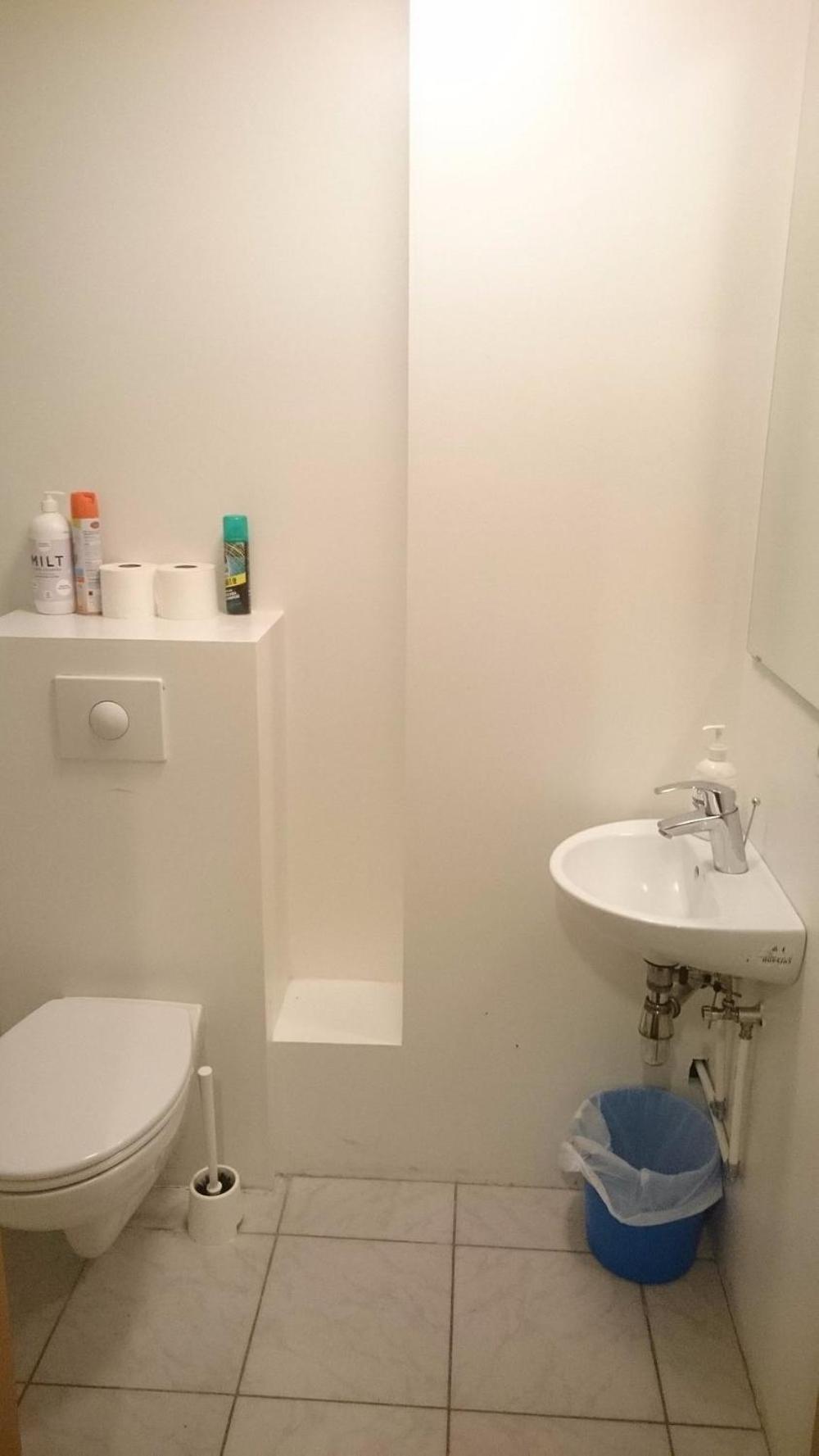 Smelled of sewer gas. Dirty room and facilities, generally. Low standard of design and construction.