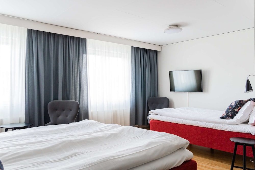 Personalen var väldigt serviceminded. Men rummet var en besvikele. Golvet var inte städat. Låg damm och gammalt godis. Toan var dåligt städad och där var svartmögel i hörnorna. En lampa fungerade ej. Bad om städning dag 2 men det enda som gjordes var att bädda sängen och byta handdukarna. Kaffet fylldes inte på och kaffemuggarna stod kvar med kafferester i. Definitivt inte värt pengarna.