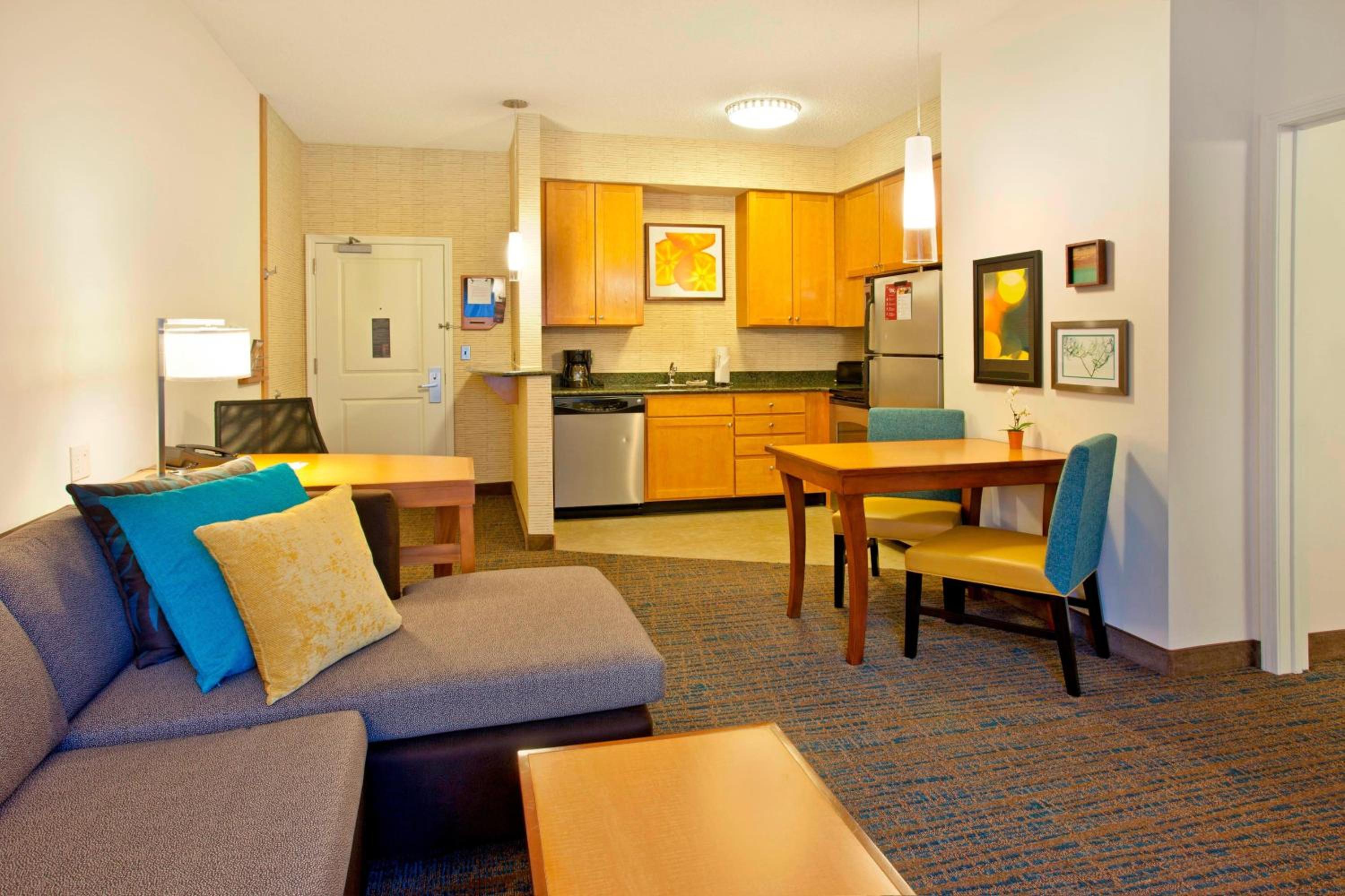 Experience the comfort of warm colors and wood furniture in every spacious suite. Enjoy the convenience of a kitchenette and modern amenities like free Wi-Fi and flat-screen TVs.