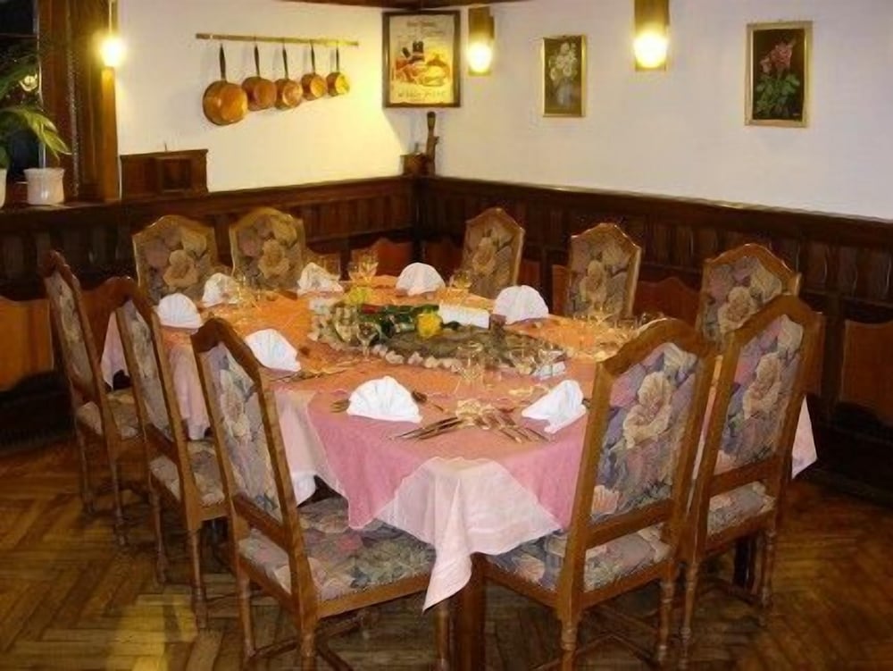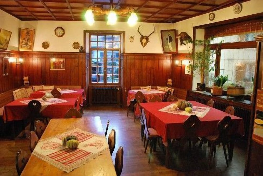 A traditional style hotel which was perfect for a family stopover. Very welcoming, very comfortable and delicious meals in their restaurant. Off street parking. English speaking owner. Credit cards accepted. Situated just off the motorway but in a beautiful, quiet village. Perfect, would highly recommend.