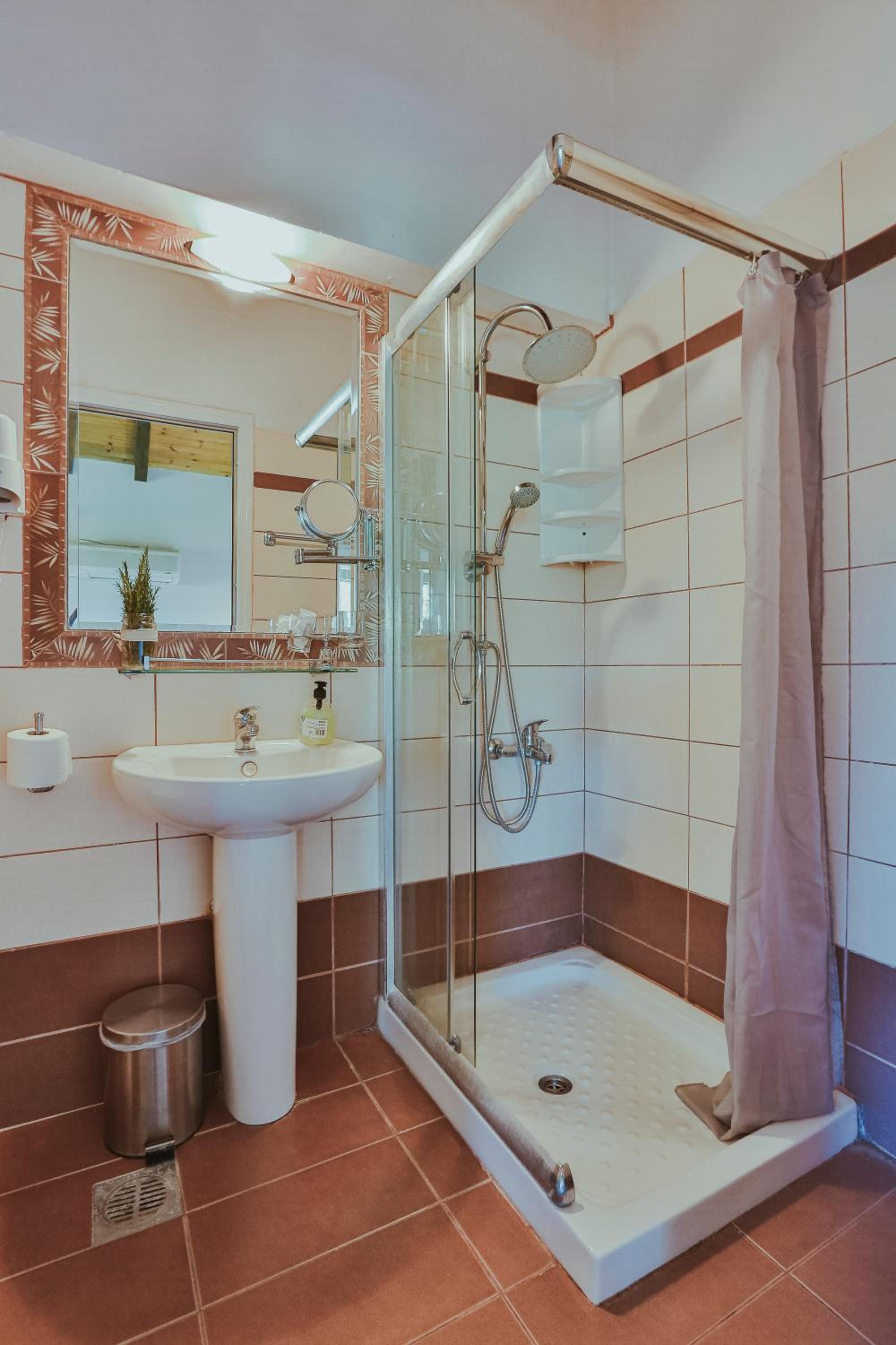 La douche était dépourvue de rideau, malgré les anneaux bien en place pour le recevoir, inondation de la salle de bain garantie (pensez à sortit le papier toilette)