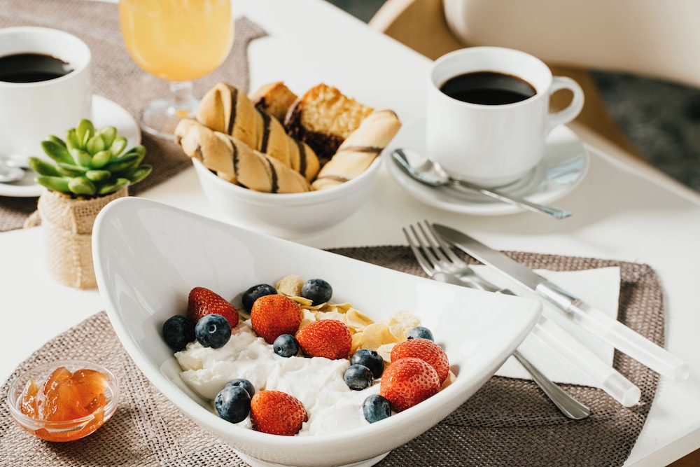 Satisfy your cravings at our cozy café or indulge in room service for a private dining experience. Start your day right with a complimentary continental breakfast, served fresh daily.