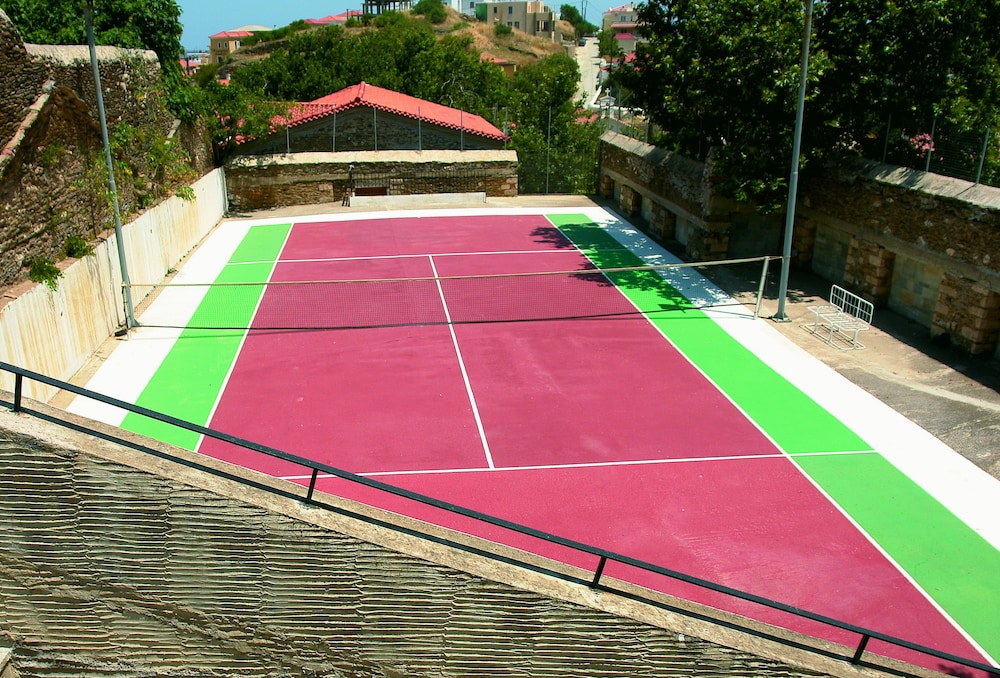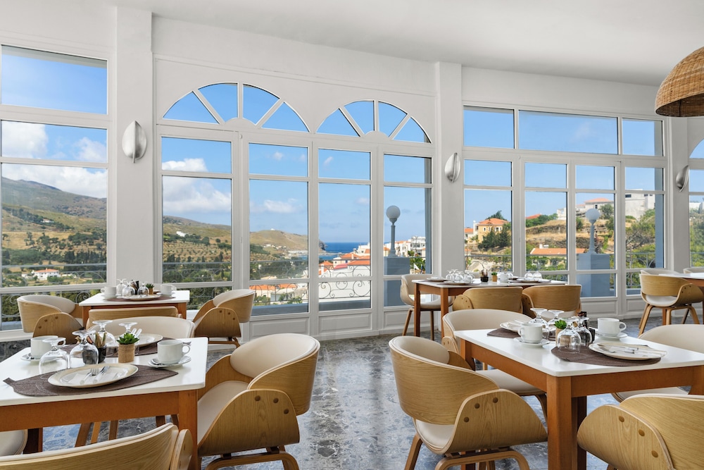 A “grand dame” of the Chora Andros hotel scene in need of a little TLC. Rooms are bright, clean, roomy and airy — though they could do without the archaic and pointless metal-framed canopies surrounding the beds and which are a constant nuisance and distraction. Word is that a renovation is planned for this coming winter. Kudos to the management for using Greek made bath products instead of the Chinese knockoffs some hotels use in order to save a few cents. The included breakfast is not bad, though it pales in comparison to the rich spreads some Greek hotels offer. The hotel grounds are beautiful and even include a pool and on-site chapel. There’s also a good amount of free and easy parking. All in all, not a bad choice when staying on Andros.