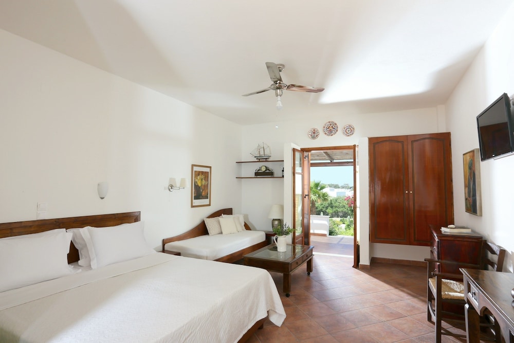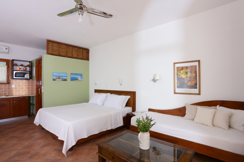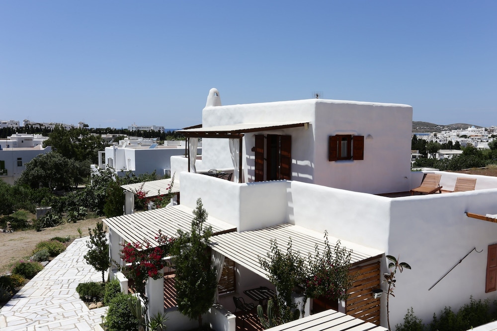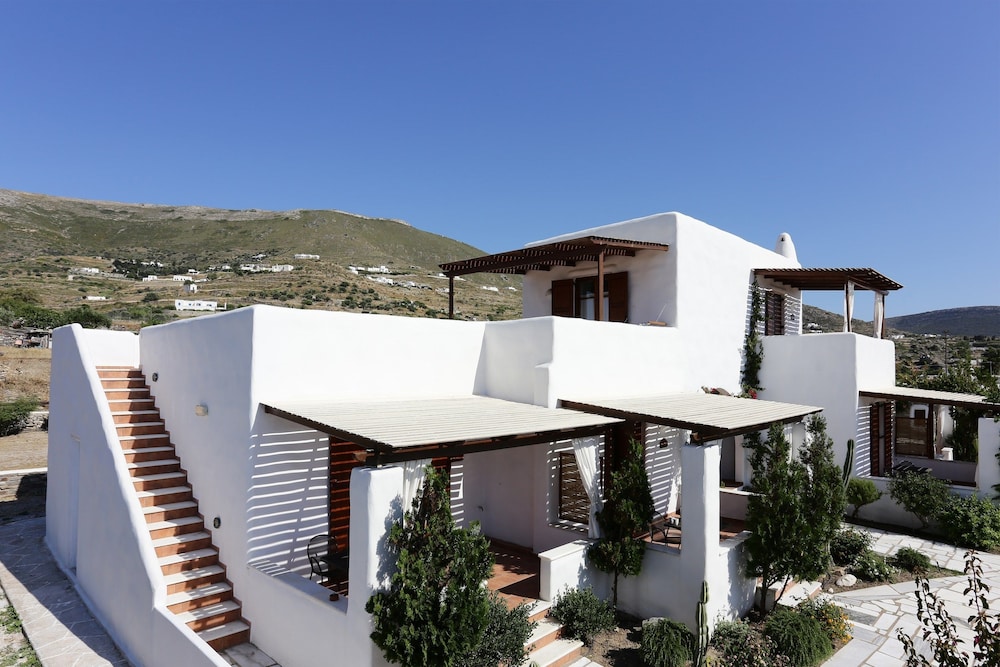 Très bon acceuil au port pour nous conduire à la résidence. Nous avons eu la chance d'être au 2 ième étage avec magnifique vue sur la ville et coucher de soleil. La chambre était spacieuse propre et confortable. A 10 minutes à pieds du centre en pleine campagne avec les chèvres chevaux et coqs (si vous êtes sensibles au réveil du coq attention :-) Mais pour nous aucun problème. Petit supermarché à coté pour préparer sont petit dej et qq repas. Le proprio nous a gentiment amené au port pour le départ et nous a remis avec la facture un CD de musique grecque. A paros location de voiture ou quad nécessaire pour visiter toute l'ile. Belle plage de l'autre coté de l'ile.