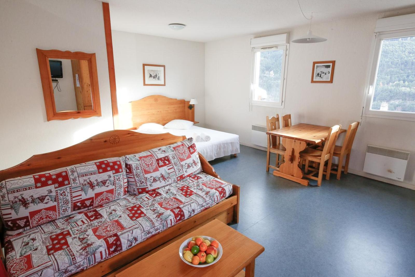 We inform you that the accommodations 'Studio with balcony (for 2 people) and 'Studio with balcony (4 people)' are equipped with a convertible sofa bed (considered as 1 double bed) and a bunk bed.