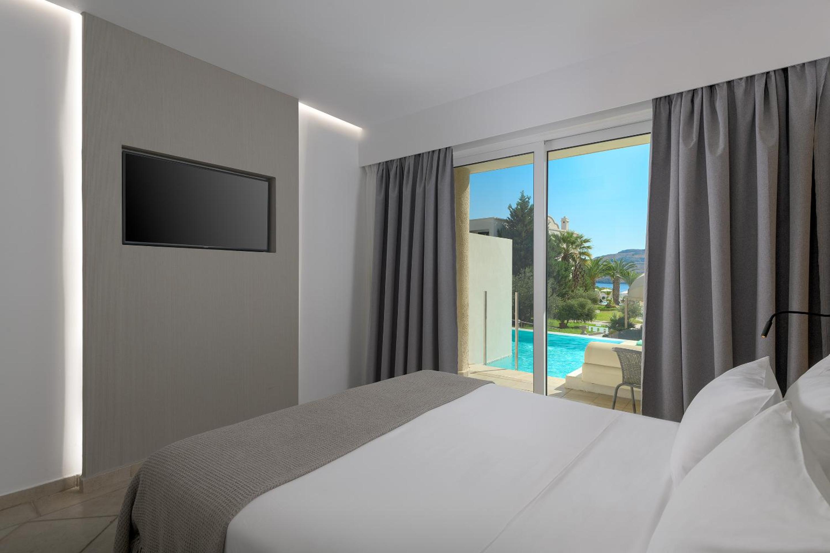 Comfortable Accommodations with Stunning Views: Relax in spacious rooms with breathtaking views of the Aegean Sea, gardens, and pools.