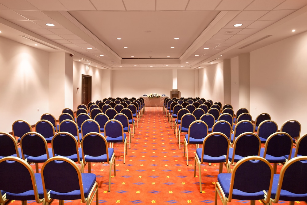 Upsides: the hotel is beautiful inside and out. Dinners were great. Souvlaki and more was a good fast food addition to eating options. Evening entertainment was good on most of the days, esecially Greek night! We enjoyed the aqualand waterpark very much, even when it was very cold. We enjoyed the Gym.