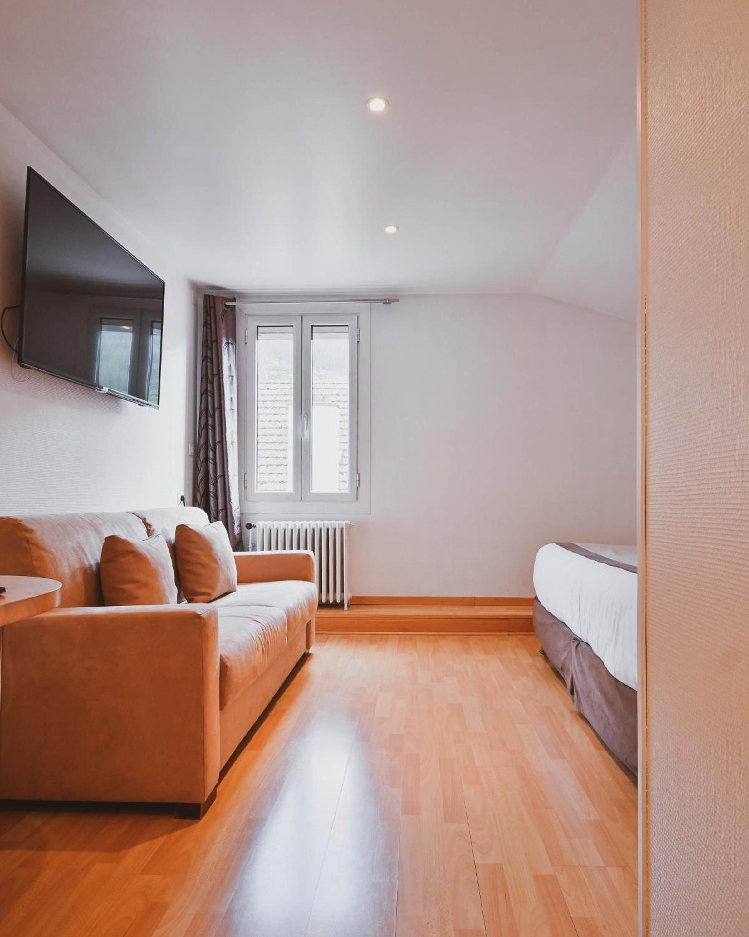 Each of our 25 rooms is equipped with modern amenities including a flat-screen TV, mini-bar, and private bathroom. Enjoy complimentary WiFi and public parking. Elevator access is available for all rooms.