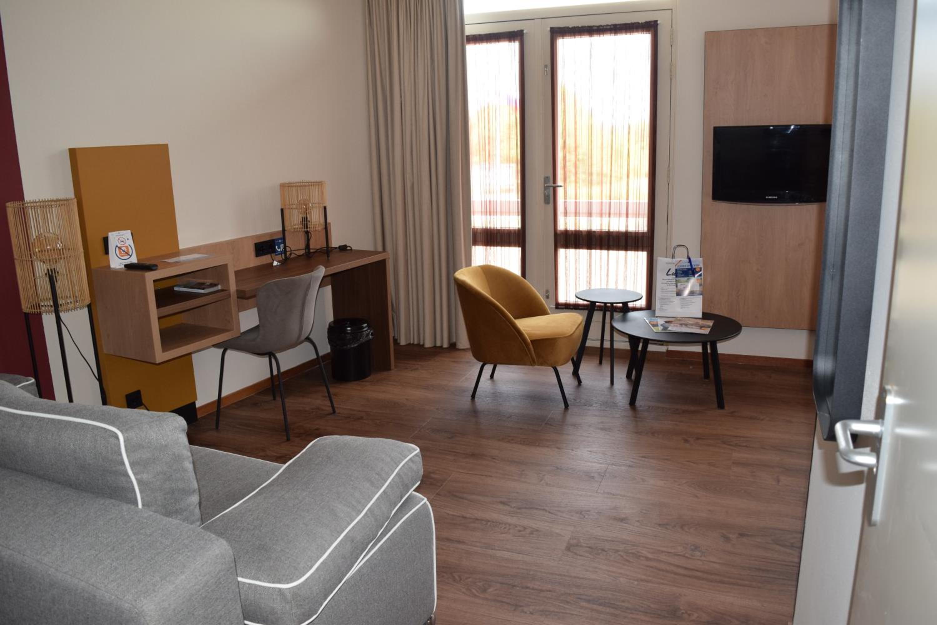 Tv op de kamer vrij klein en miste een klein koelkastje. Met de gordijnen dicht toch vrij donker in de kamer . Misschien nog een grote lamp