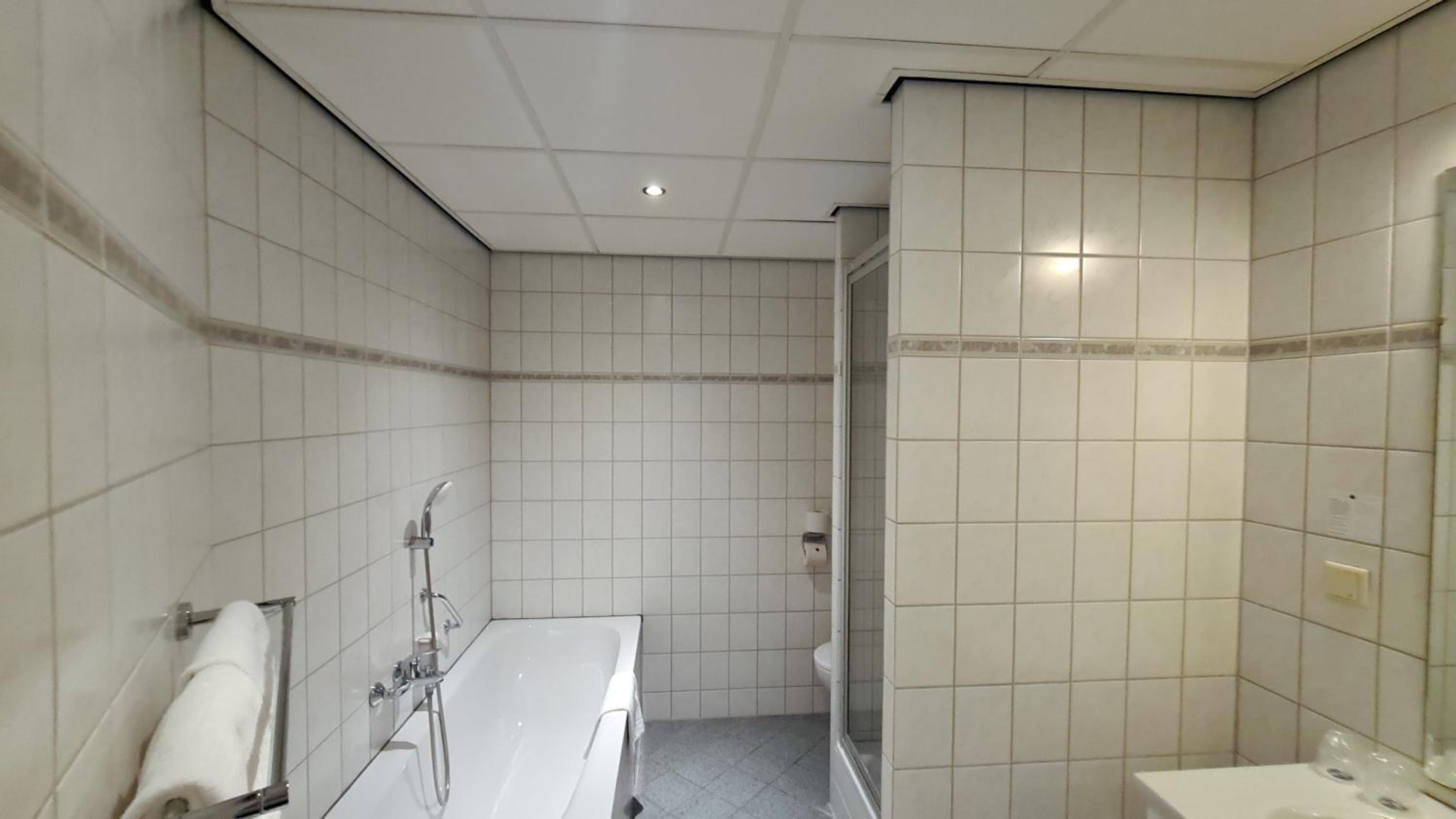 De ruime kamer een lekkere zitbank en een heel goed dubbel bed . Koffie en thee beschikbaar . Badkamer met toilet ,douche en bad . Frisse handdoeken . En het ontbijt was uitgebreid en lekker