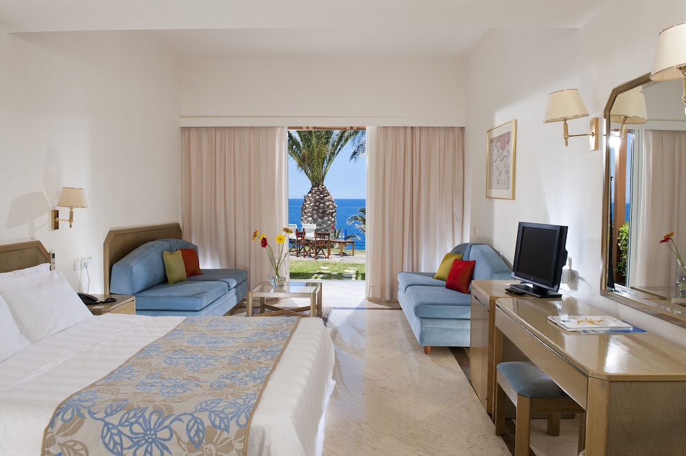 We’ve been half board for a week here. It’s been a super week. We’ve used it as a base to visit the island (we booked direct and booked flights and car hire separately), most of the guests here are on AI package breaks. Yes the main hotel is ready for renovation, but it’s been absolutely fine for us. The bathroom has already been upgraded, and everything was super clean and functional. Lots of toiletries provided and fresh towels daily. The sofa bed had an issue as the cushions separated at night, and we needed to move it to avoid drips from the air con. We loved having a fridge in our room to keep drinks cool when we got back from our trips.