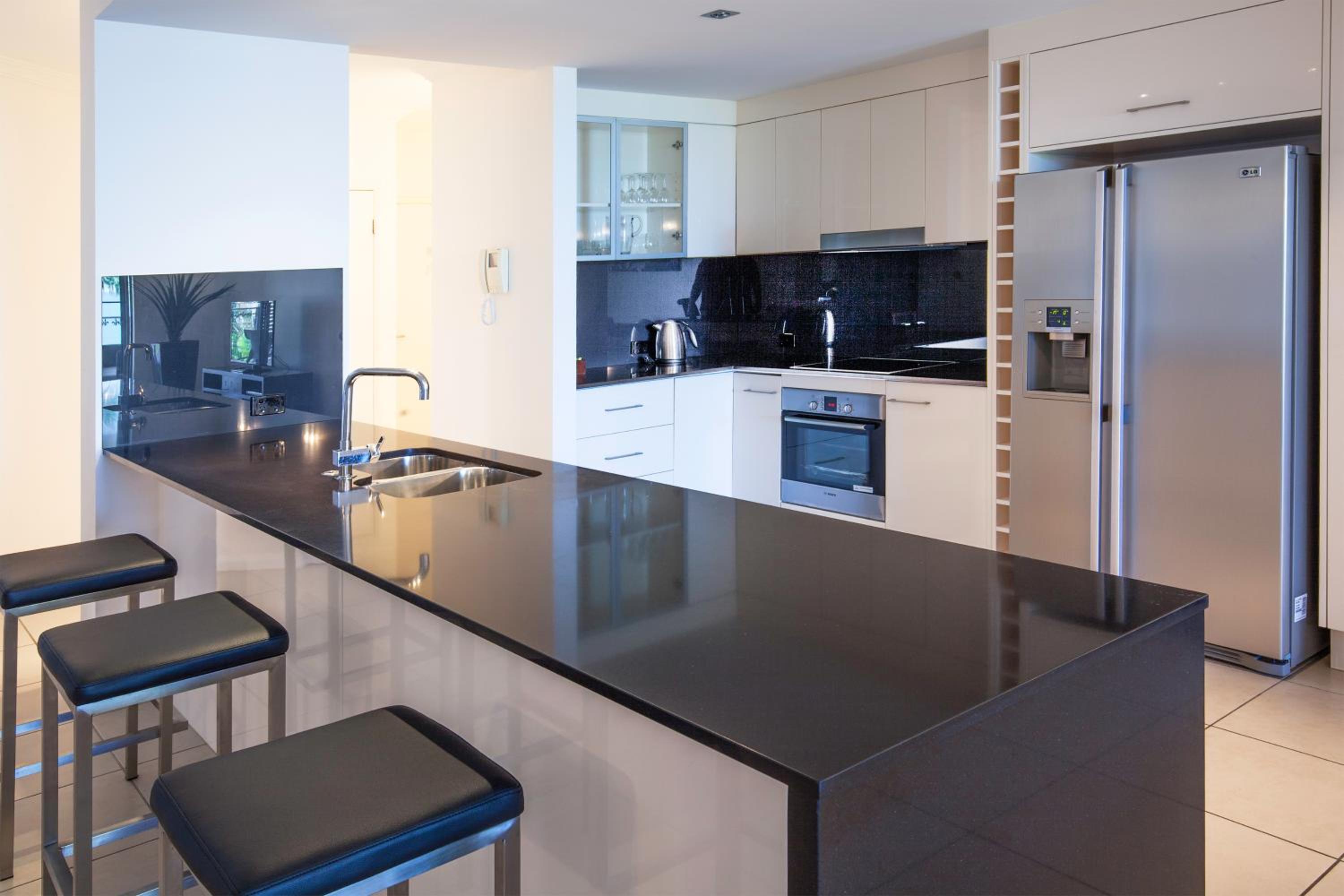Indulge in modern amenities such as a flat-screen TV, internet connection, and a CD/DVD player. The units feature a bath and a well-equipped kitchen with granite benchtops, oven, and microwave. The contemporary decor and designer linens add a touch of elegance to your stay.