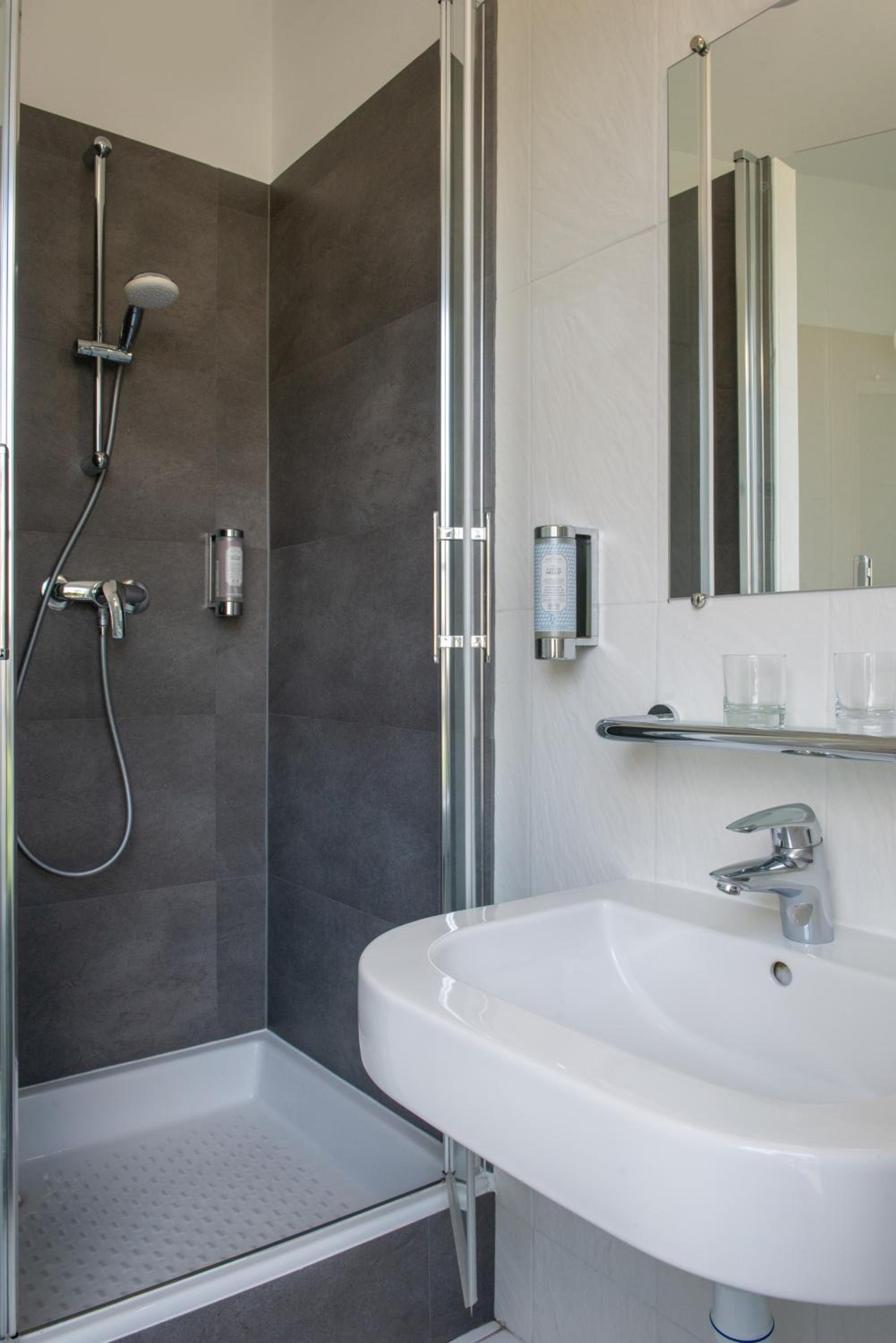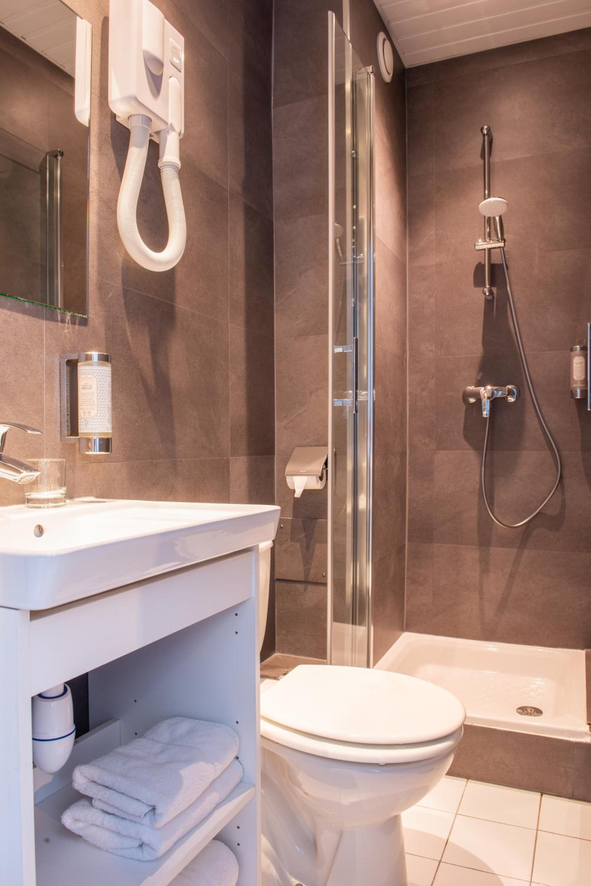 - malgré que la chambre vienne d'être rénovée, les portes de la douche ont été montées à l'envers, ce qui fait que l'eau qui ruisselle le long des portes s'écoule sur le sol de la salle de bain, et inonde le parterre.