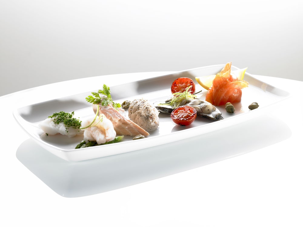 Booked dinner ahead as well. Room modern and clean. Previous guests rubbish under seats at table though. Quiet corridors. Efficient and friendly reception. €25 car park overnight. Breakfast good and buffet type. Gluten free selection but no separate toaster!