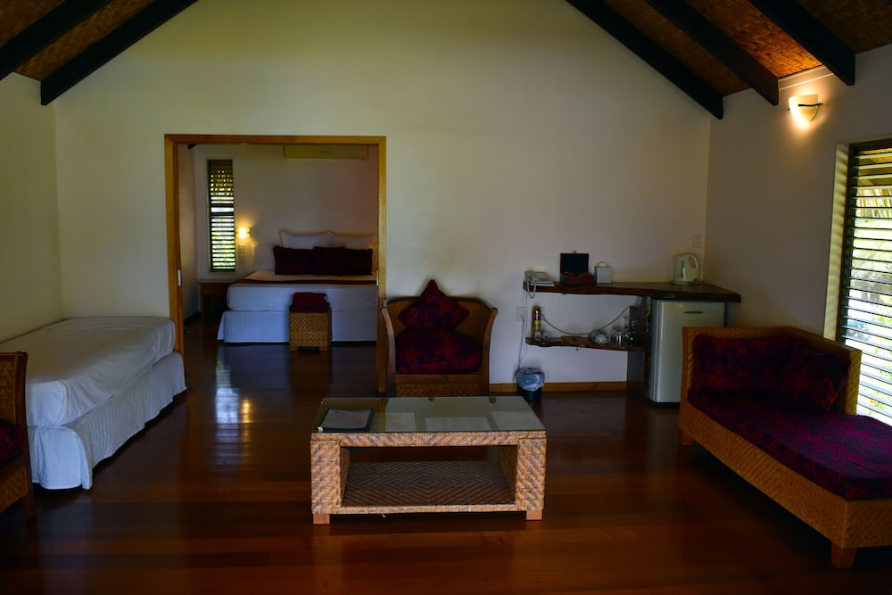 Resort quite nice, separate family, adult. Beachfront rooms misleading. We paid additional for this and it was not beachfront. I asked about that and the service member said, "yes, it can be confusing, not actually on beach, but closest to beach." Found resorts in Rarotonga took groomed their beach, not so here. Some staff more helpful than others. We asked to book spa treatment and were told to go on line, that's why they gave us free wifi. Water pressure for shower not good. Room itself very pleasant, good breakfast, nice happy hour, small, but nice pool, good spa specials and services.