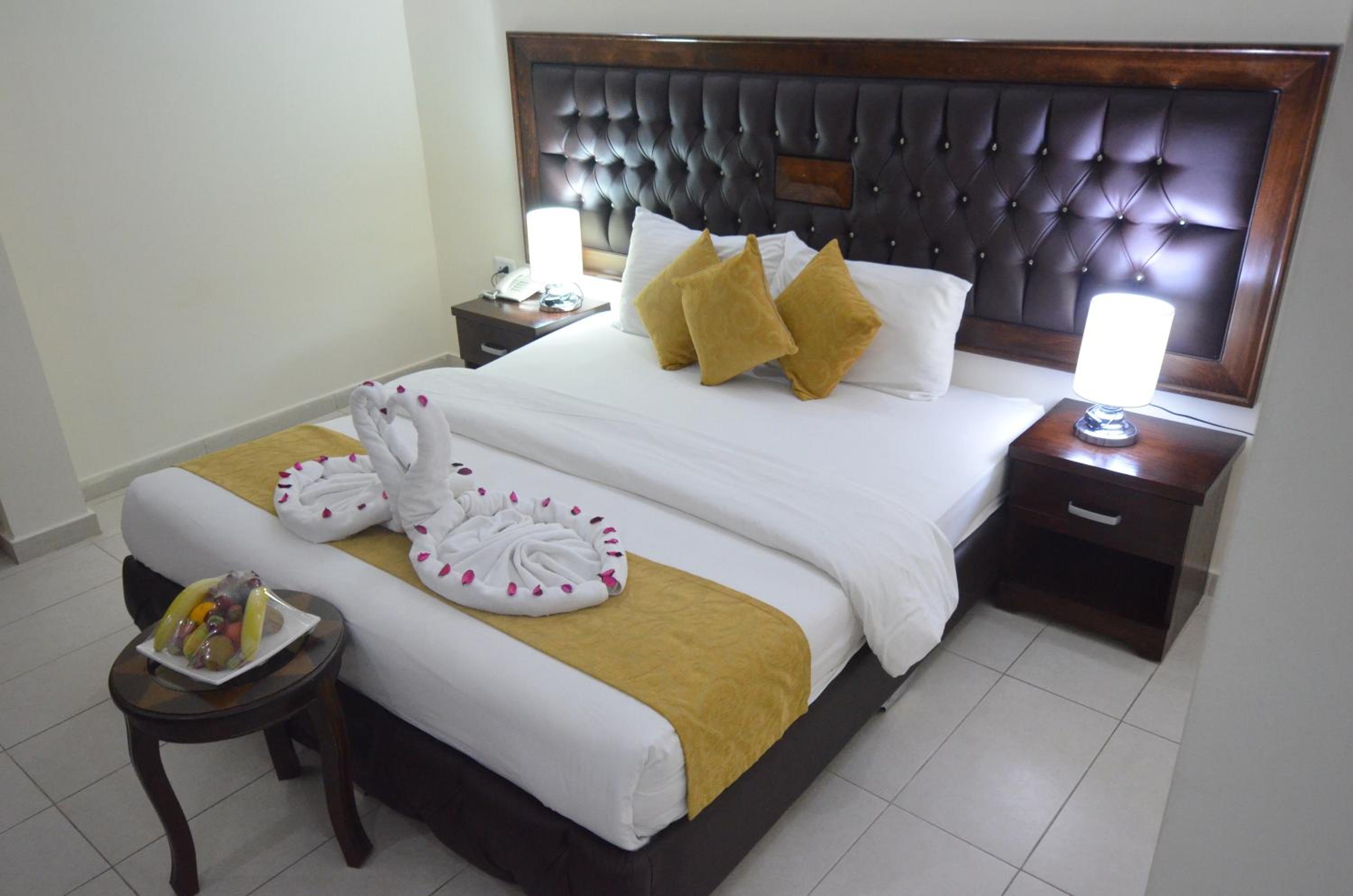 Sharah Mountains Hotel offers air-conditioned rooms with modern interiors, flat-screen TVs, and en suite bathrooms with free toiletries. The bright linens and whitewashed walls provide a cozy atmosphere for guests.