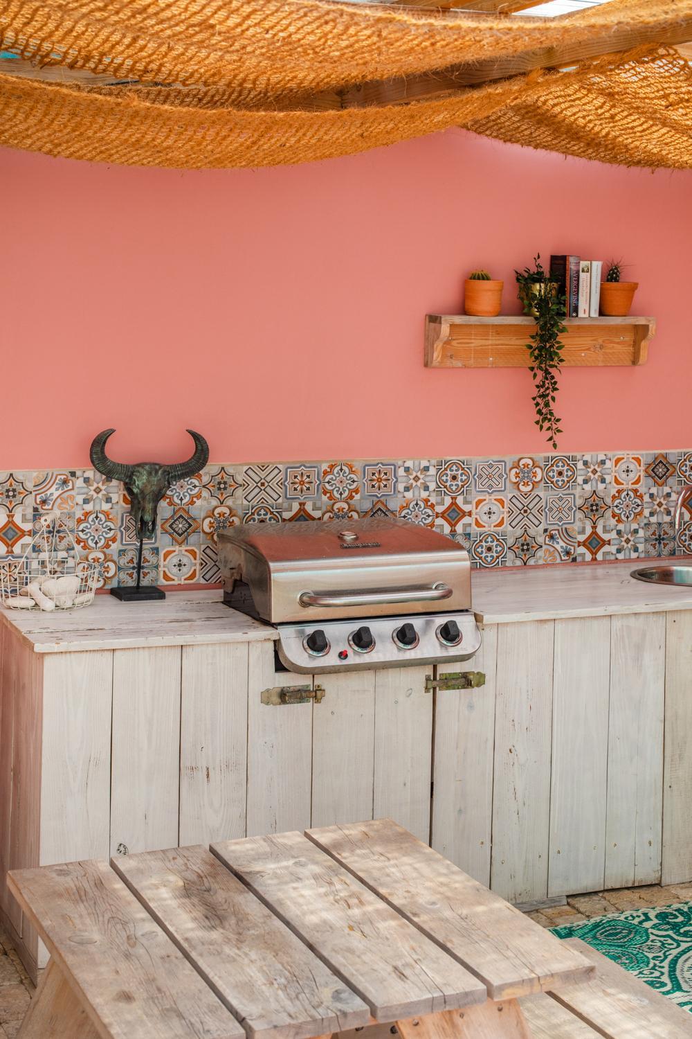 De patio tuin is goed ingericht. Resort like vibe met het dompelbad, lounge chairs en de palmbomen en planten in de tuin.