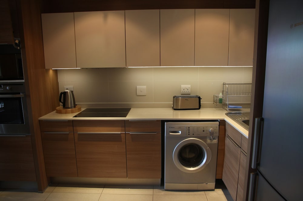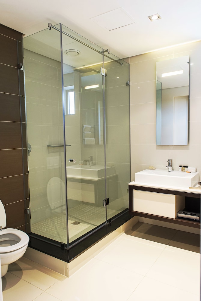 Average accommodation in a good area. Apartment definitely needs some TLC. Wall cabinet was hanging off the wall. Dirty walls and front door looked like it had been through some tough times. Great shower though. Room size was great too. Bedding felt like it needed replacing. Cigarette butt on the floor outside the elevator. Not the fault of the management, but not nice to see something like this. The rate was low so that’s probably why it’s not a premium accommodation. It’s a pity as the location is excellent and it’s next to the Marriott hotel. We stayed one night before going to airport. Okay for something like that.