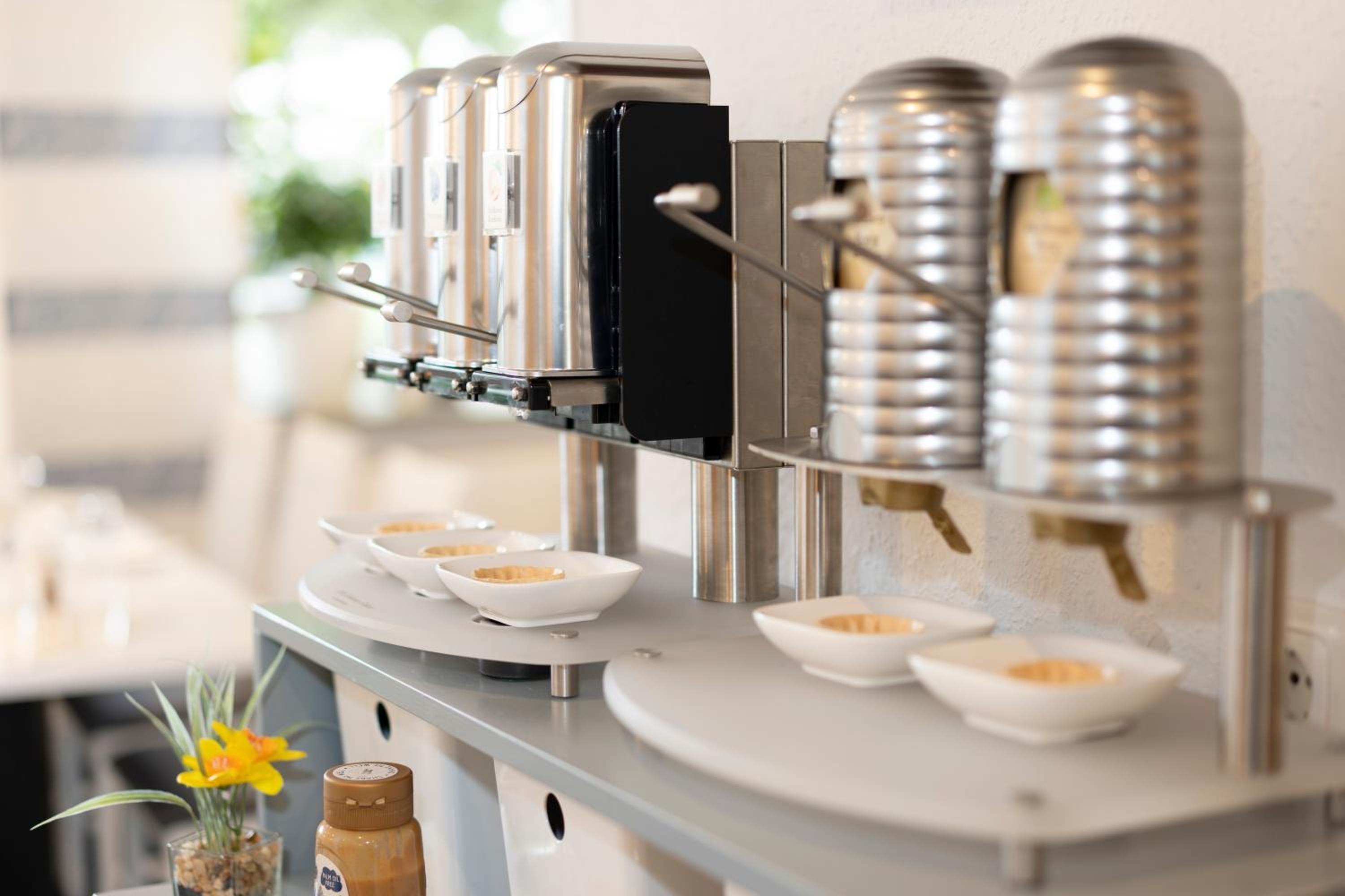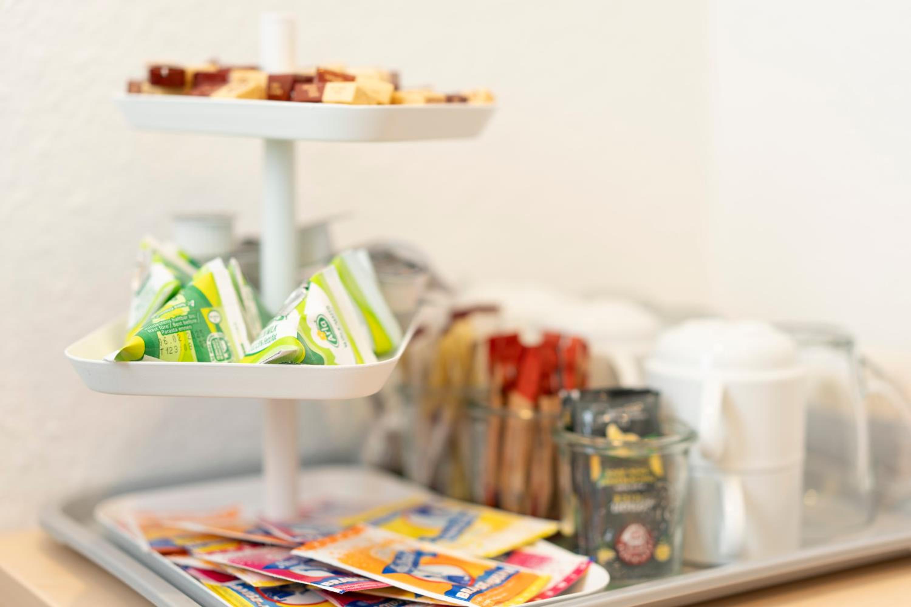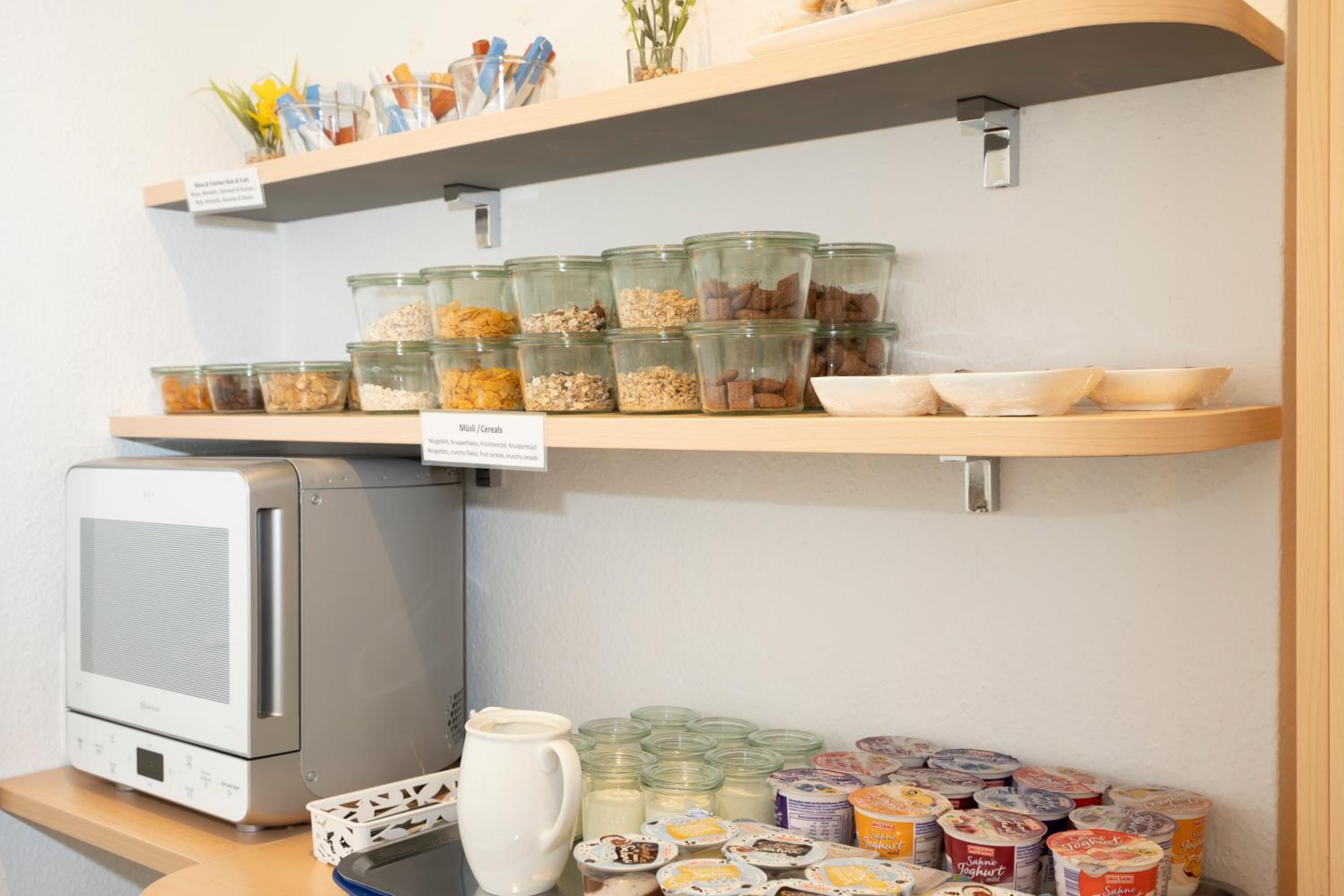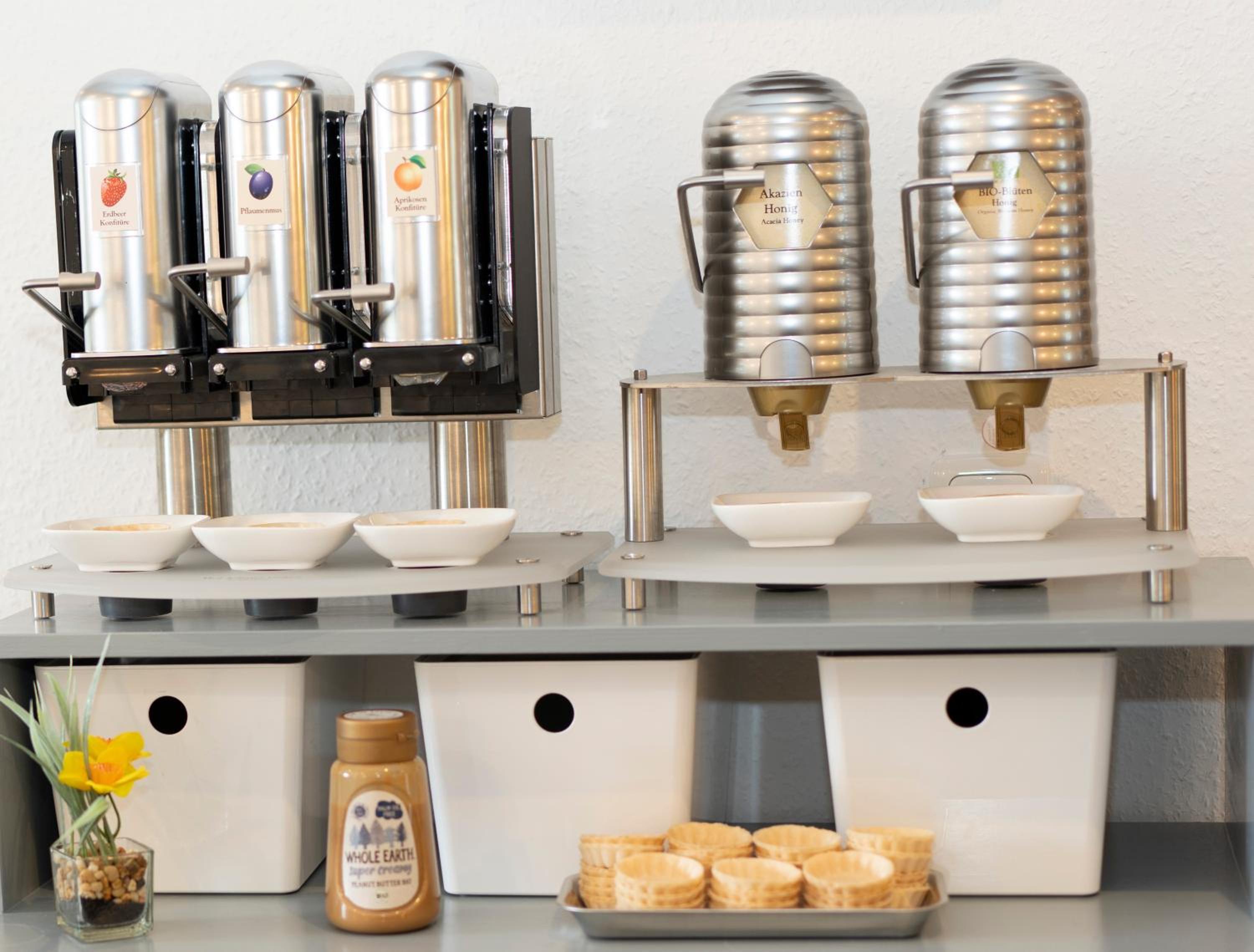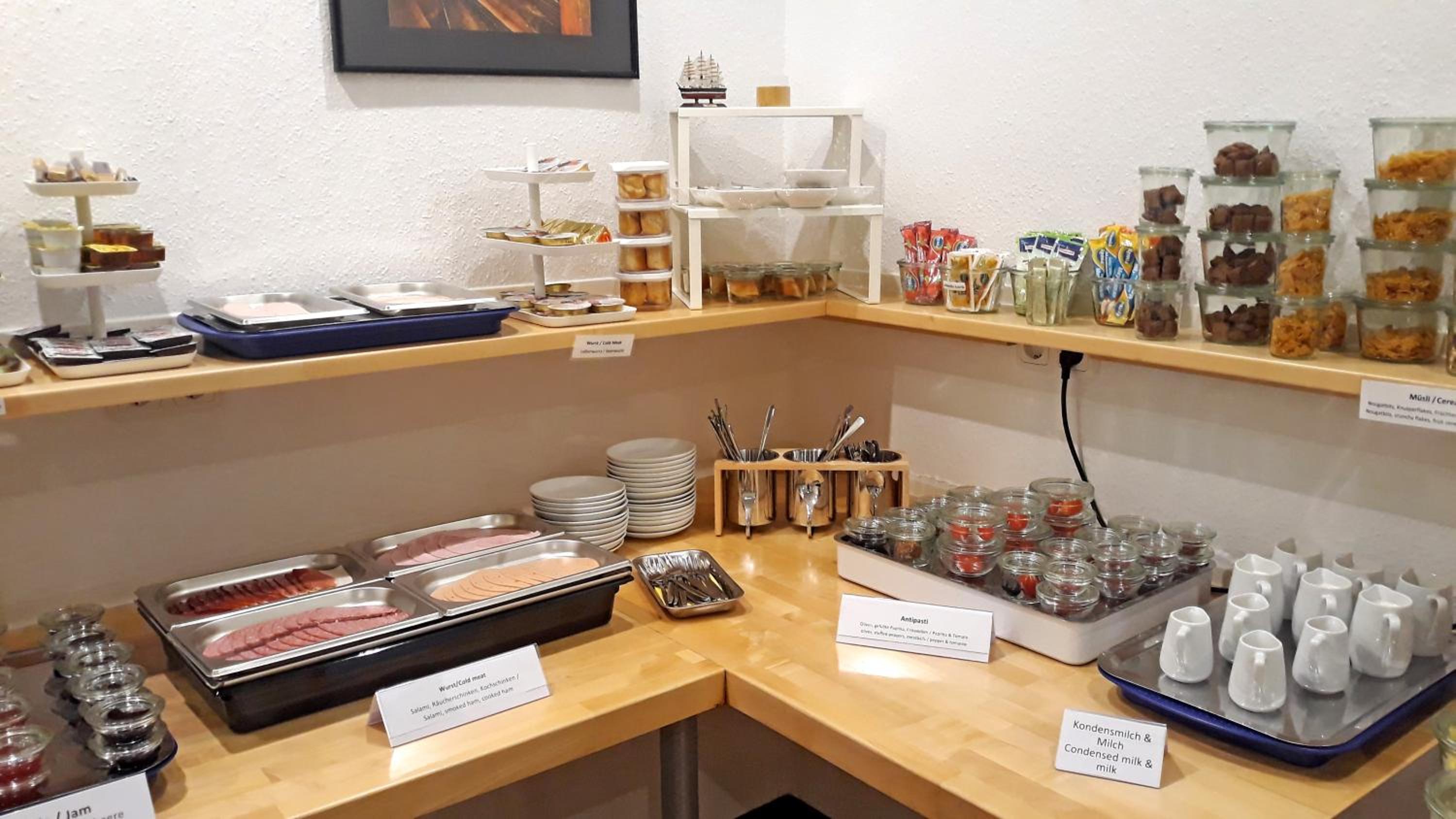 Das Frühstück war lecker und sehr umfangreich. Die Brötchen waren frisch und es gibt einen Kaffeevollautomaten. Zusätzlich bekommt man Kaffeepulver, Teebeutel, Zucker und Milch und Brauspulver an der Rezeption und gegenüber des Fahrstuhls. Ein Wasserkocher befindet sich auf den Zimmern.