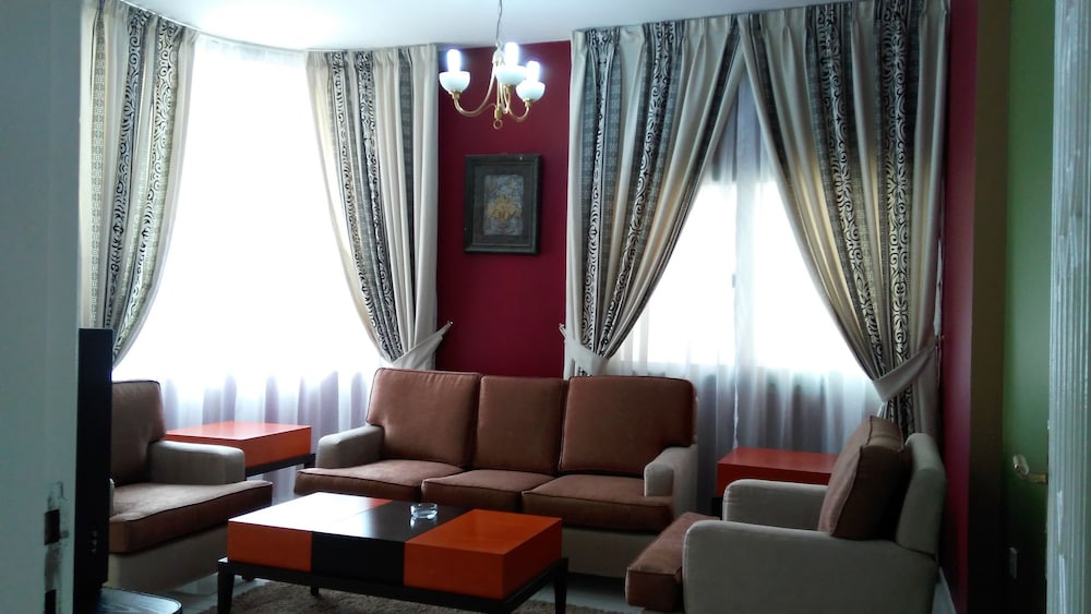 The hotel was in a very good location, close to dubai and near the heart of sharjah. The service was ok, but the parking lot very small for a 10+ floor hotel it's not even paved. There was no swimming pool filled with water and worse it was located in a restaraunt near the breakfast area. The size of the room was great 2 bedrooms a living room and kitchen but it was horribly outdated. The furniture was old in the living room. The tv was from the 90's and barely working like its 2014 you can buy a cheap HDTV for 100$. The kitchen was almost useless it was so outdated the cabinets inside we're rusted completely. The beds we're comfortable but again the furniture old and outdated a ceiling lamp covering missing in each room. The bathroom was old I'm not even going to explain that. For 800 dirhams or 214$ per night it was definitely not worth it they just used the high season to raise prices this hotel was worth around 80$ per night for me but the location was great