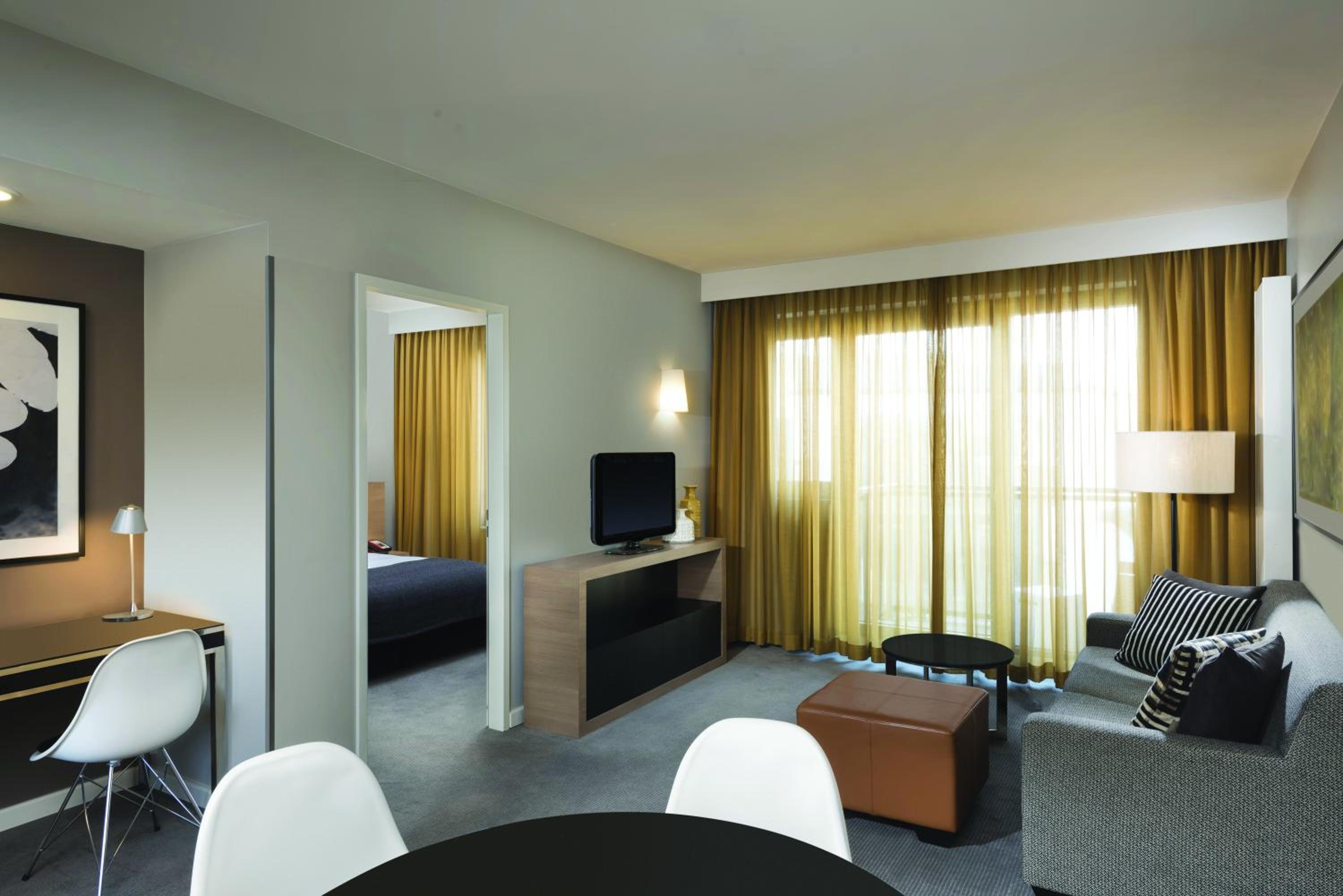 Indulge in our complimentary heated indoor pool, sauna, and gym during your stay. Each non-smoking studio apartment boasts a separate lounge and dining area, air conditioning, and a flat-screen TV for your comfort and entertainment.