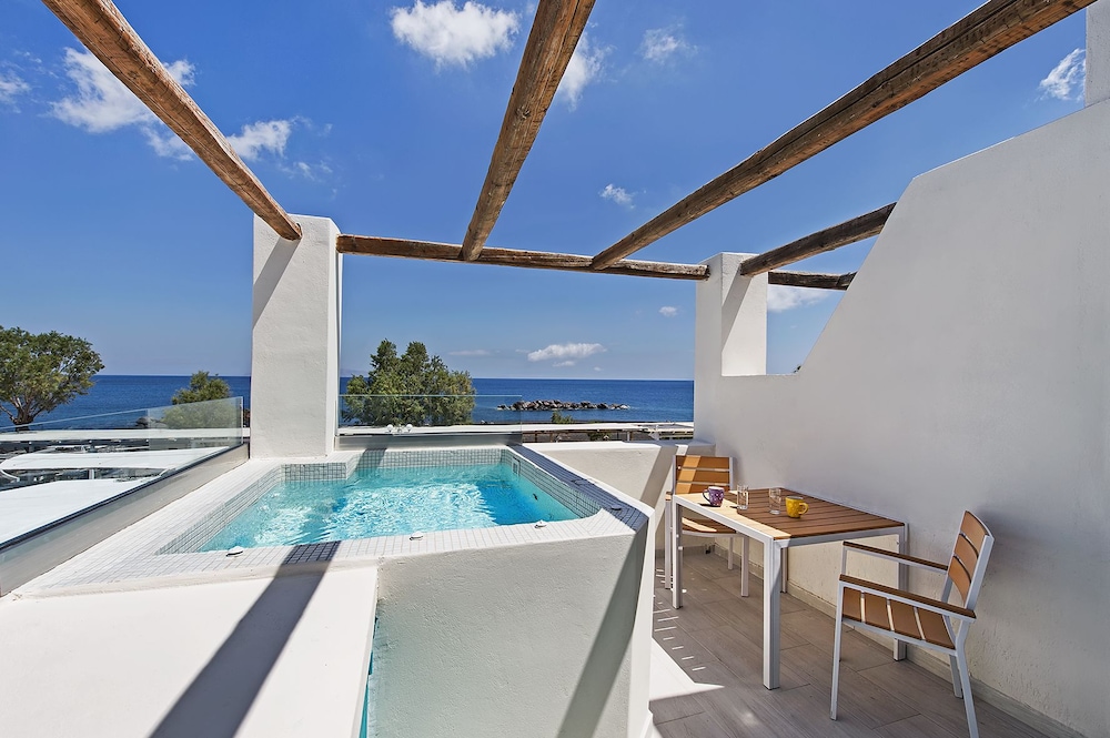 Unwind on our private beach just steps away from Kamari Beach, where turquoise waters beckon for a refreshing swim or a tranquil stroll along the shore.