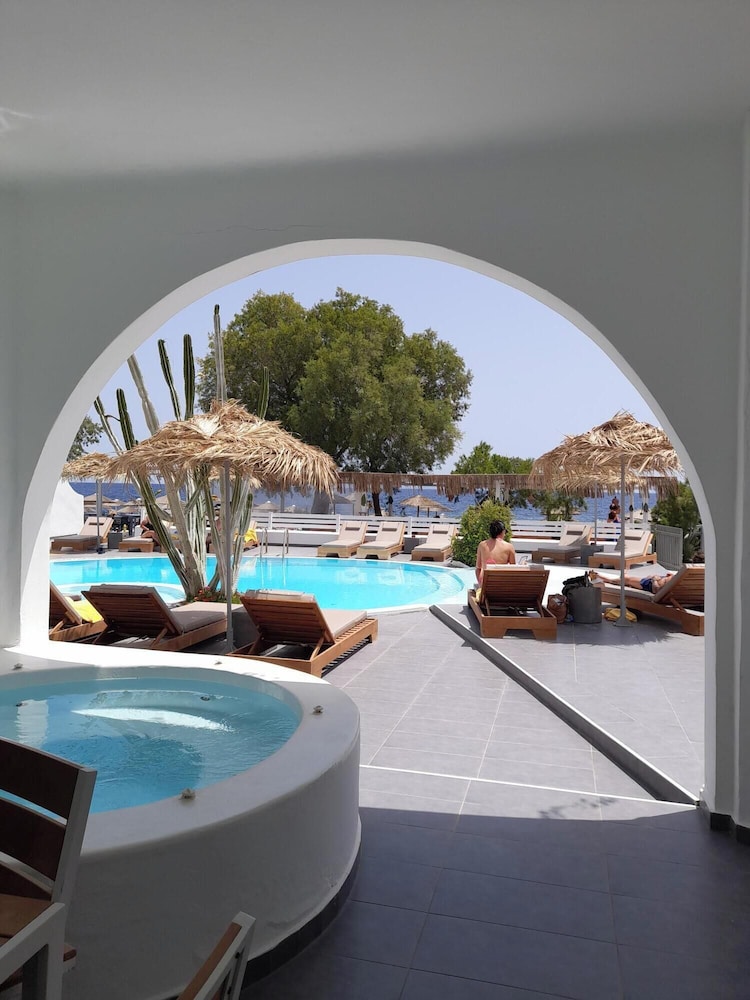 We loved staying in Kamari. The beach was very nice with chairs and shade provided. The staff took great care of us. Kostas was very kind. Breakfast was provided every morning. Plenty of options from fruit to eggs and crêpes. We loved the relaxed feel of Kamari compared to Oia! Public transportation was a 5 minute walk. It was very easy to use although usually running a few minutes behind. We much preferred Fira for dinner and sunset rather than Oia. Taxis are expensive.