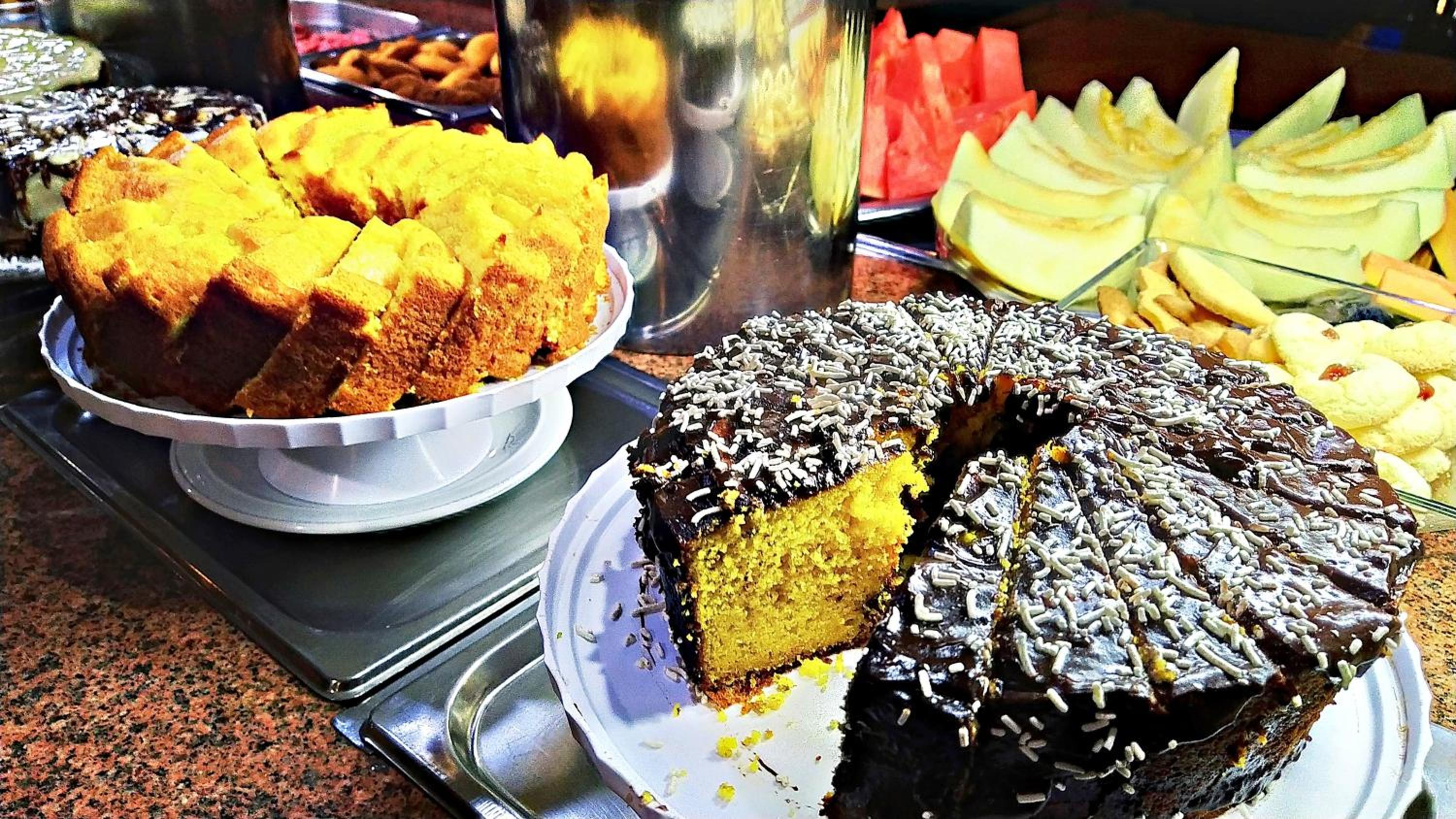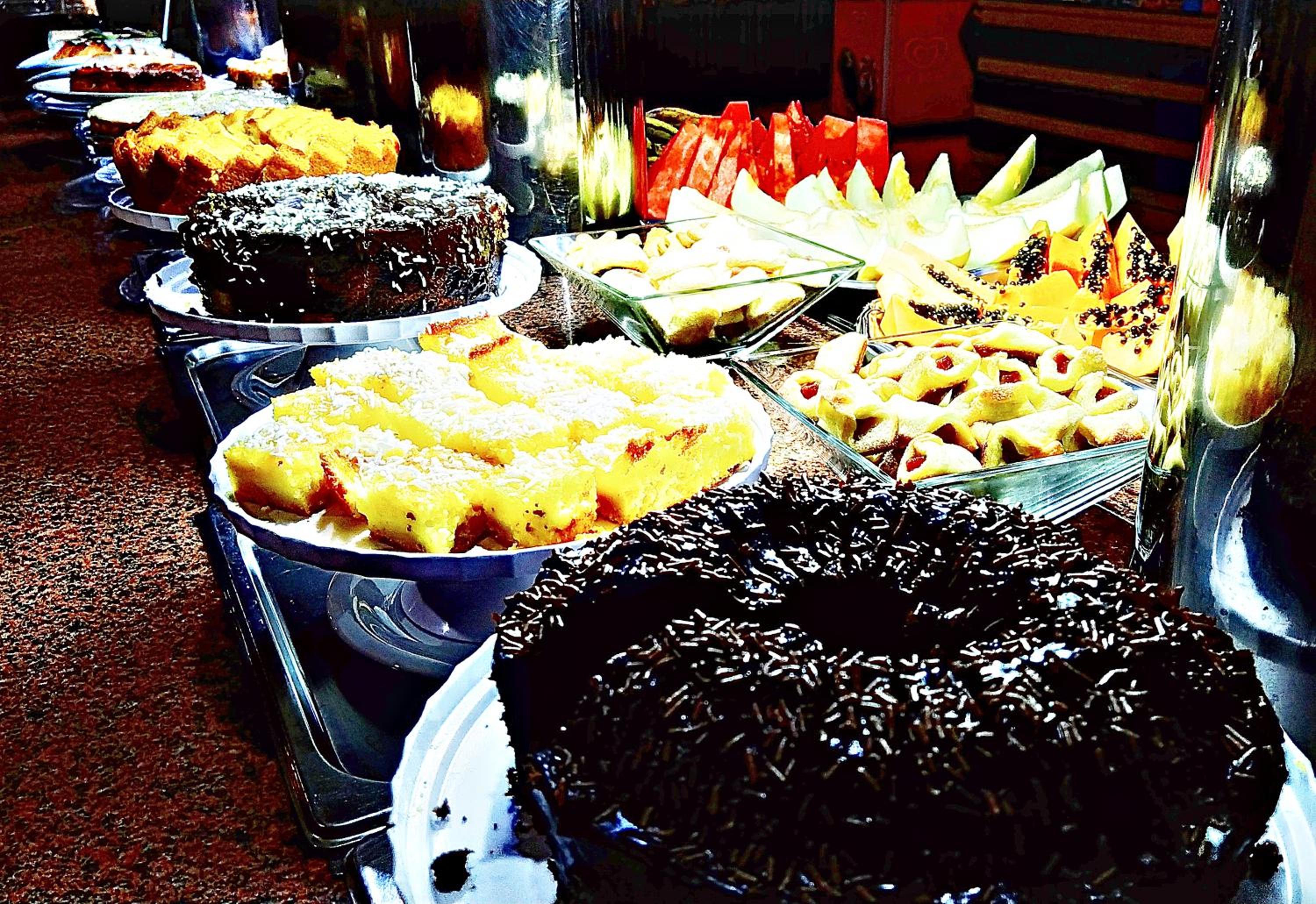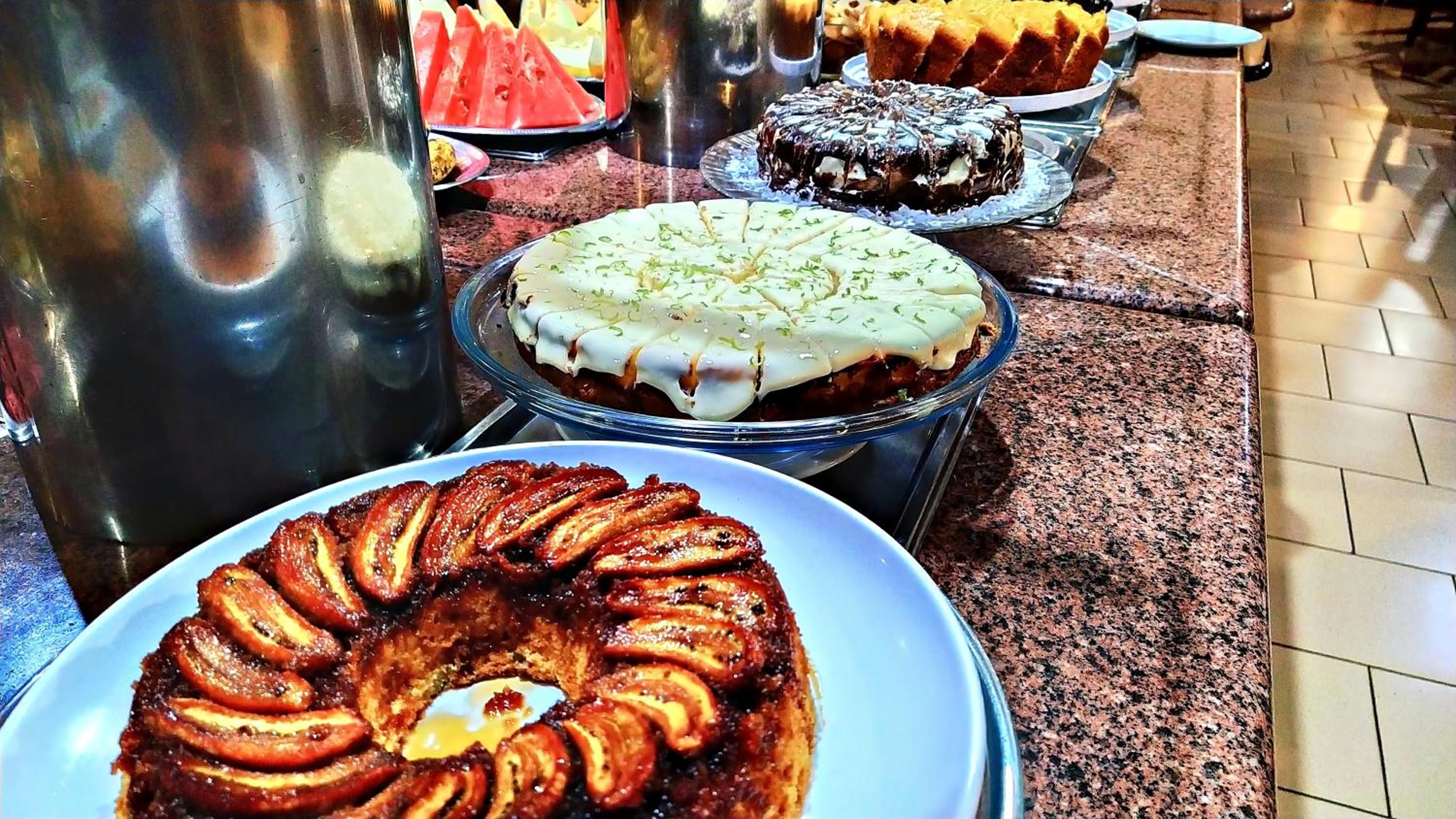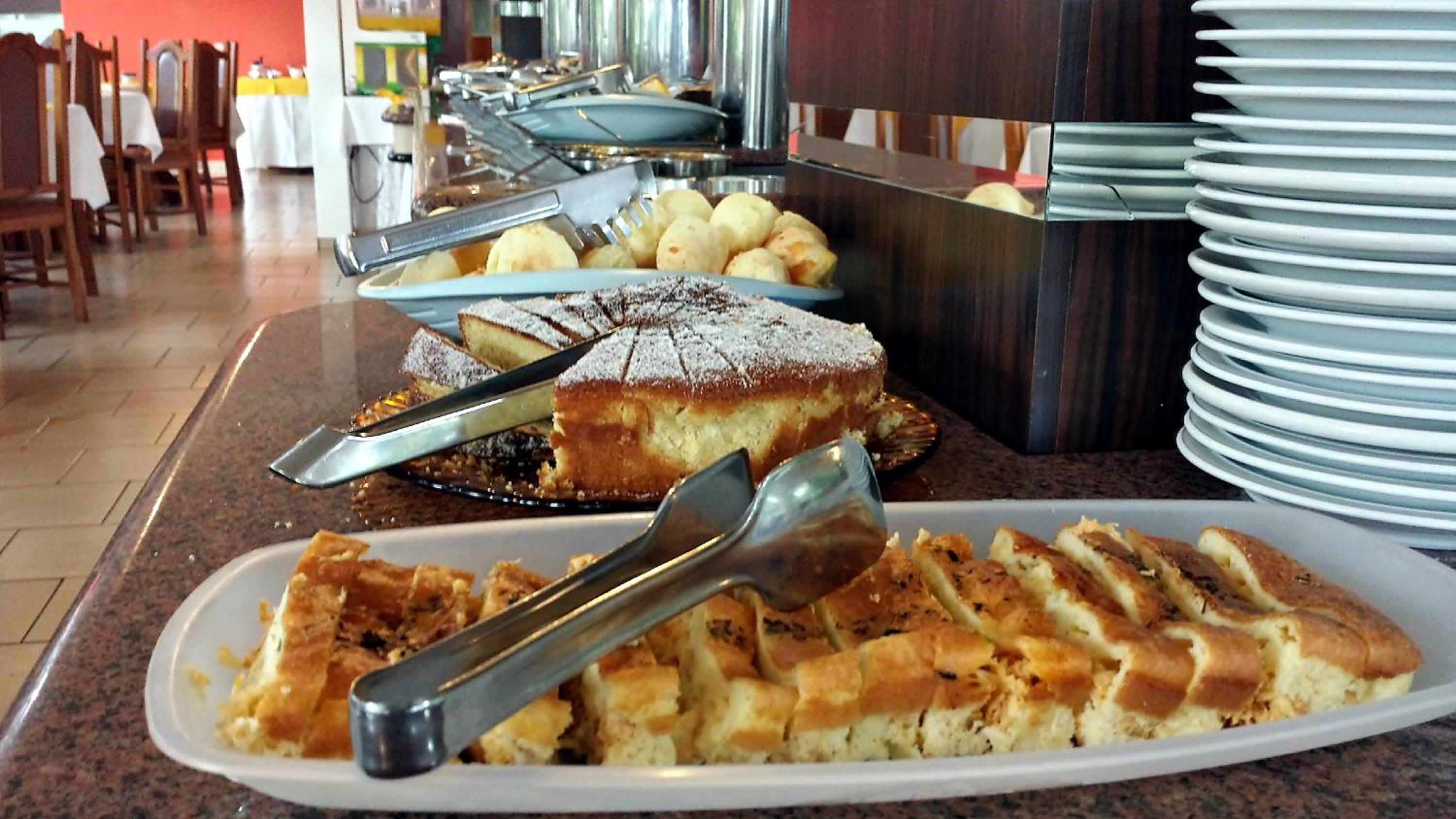 O café da manhã bem completo, com alguns tipos de salgado e bolos, sucos, café e leite. O ponto negativo do café, é que repete muito durante os dias que estivemos lá. Oferece algumas opções sem gluten.