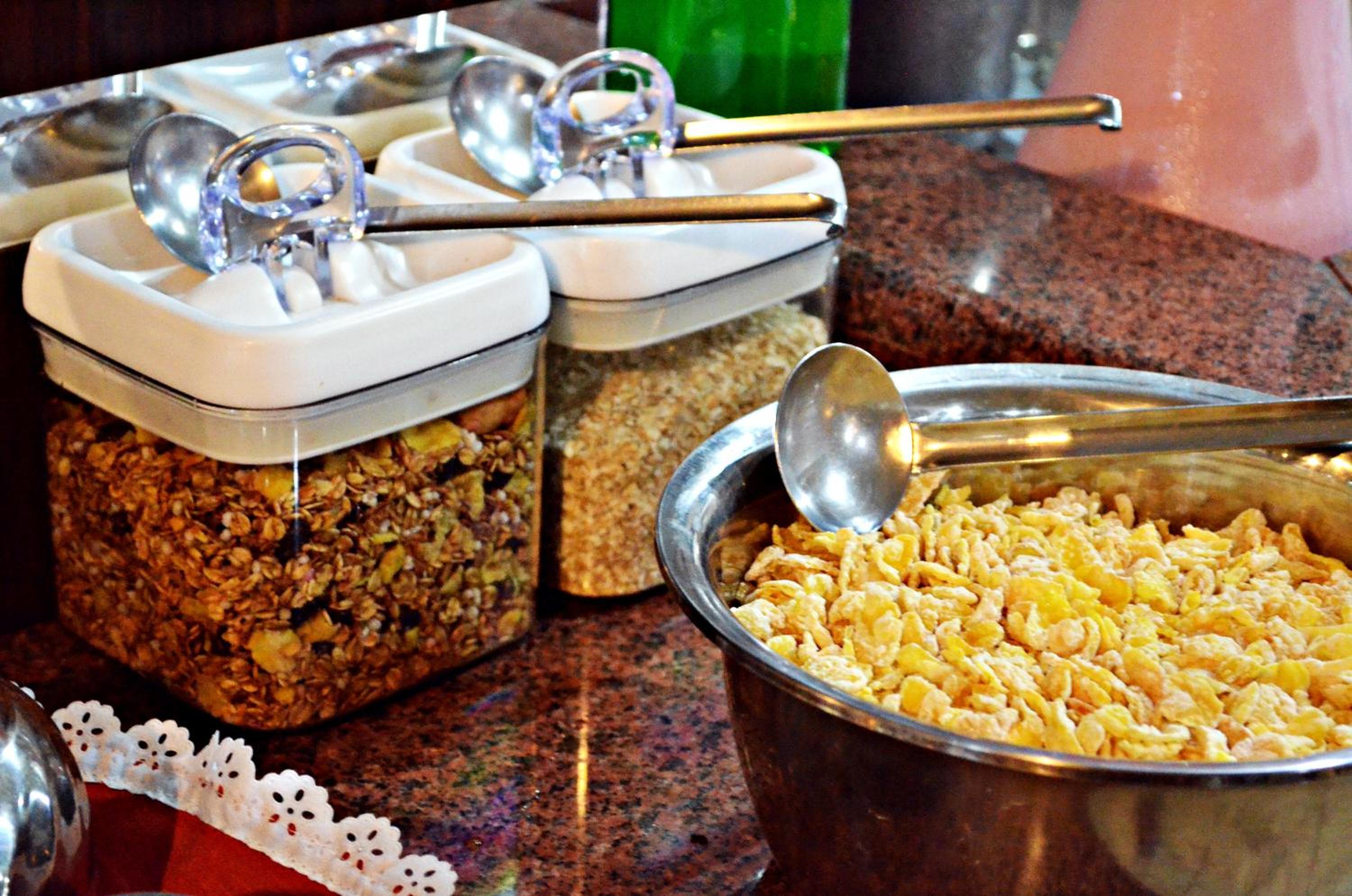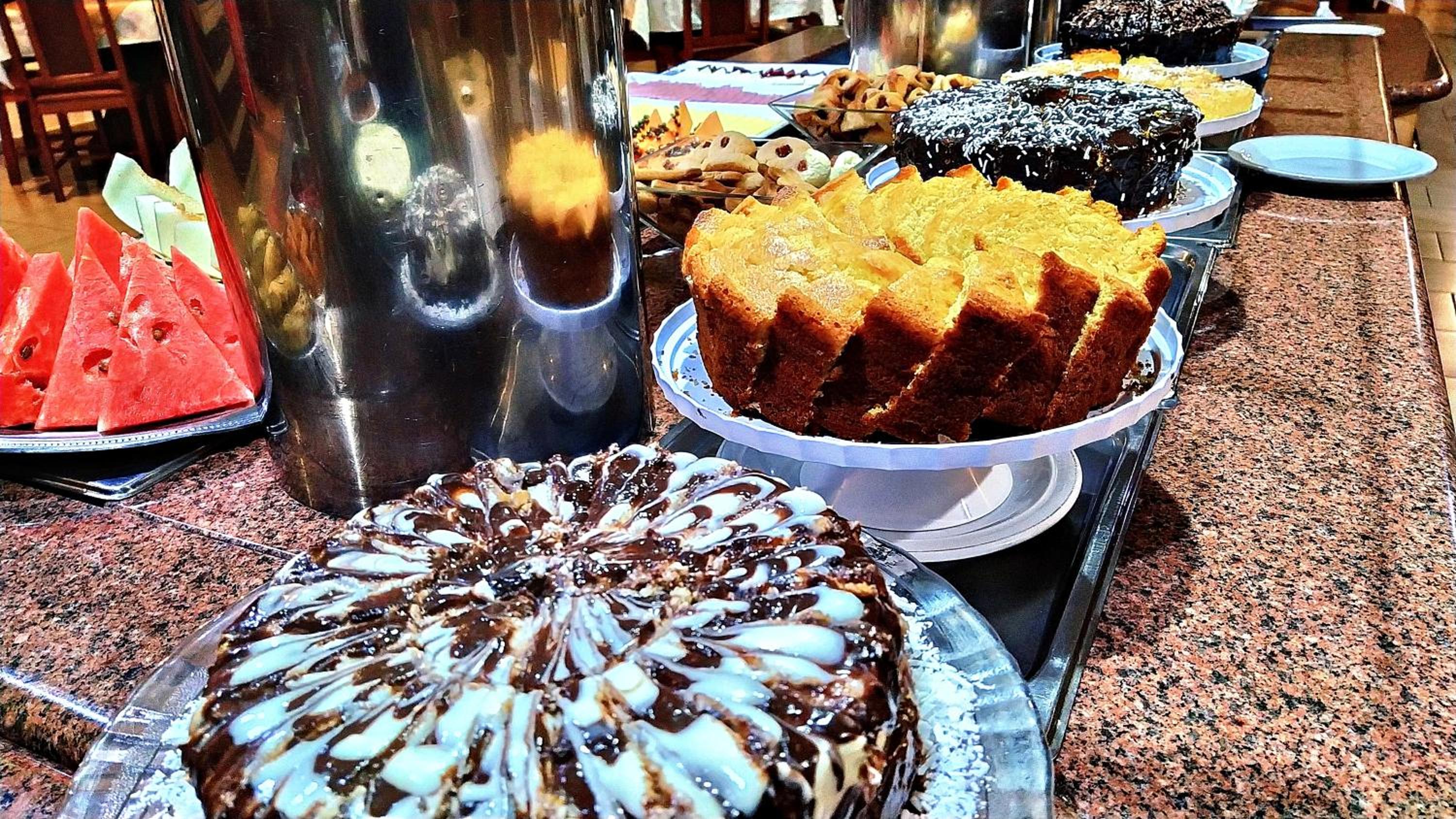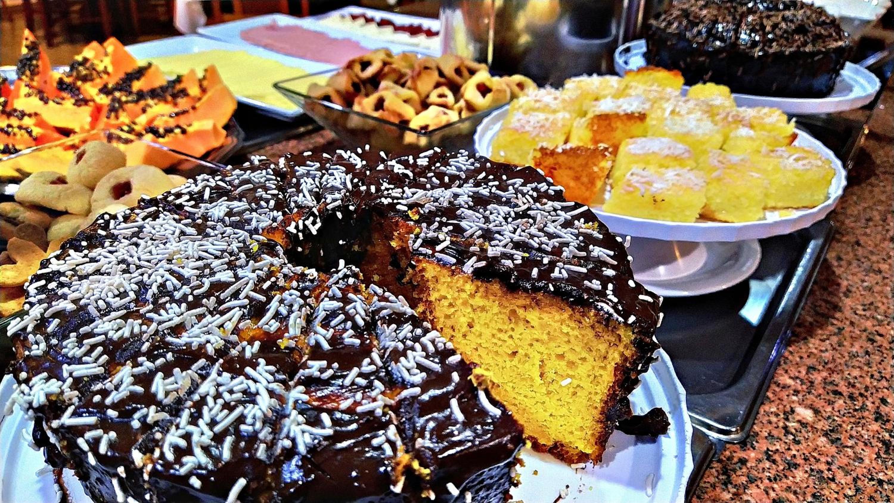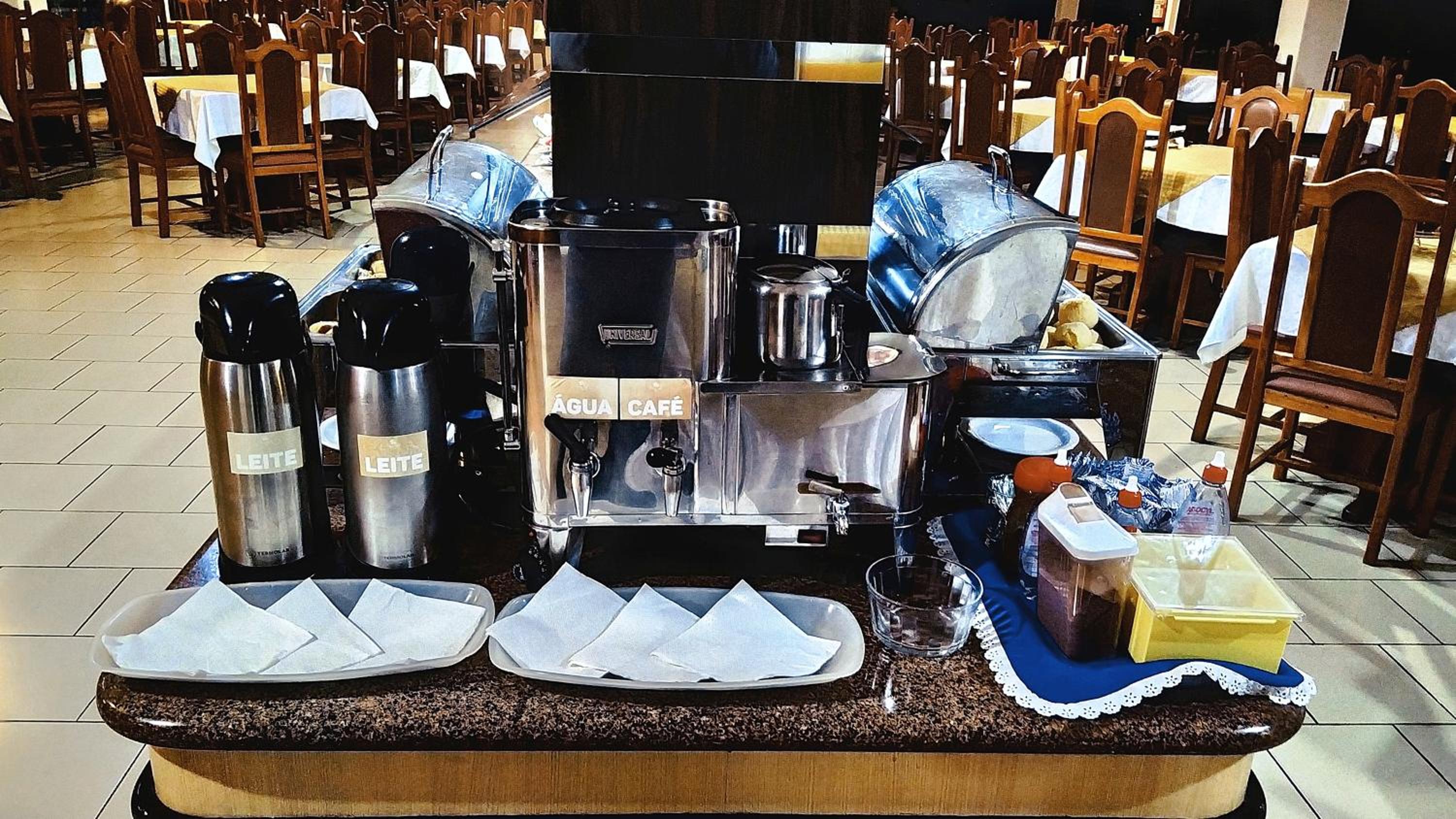 O café da manhã bem completo, com alguns tipos de salgado e bolos, sucos, café e leite. O ponto negativo do café, é que repete muito durante os dias que estivemos lá. Oferece algumas opções sem gluten.
