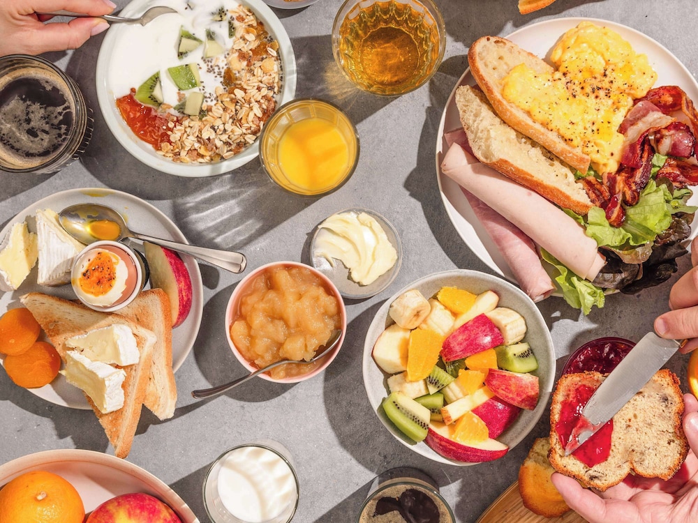 Le buffet du petit déjeuner est très complet avec du chaud (œufs brouillés, durs, ratatouille, bacon, petites crêpes), du froid (fromages, crudités, jambon blanc et poulet) en plus de céréales, pains variés, viennoiseries, fruits frais, laitages, option VG, confitures, café, thé Palais des thés et jus fruits.