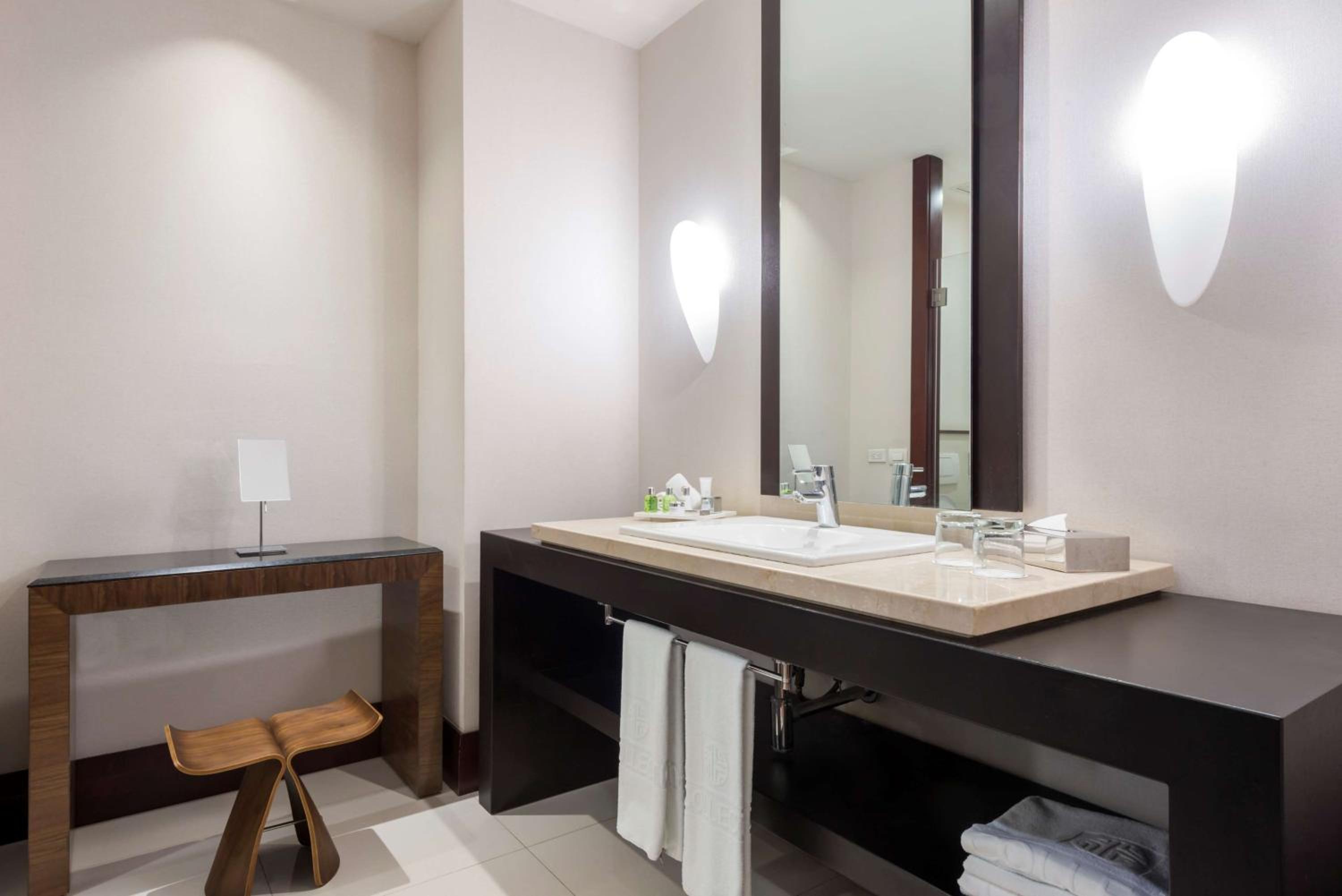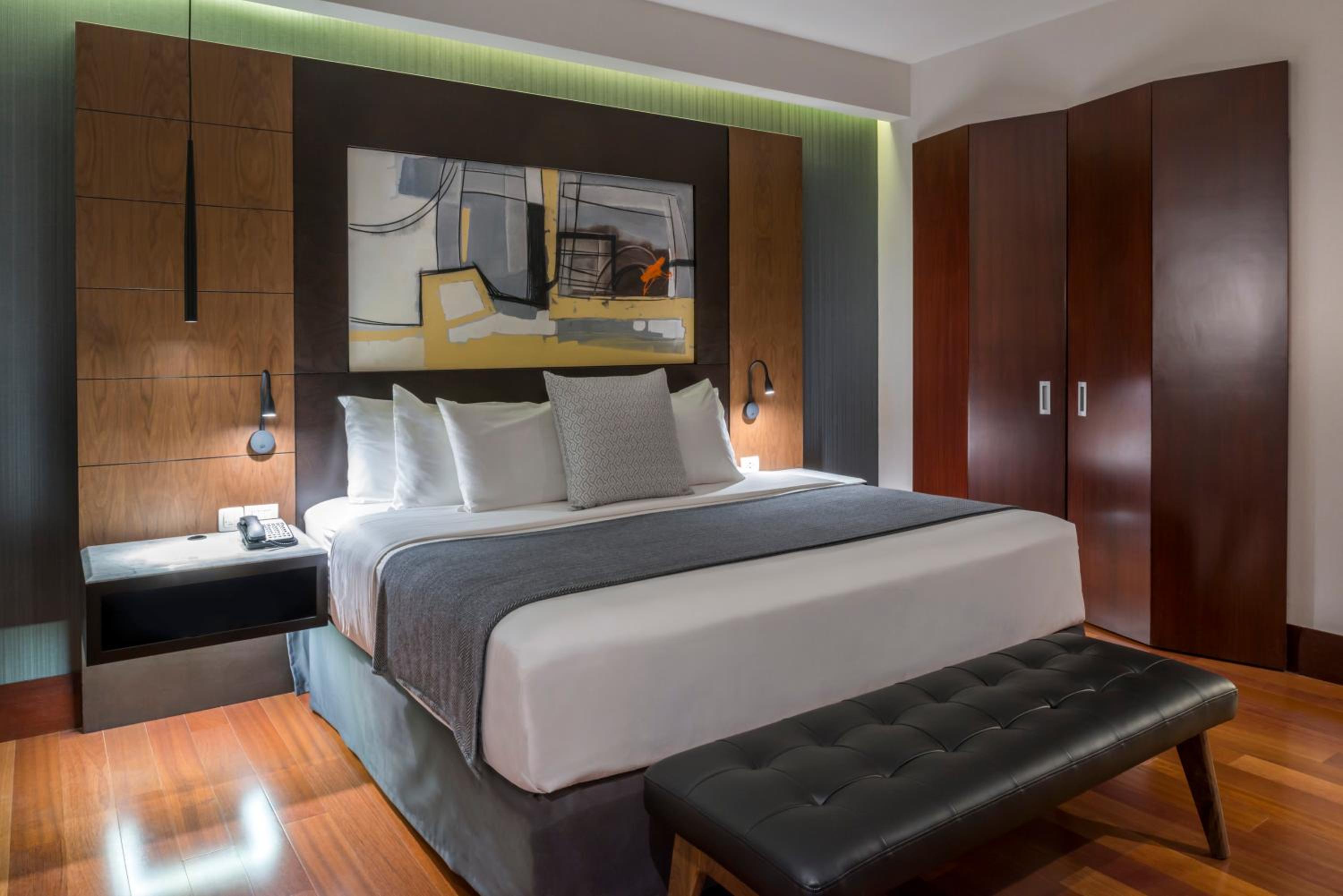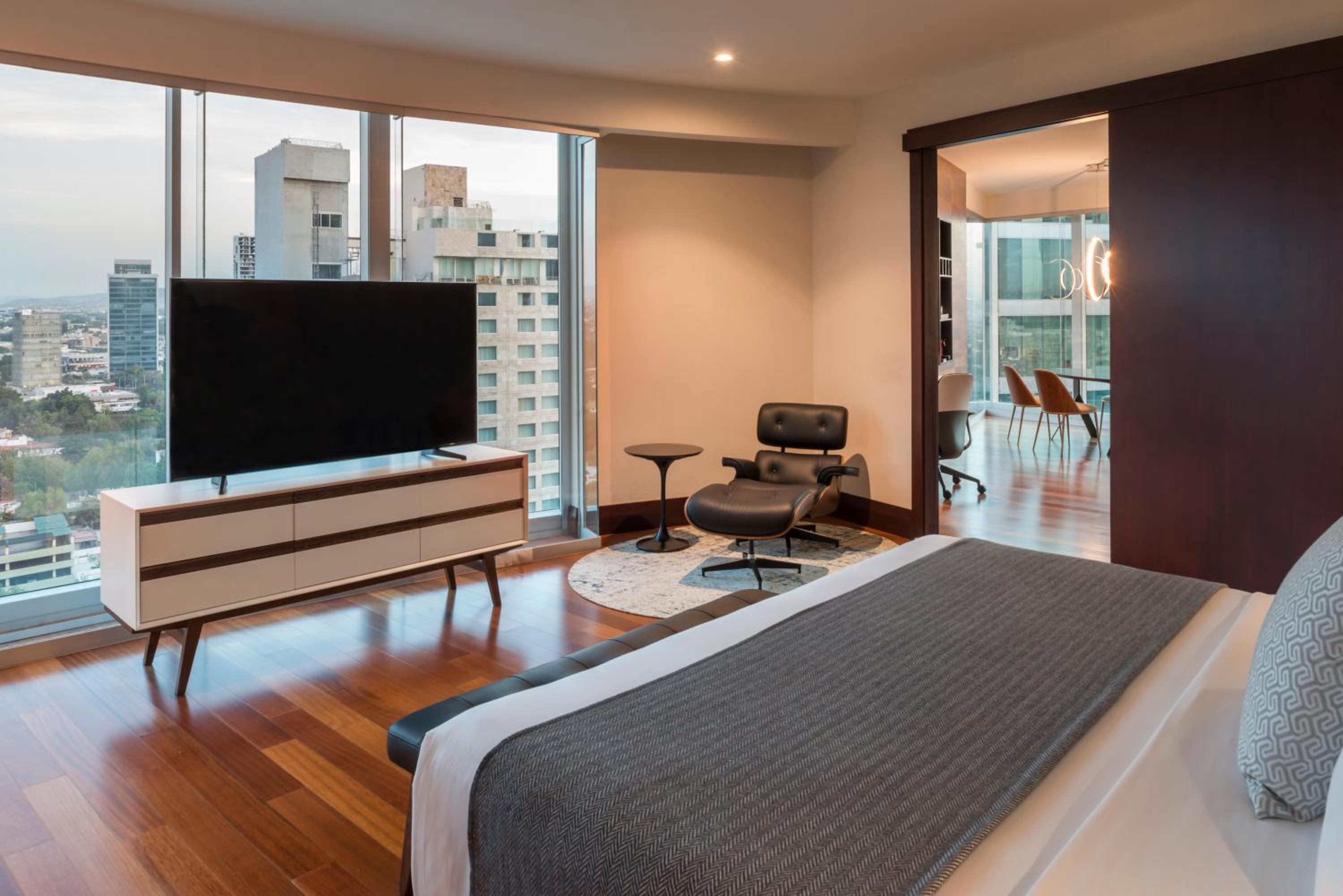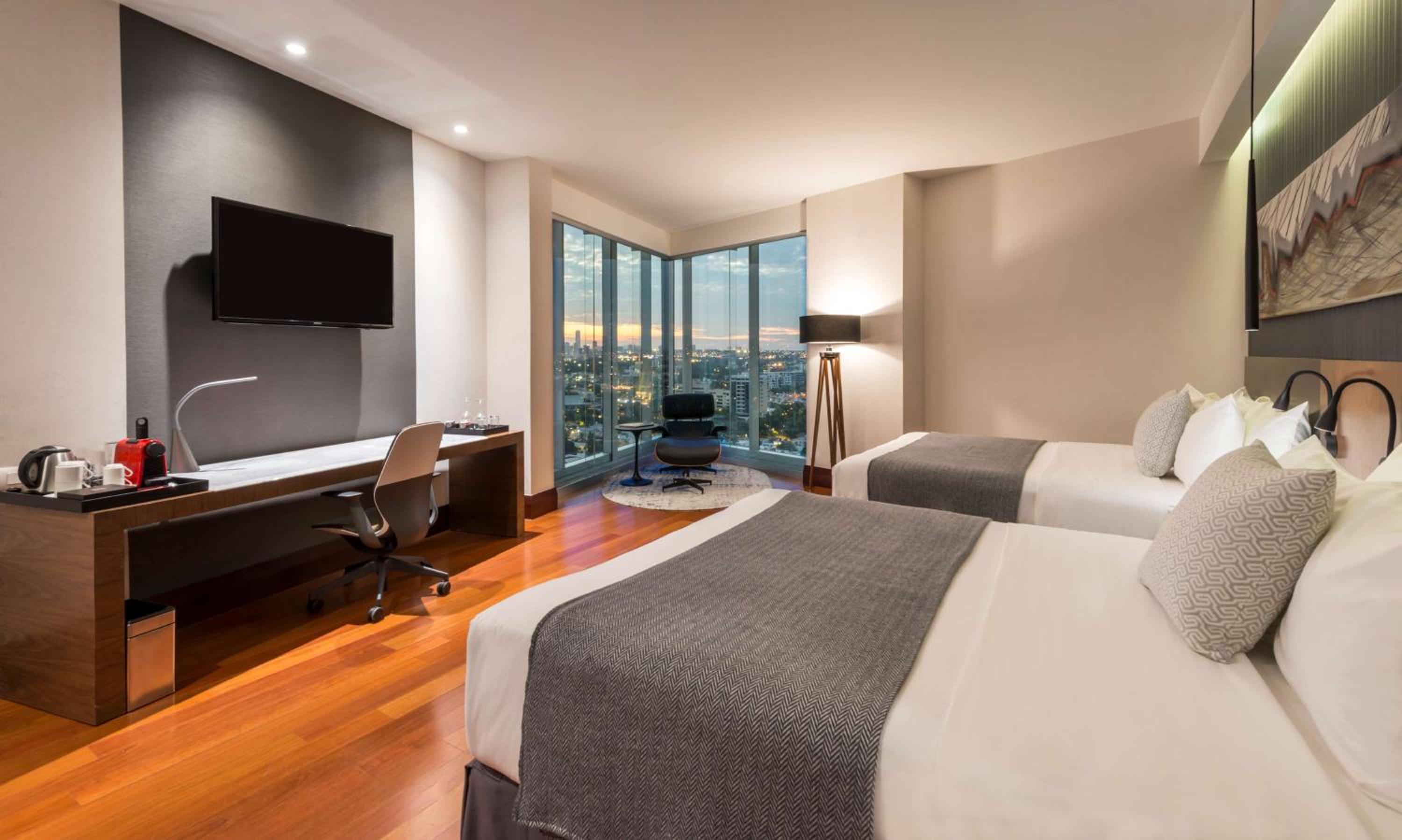 Relax in the hotel's contemporary rooms adorned in soothing earthy hues, each providing breathtaking city views. Unwind with amenities like a flat-screen TV, minibar, and a luxurious bathroom.